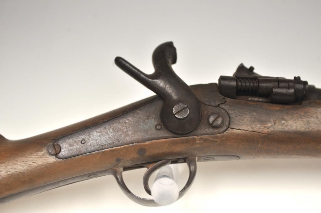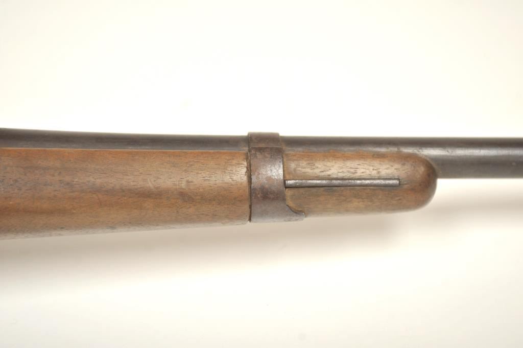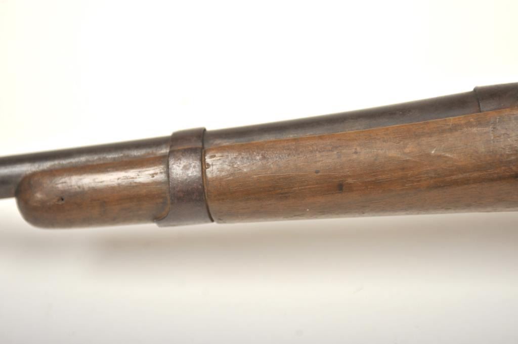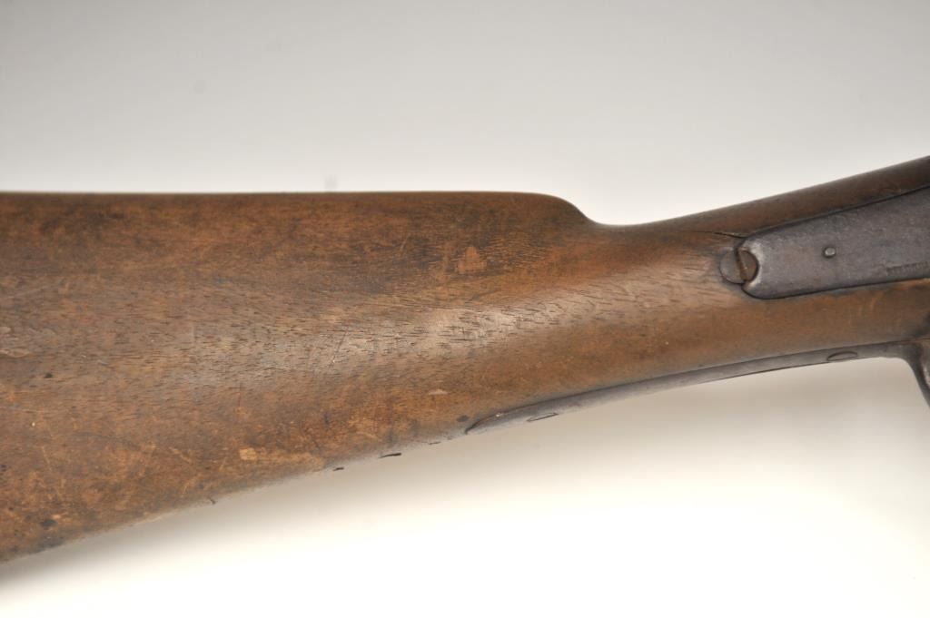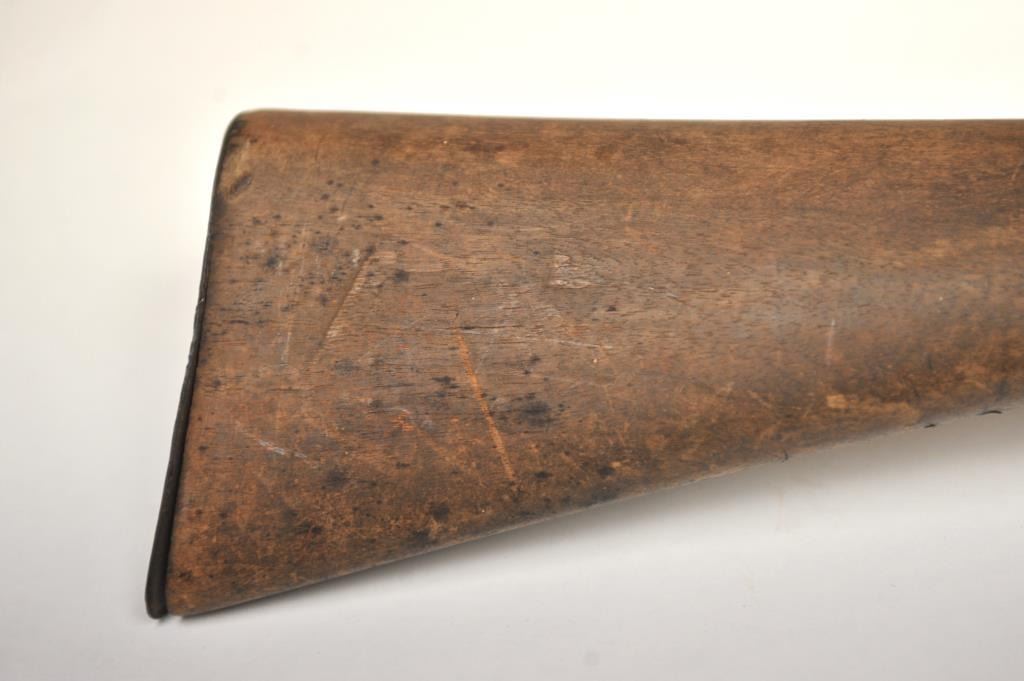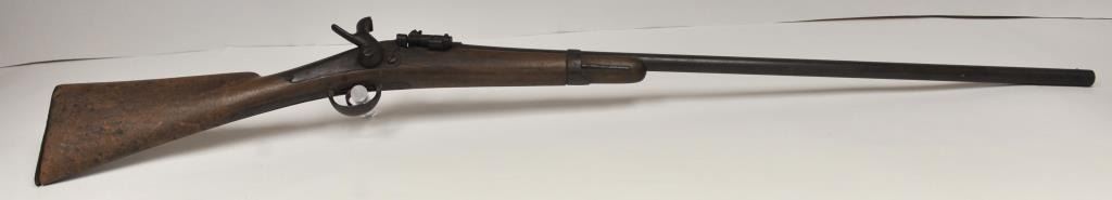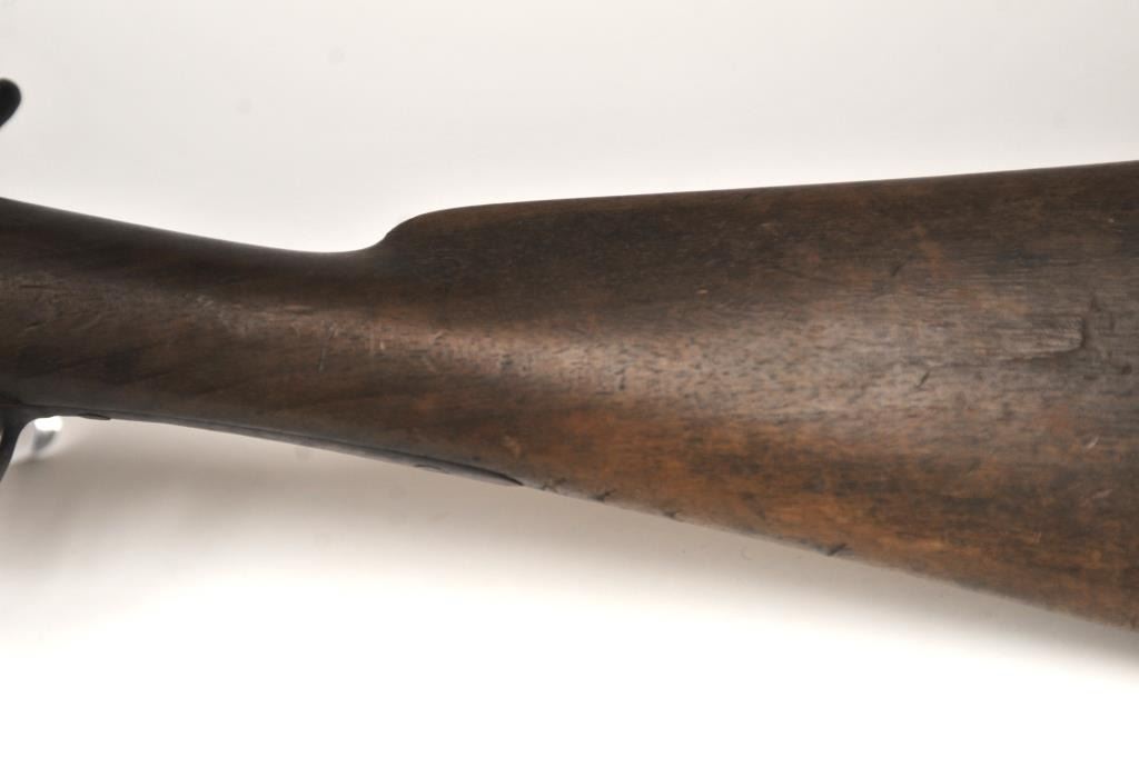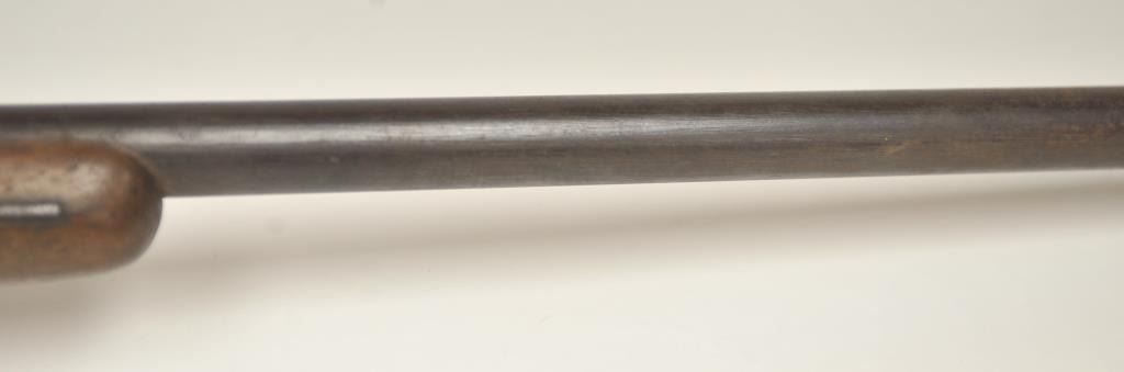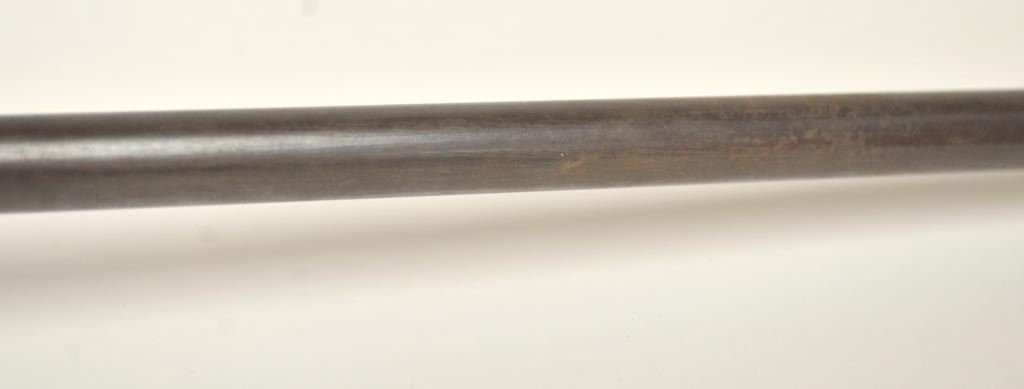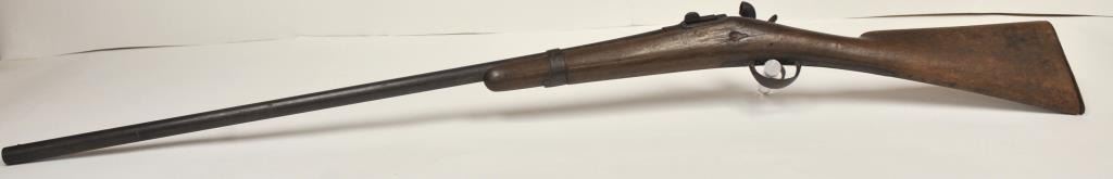 “Belgium” marked 12GA Single Shot sol called Zulu shotgun made for early trade to Africa using military parts. Fair to good condition with dark patina and some rust, erosion and pitting on the metal. The stocks show manysmall compression cracks and fair to poor overall. The action is working but the firing pin has been removed (early gun control measures). (Antique) Est.: $100-$200