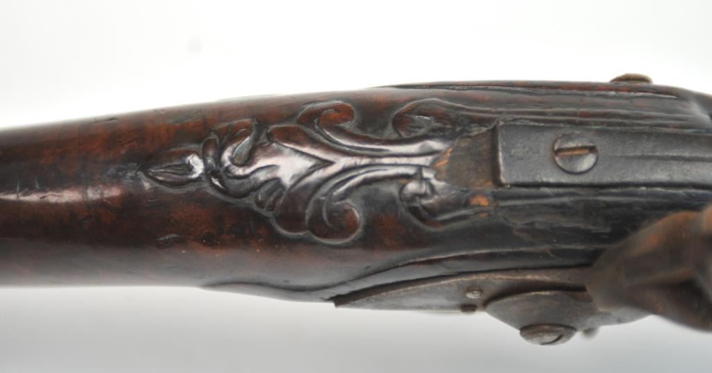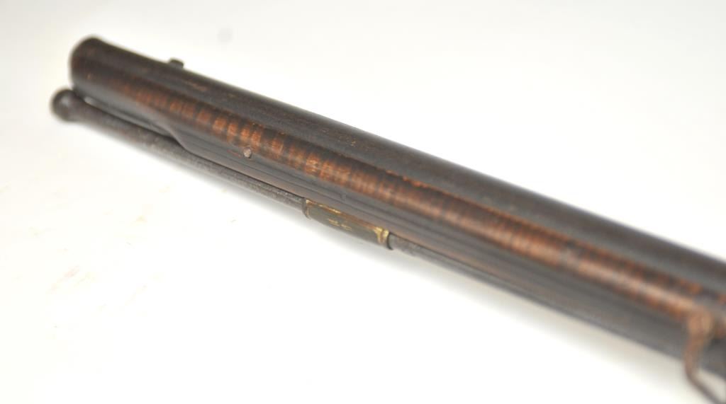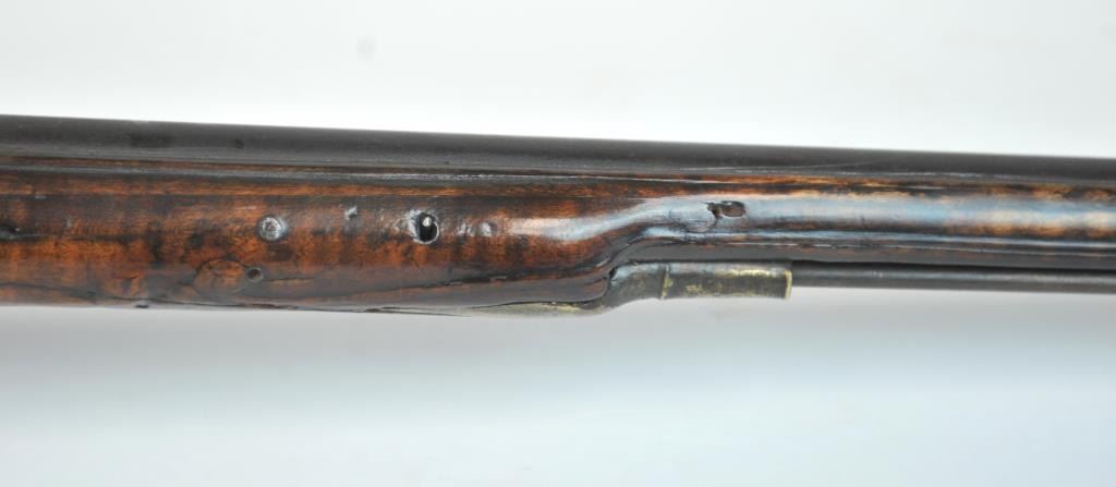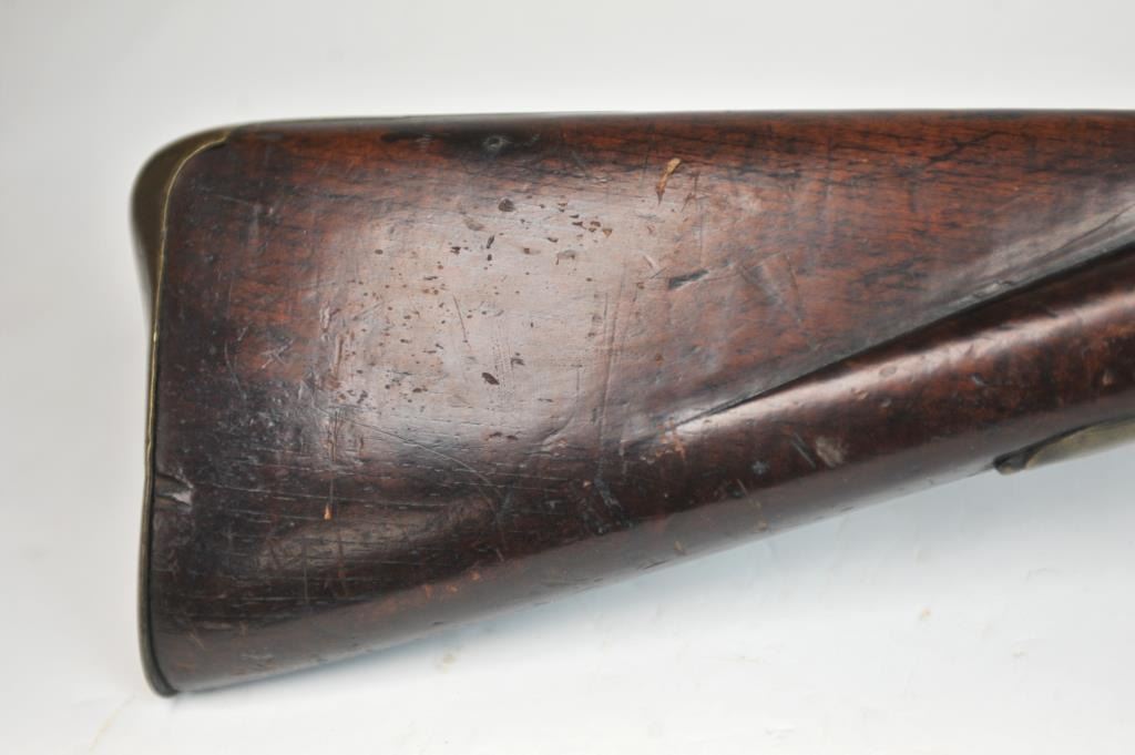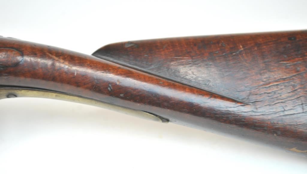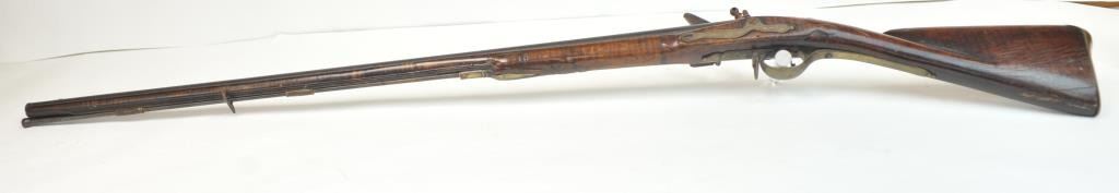 American stocked flintlock fusil with lock signed “Bingham” in script and British proofed barrel. Measures 53” overall with a 37” barrel of approximately .69-.70 caliber smoothbore. British military style brassmounts similar to brown bess with lazy “S” side plate of Revolutionary War era about 1780s. The stocking is typically American with raised floral carving around the tang and molding around the lock and side plate.The wood is naturally striped walnut. The stock has had the entire fore end expertly repaired along with other small repairs that are well done. There are some small losses and the competent restorer left the back endof the stock as he found it (Thank You!) The barrel and lock show a dark almost black patina with all original flintlock parts and action works. Sling swivels retained. Has not been cleaned in 30 plus years and freshrust. (Antique) Est.: $4000-$8000