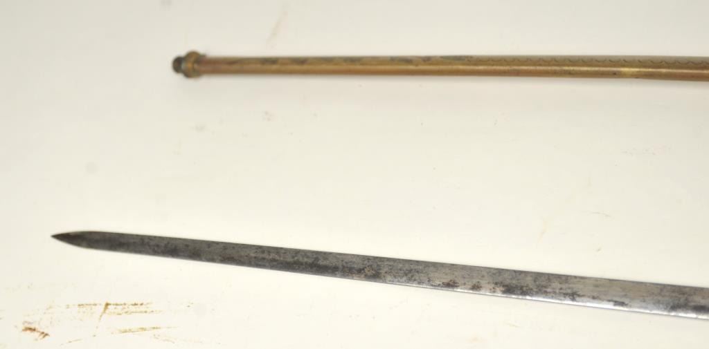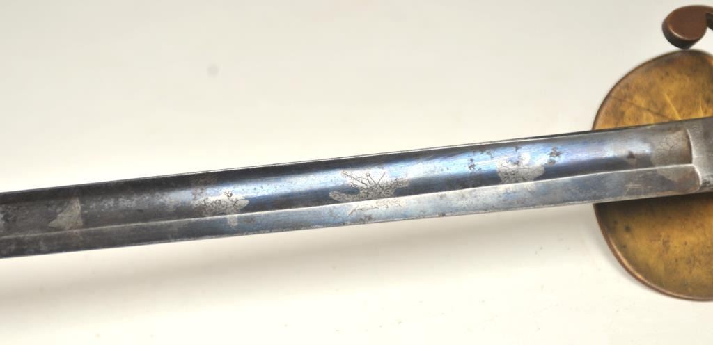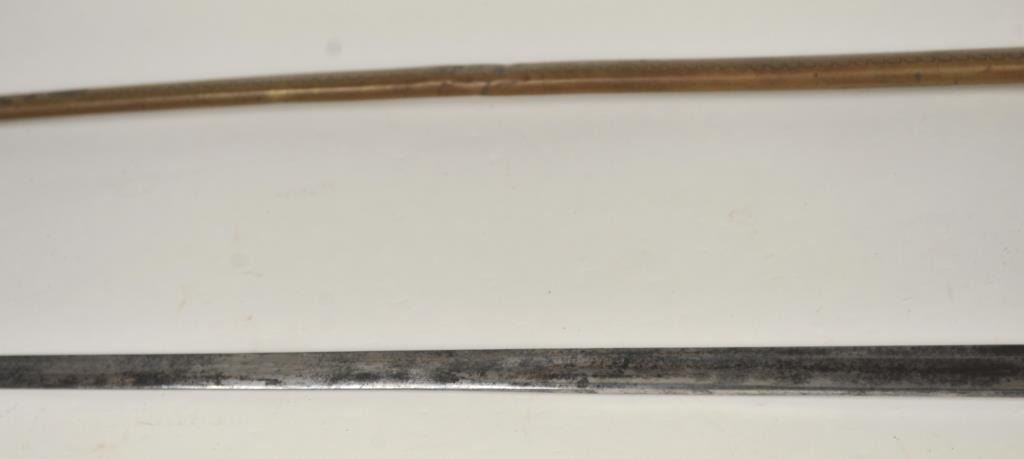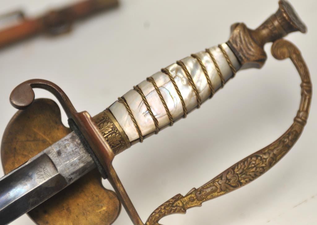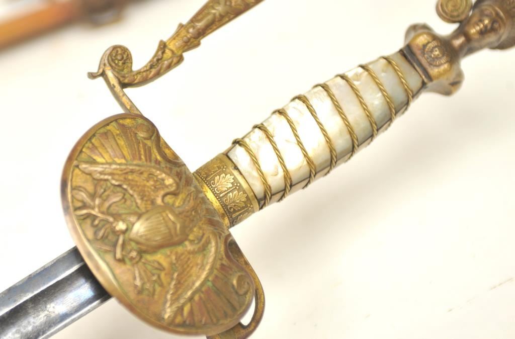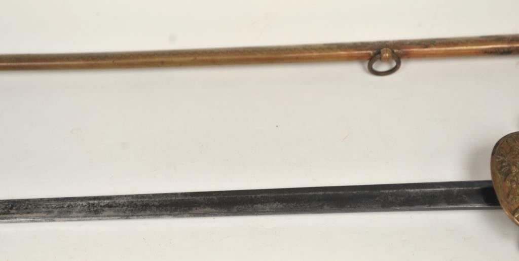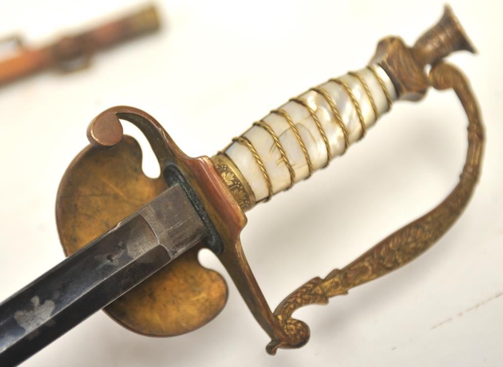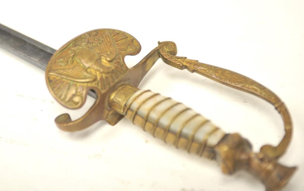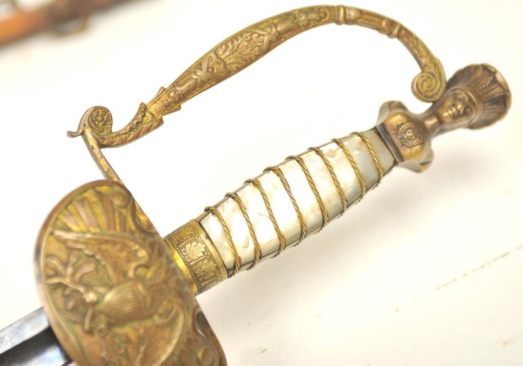 U.S. 1840’s Era Militia Officer’s Sword with Indian head pommel, pearl grip and fancy brass mounts retaining original engraved brass scabbard. The blade shows 50%+ original blue and engraving with some scatterederosion and pitting. Good to very good condition overall with just minor imperfections and normal aging. Est.: $400-$800