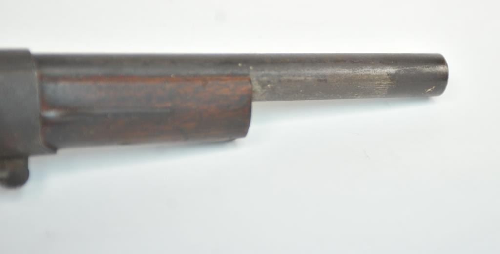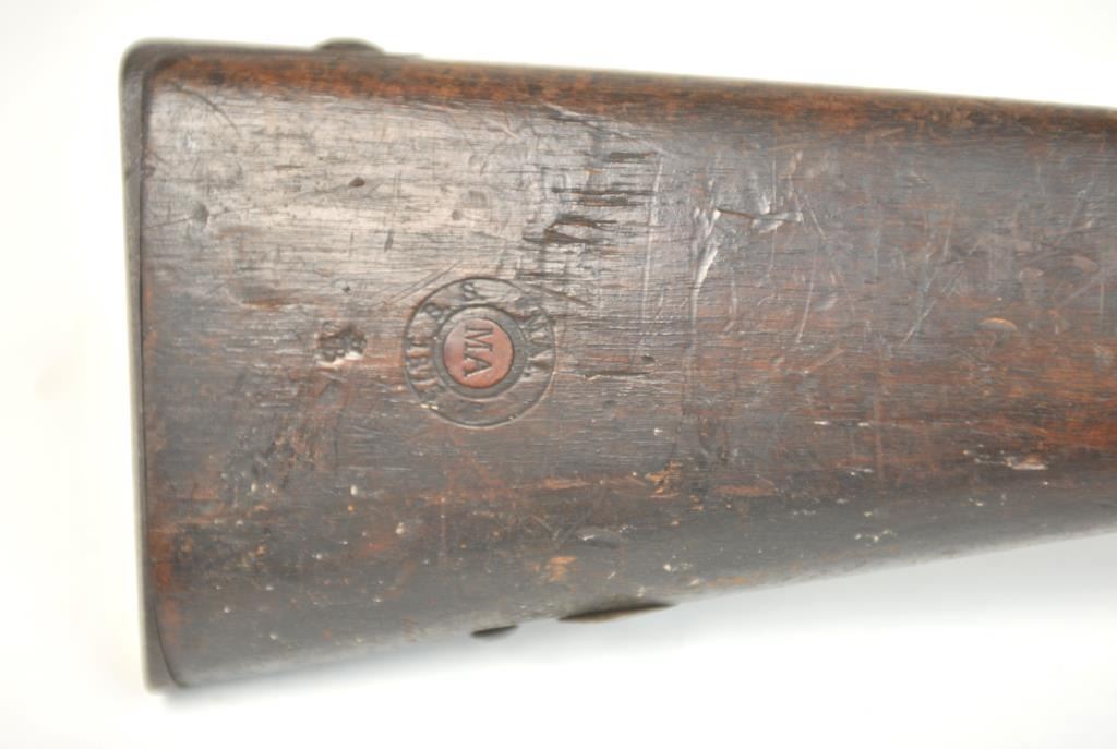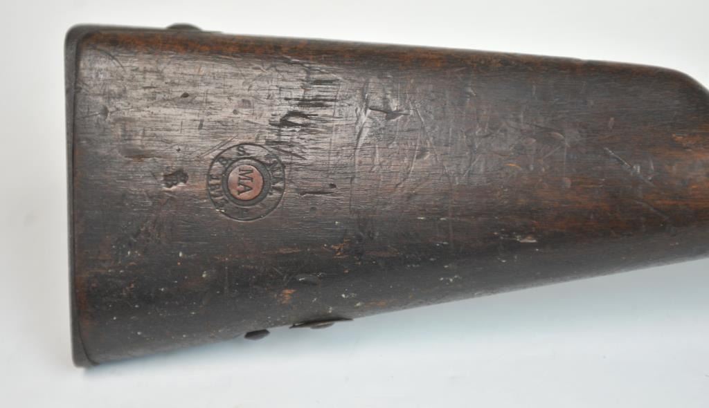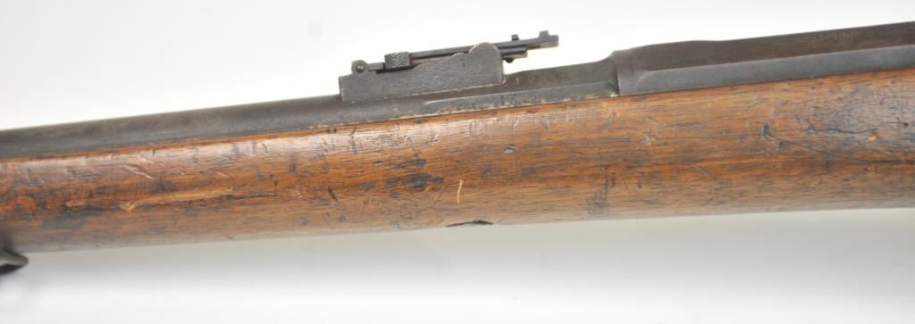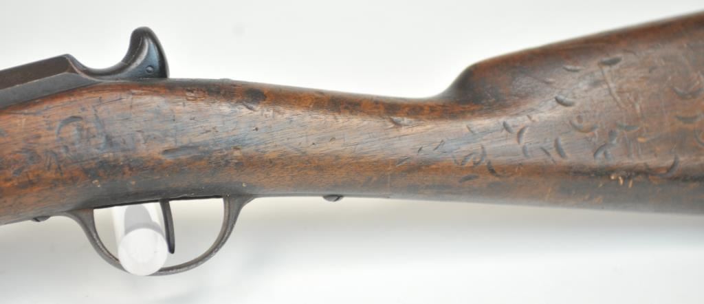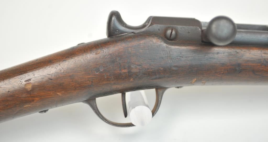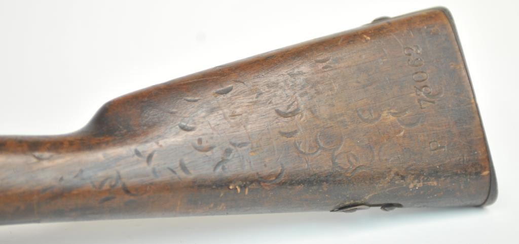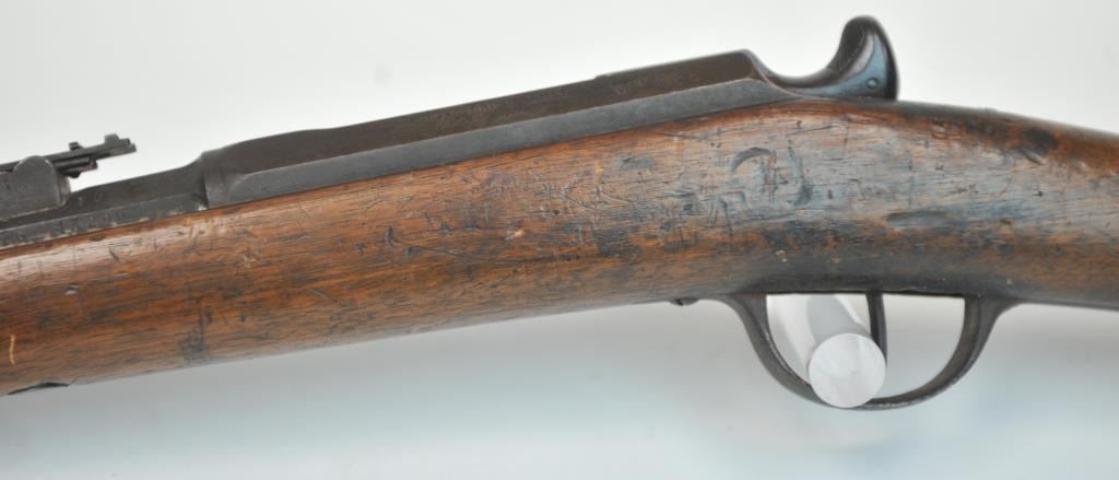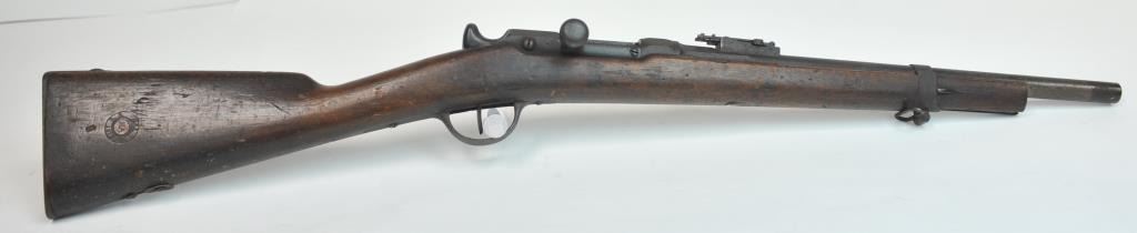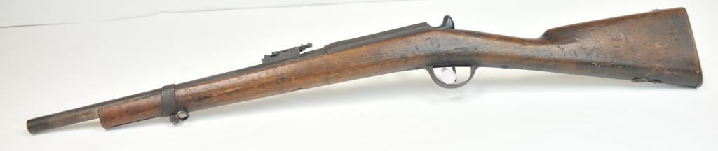 French 1866 Bolt Action Needle rifle marked “St. Etienne” arsenal. The barrel has been reduced to 17” (Possible to use as blank or harpoon gun). The needle is not present and bolt may need a small part as not functioning properly. Fair overall with some rust and pitting. Dark brown patina. The stock shows cartouche and removal of rear swivel replaced by brass ring. (Antique) Est.: $150-$300