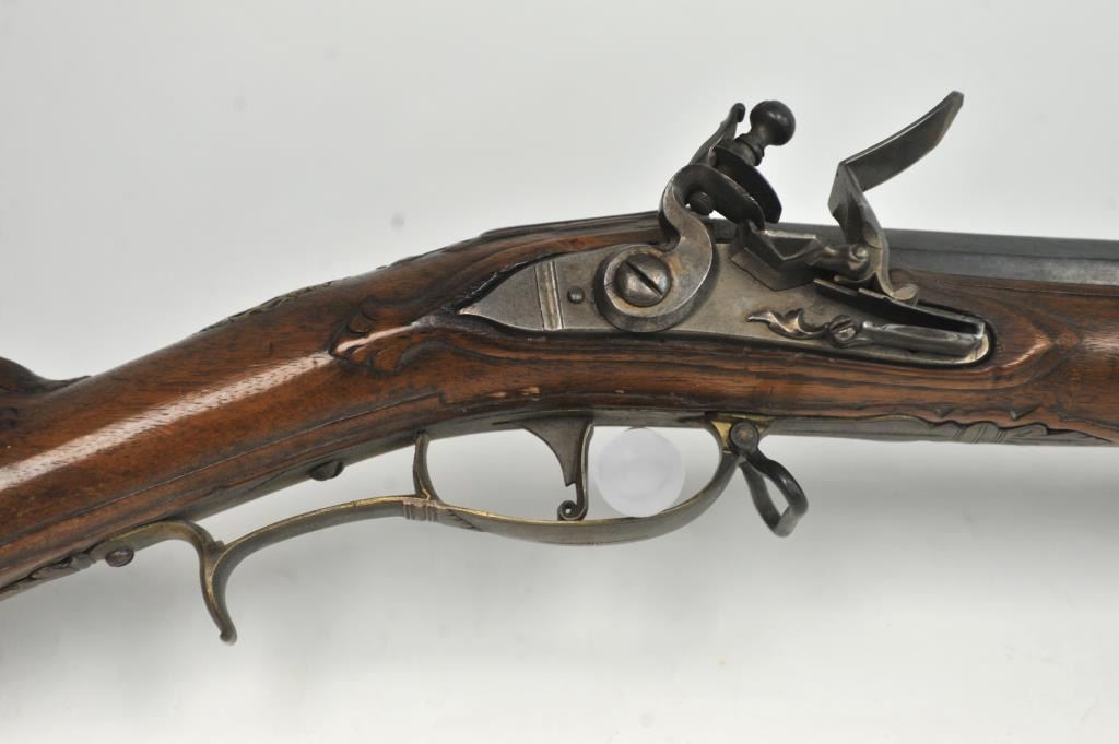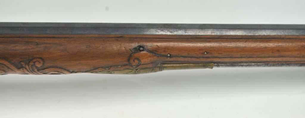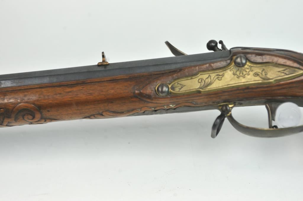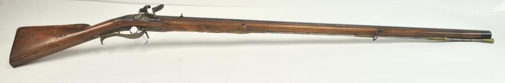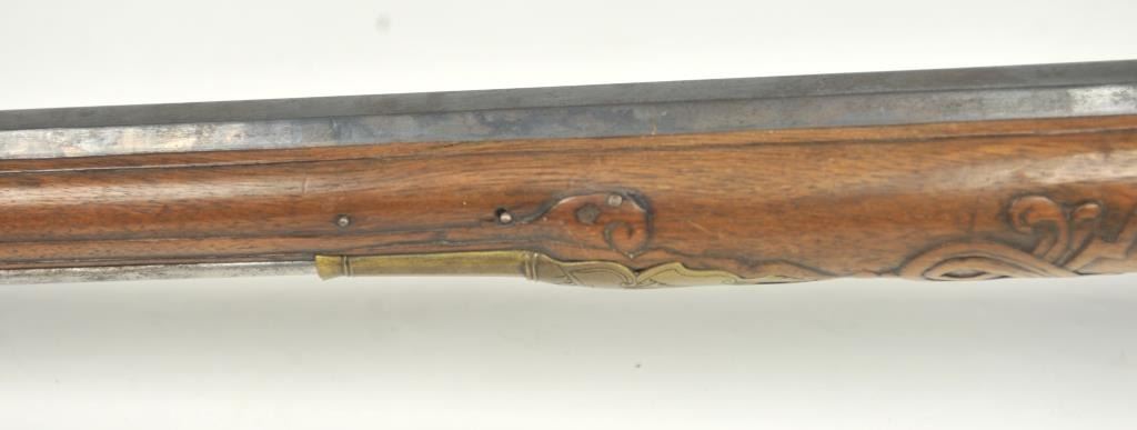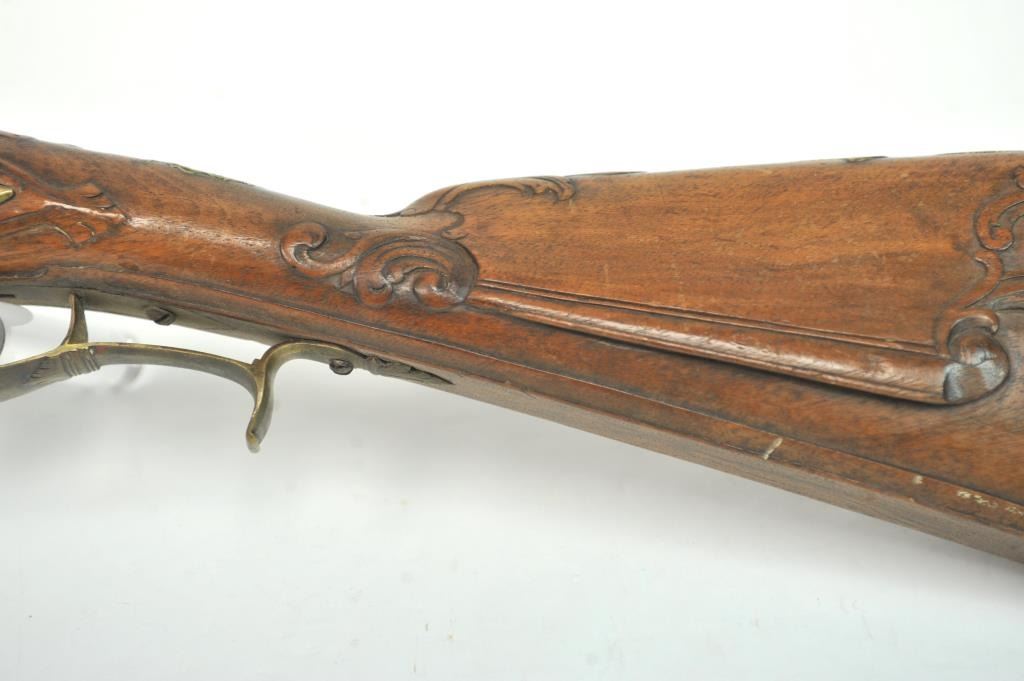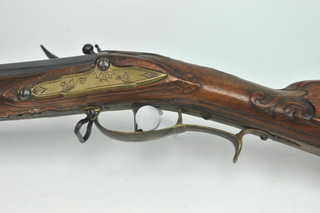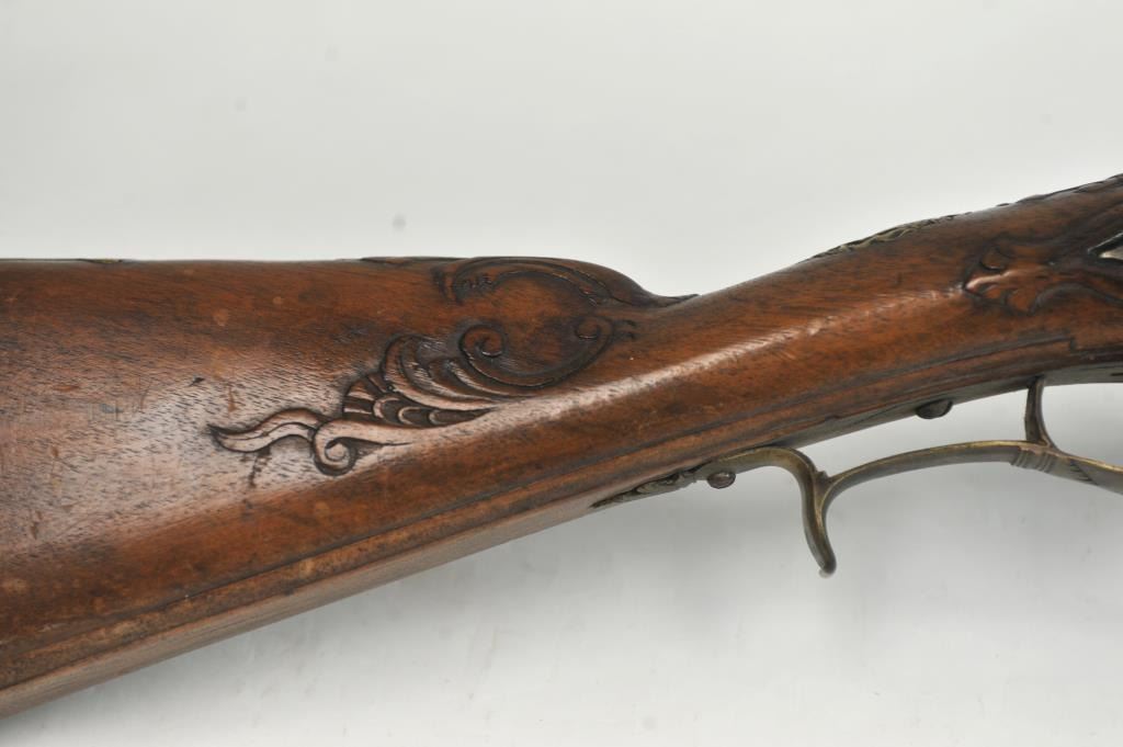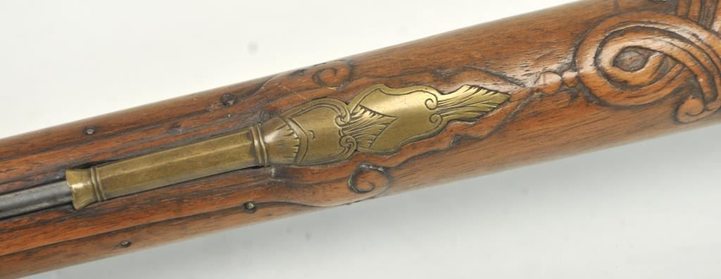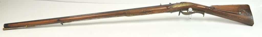 Germanic Flintlock Jaegar full length rifle with fancy cast in relief mounts showing crown and crest at the wrist which are inscribed “V R 1744” with lion facing left and standing. 2H and bear maker’s mark on the breech end of the barrel. The stock is nicely raised carved with scrolls and molded around the fitting. Measures 54” overall with a 39 ½” barrel of approximately .69 caliber rifled. All original flintlock parts and lock works well. Correct to the period ramrod possibly the original. The swivels have been retained and are correct. Most of original fire blue on the barrel and very good plus stocks showing minor wear and storage. Manyof this type carried to colonial America by German immigrants and the model from which our “Kentucky” rifles were patterned after. (Antique) Est.: $2000-$4000