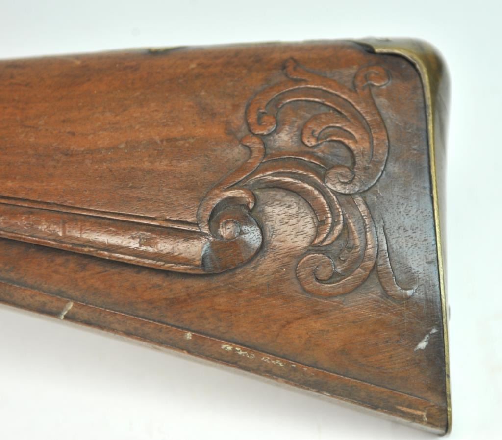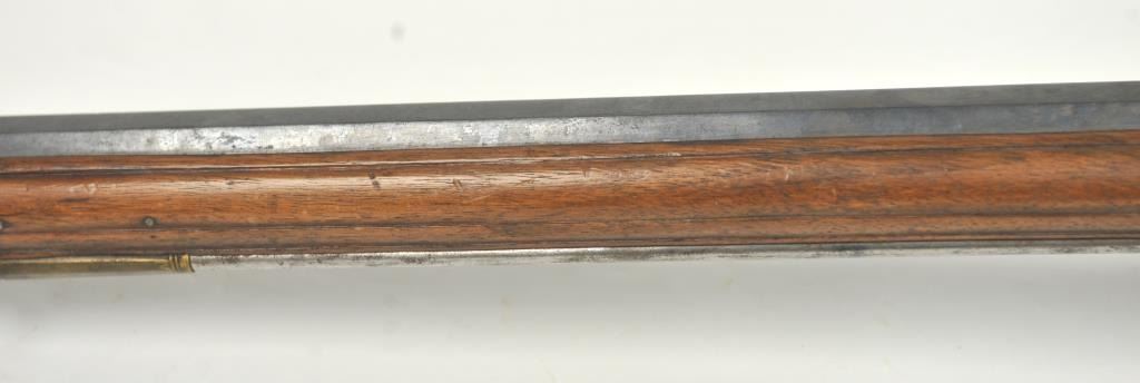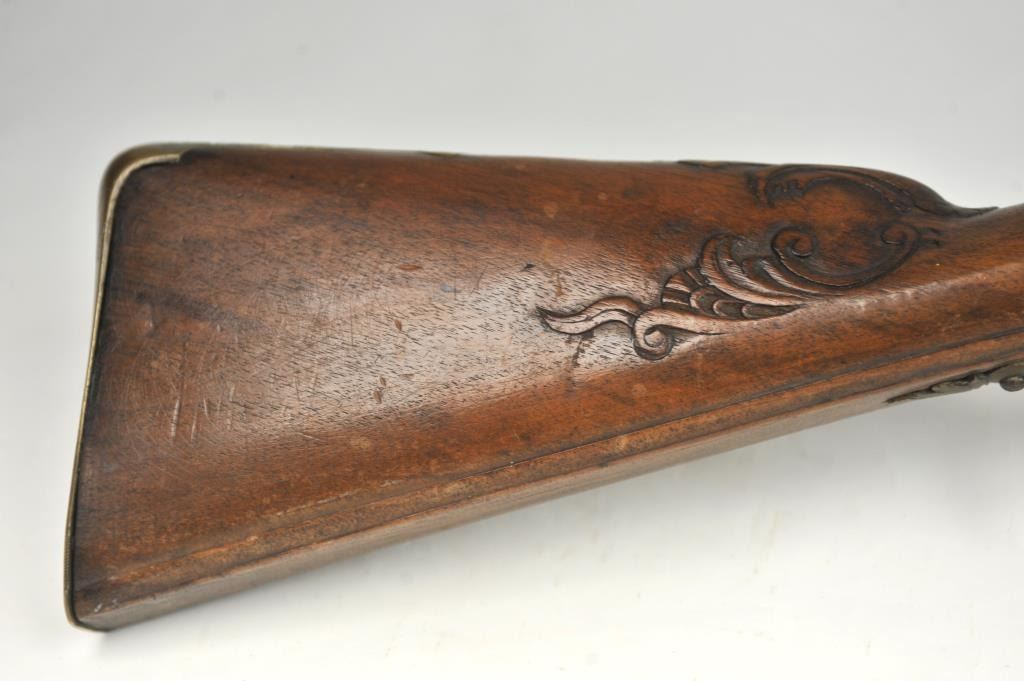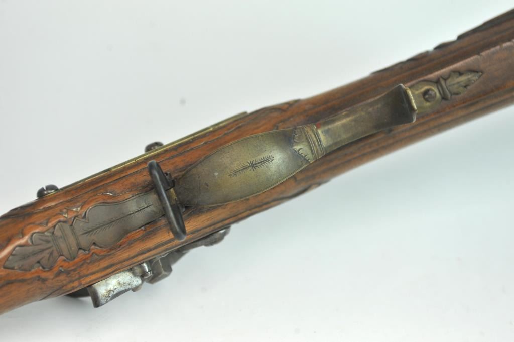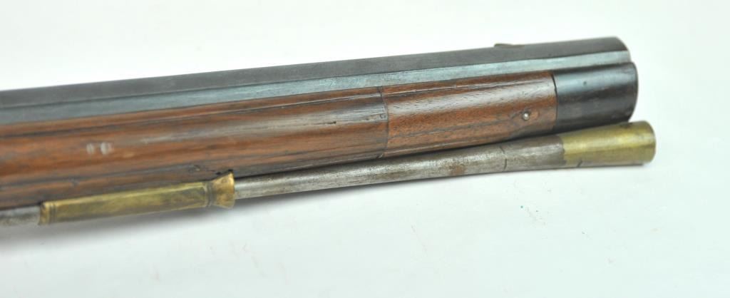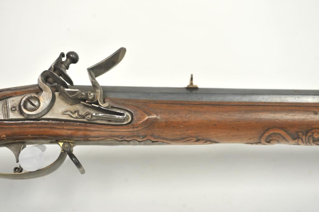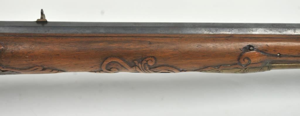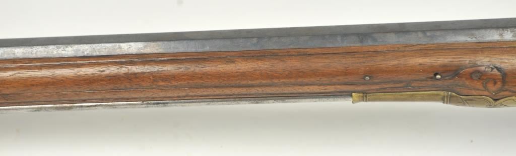 Germanic Flintlock Jaegar full length rifle with fancy cast in relief mounts showing crown and crest at the wrist which are inscribed “V R 1744” with lion facing left and standing. 2H and bear maker’s mark on the breech end of the barrel. The stock is nicely raised carved with scrolls and molded around the fitting. Measures 54” overall with a 39 ½” barrel of approximately .69 caliber rifled. All original flintlock parts and lock works well. Correct to the period ramrod possibly the original. The swivels have been retained and are correct. Most of original fire blue on the barrel and very good plus stocks showing minor wear and storage. Manyof this type carried to colonial America by German immigrants and the model from which our “Kentucky” rifles were patterned after. (Antique) Est.: $2000-$4000
