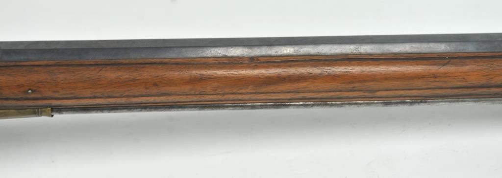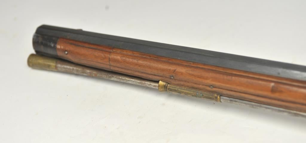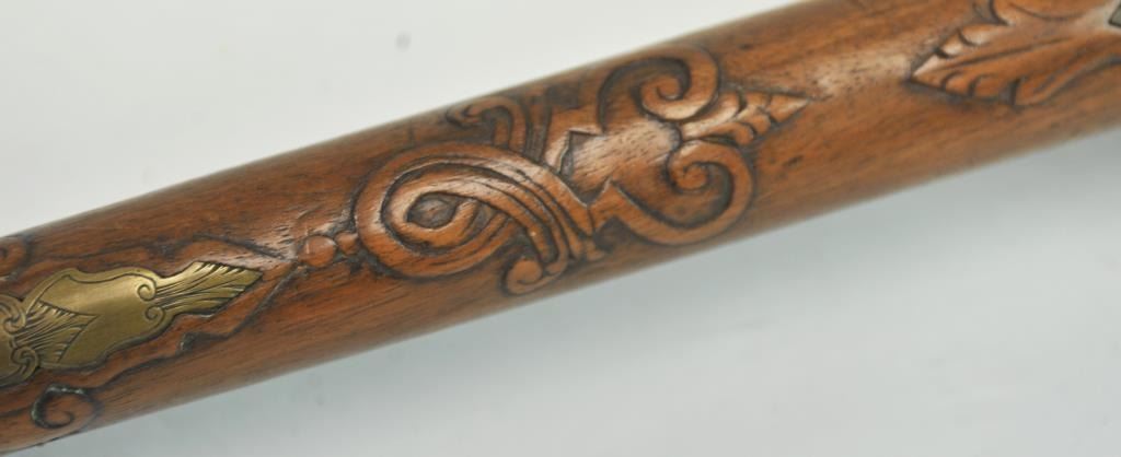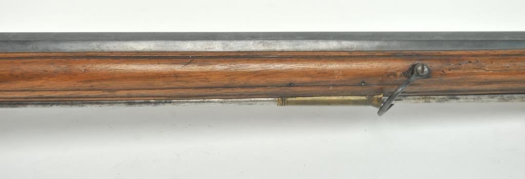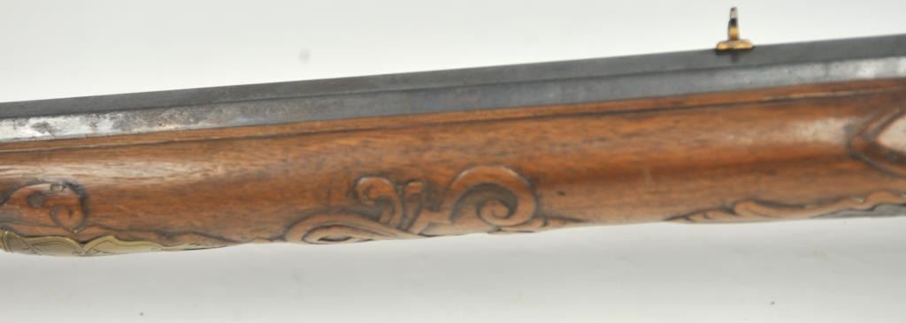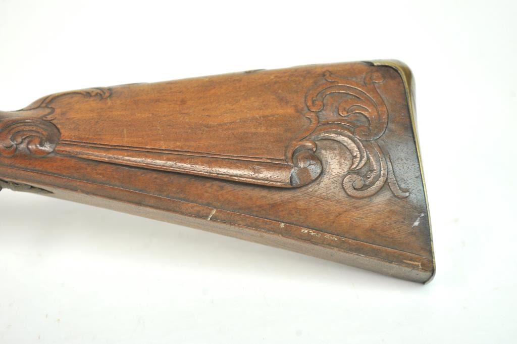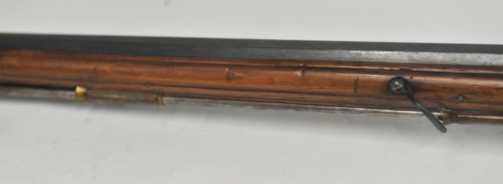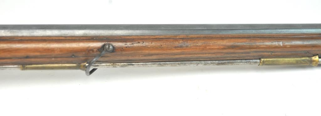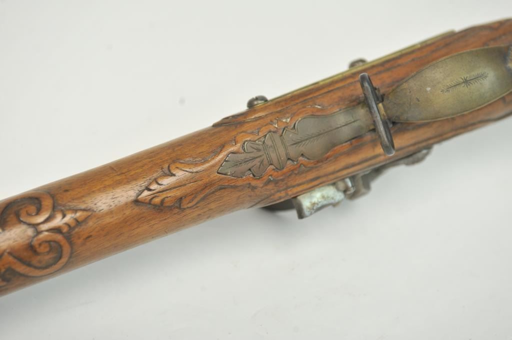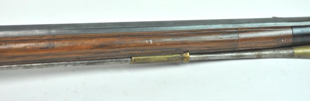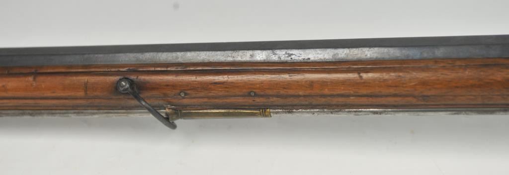 Germanic Flintlock Jaegar full length rifle with fancy cast in relief mounts showing crown and crest at the wrist which are inscribed “V R 1744” with lion facing left and standing. 2H and bear maker’s mark on the breech end of the barrel. The stock is nicely raised carved with scrolls and molded around the fitting. Measures 54” overall with a 39 ½” barrel of approximately .69 caliber rifled. All original flintlock parts and lock works well. Correct to the period ramrod possibly the original. The swivels have been retained and are correct. Most of original fire blue on the barrel and very good plus stocks showing minor wear and storage. Manyof this type carried to colonial America by German immigrants and the model from which our “Kentucky” rifles were patterned after. (Antique) Est.: $2000-$4000