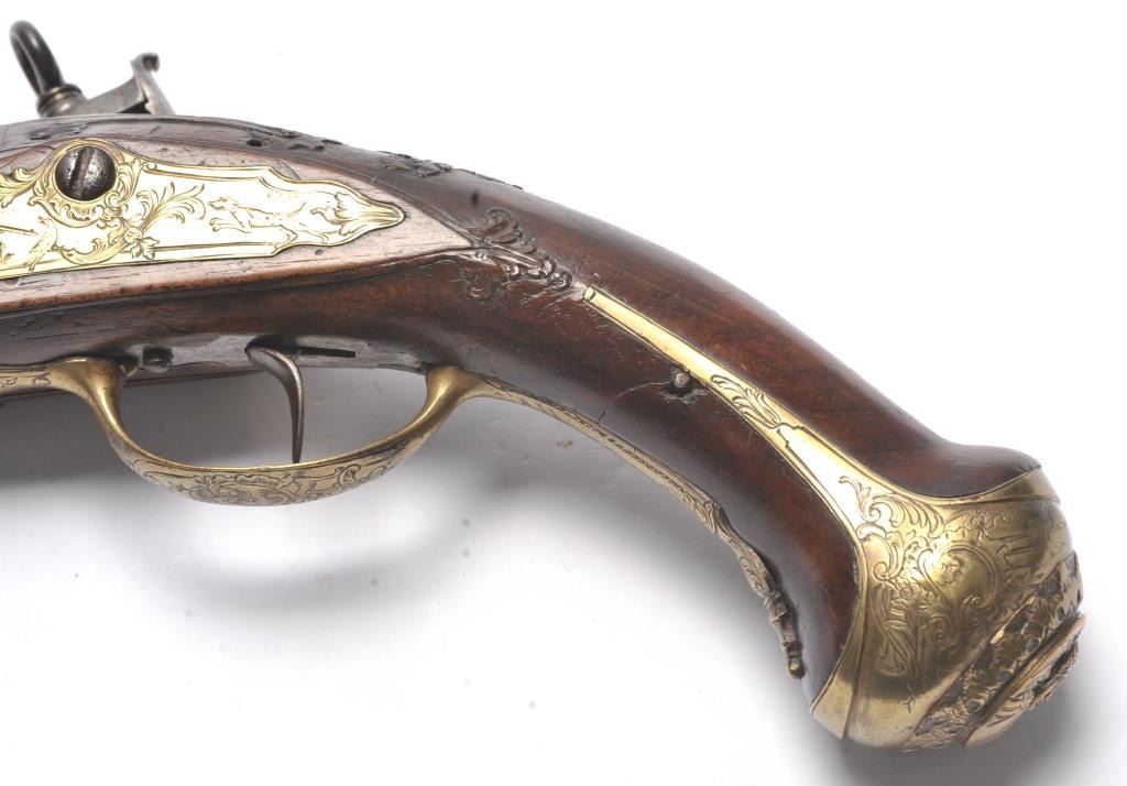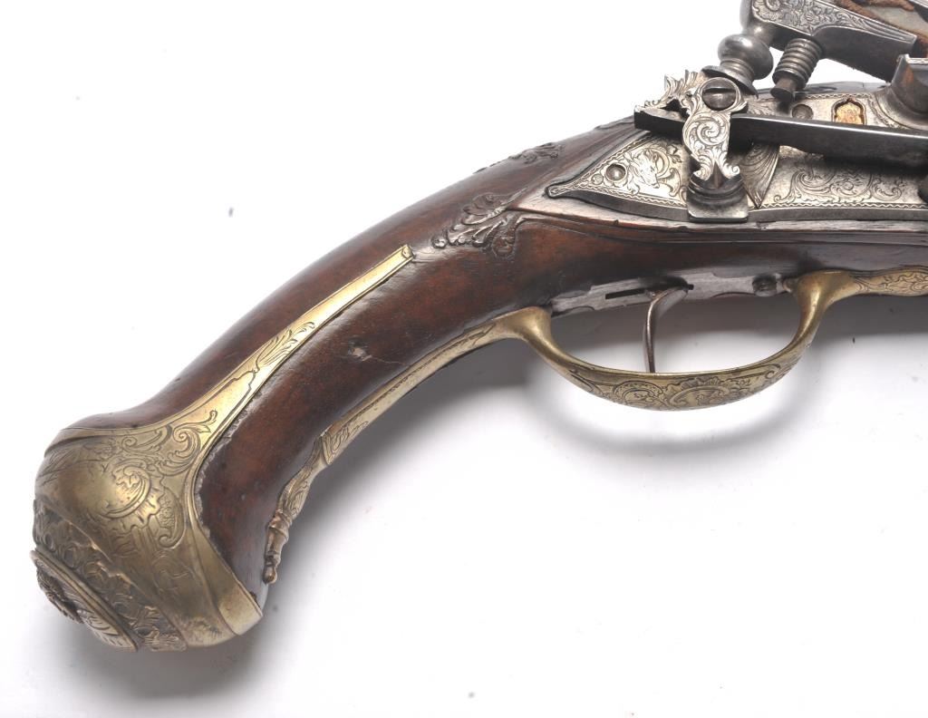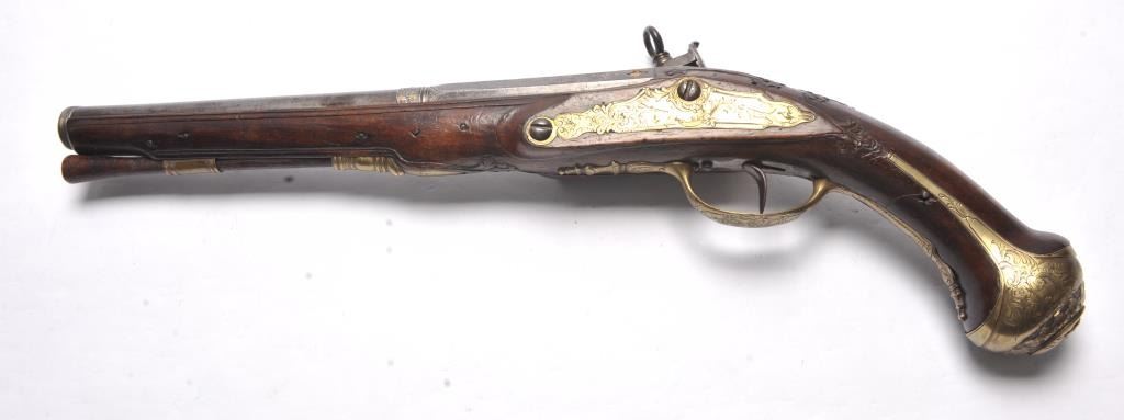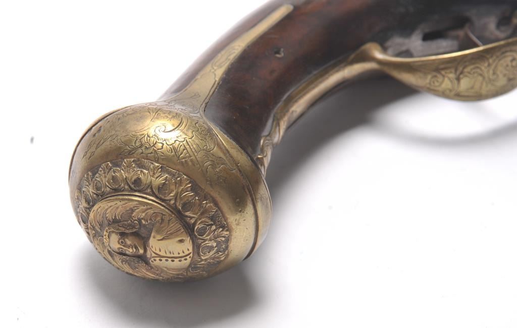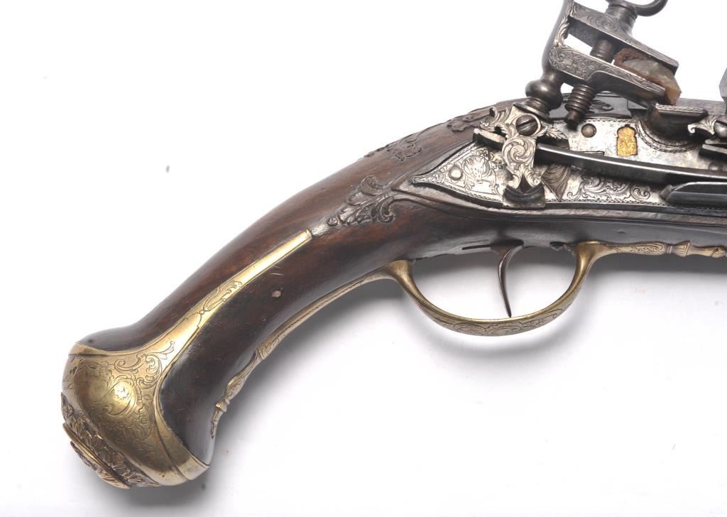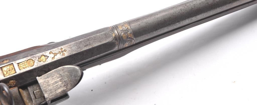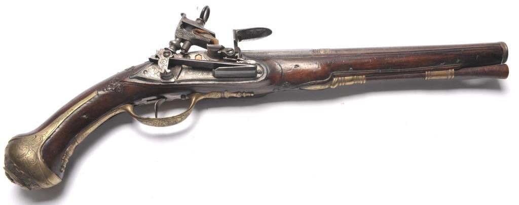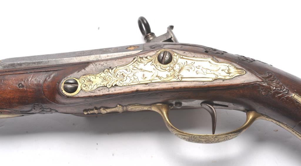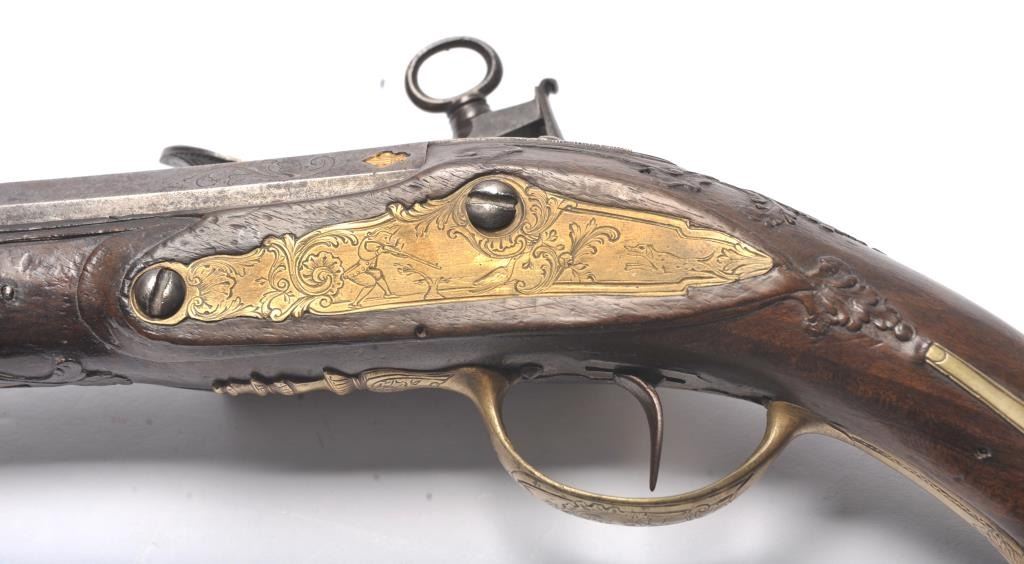 Pair of high-quality horseman’s size miquelet flintlock pistols signed “Bustin Dui” on the barrels and “AR, GVI, ANO” on the locks in a 3-line small maker’s hallmark or cartouche. Measures 17” overall with 10 ¼” ringed muzzle 2 stage cannon barrels with nice chisel and gold at juncture of octagon to round. Also, many gold inlaid marks and engravings at the breech. The mounts are engraved brass with monarch’s bust on the butt. The brass sideplates show an engraved scene of a man hunting bird with flintlock fowler and dog. The locks are nicely engraved in florals and retains all original parts. The actions work well and metal surfaces are very good withlight gray to brown patina. The stocks are good with fancy raised carving and 1 pistol shows an excellent spliced in repair of wood extending approximately 3”. The carving is well defined. Correct style wooden ramrods. A very nice and large pair of miquelets dating late 18th to early 19th century. (Antique) Est.: $3000-$6000