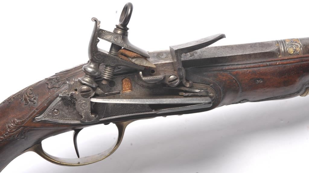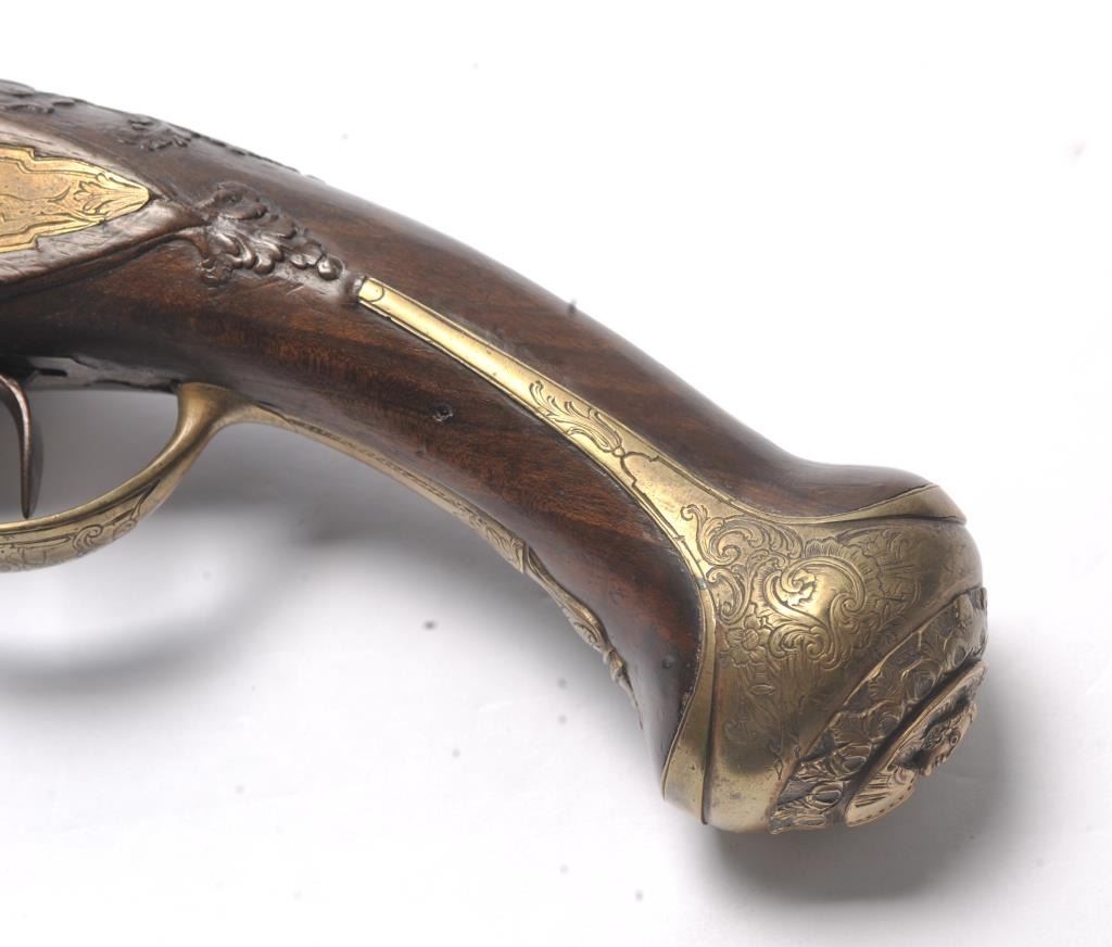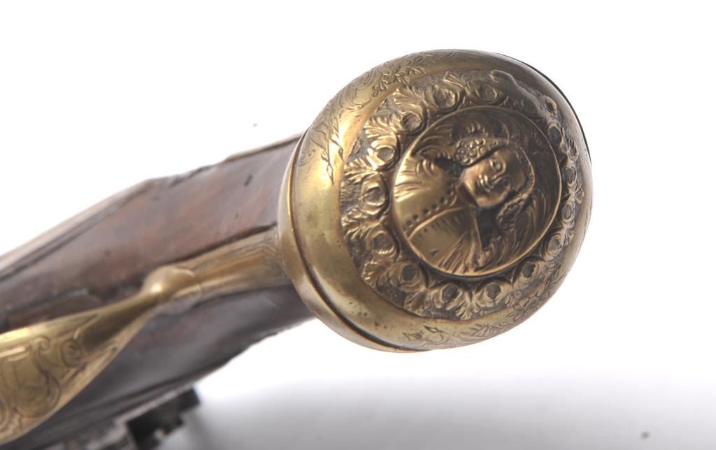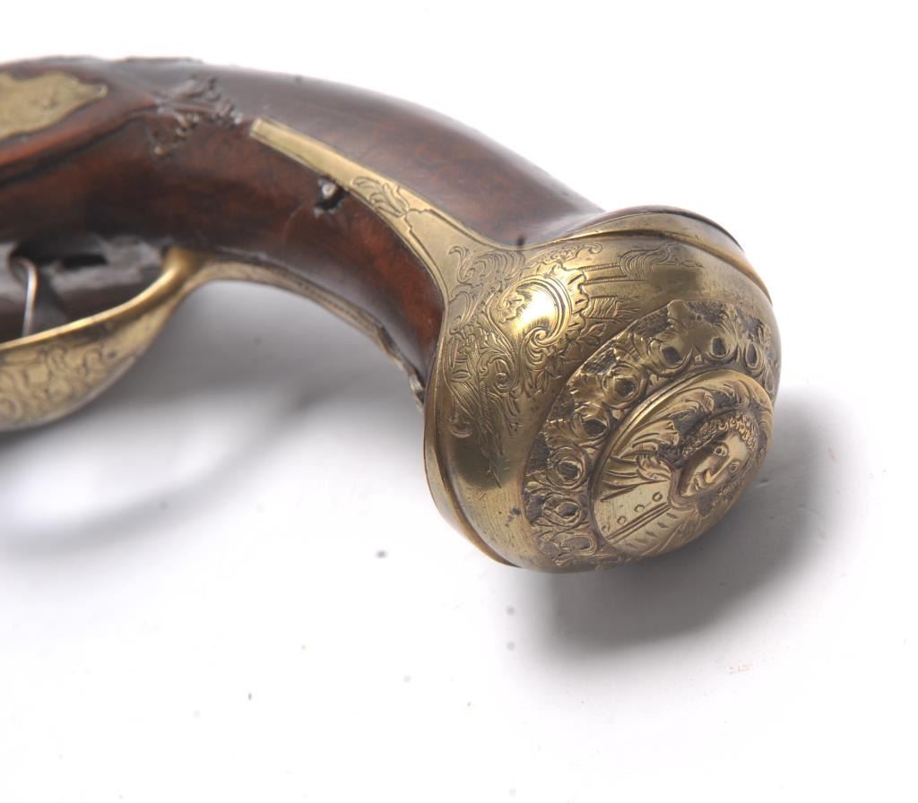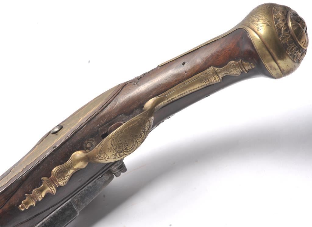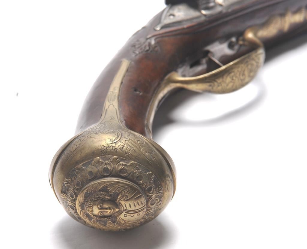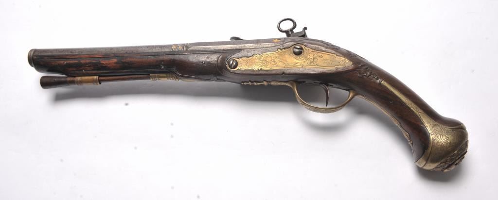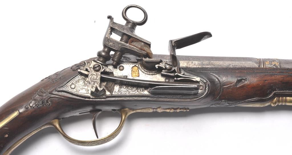 Pair of high-quality horseman’s size miquelet flintlock pistols signed “Bustin Dui” on the barrels and “AR, GVI, ANO” on the locks in a 3-line small maker’s hallmark or cartouche. Measures 17” overall with 10 ¼” ringed muzzle 2 stage cannon barrels with nice chisel and gold at juncture of octagon to round. Also, many gold inlaid marks and engravings at the breech. The mounts are engraved brass with monarch’s bust on the butt. The brass sideplates show an engraved scene of a man hunting bird with flintlock fowler and dog. The locks are nicely engraved in florals and retains all original parts. The actions work well and metal surfaces are very good withlight gray to brown patina. The stocks are good with fancy raised carving and 1 pistol shows an excellent spliced in repair of wood extending approximately 3”. The carving is well defined. Correct style wooden ramrods. A very nice and large pair of miquelets dating late 18th to early 19th century. (Antique) Est.: $3000-$6000