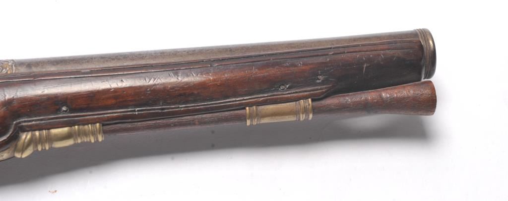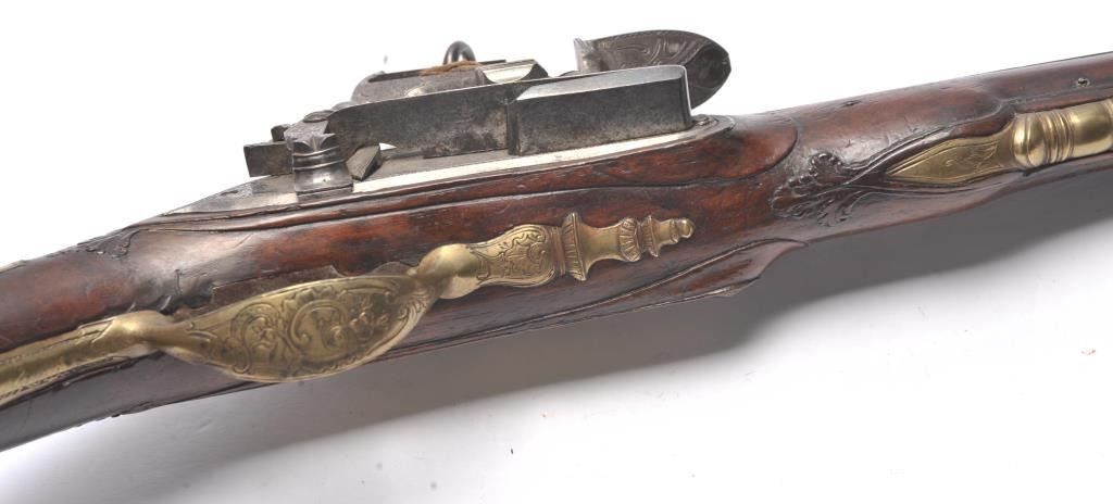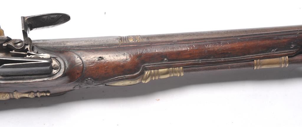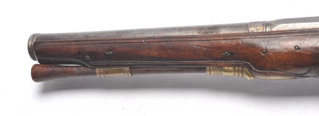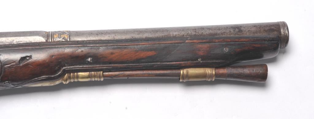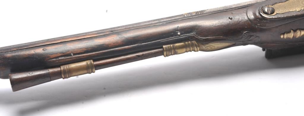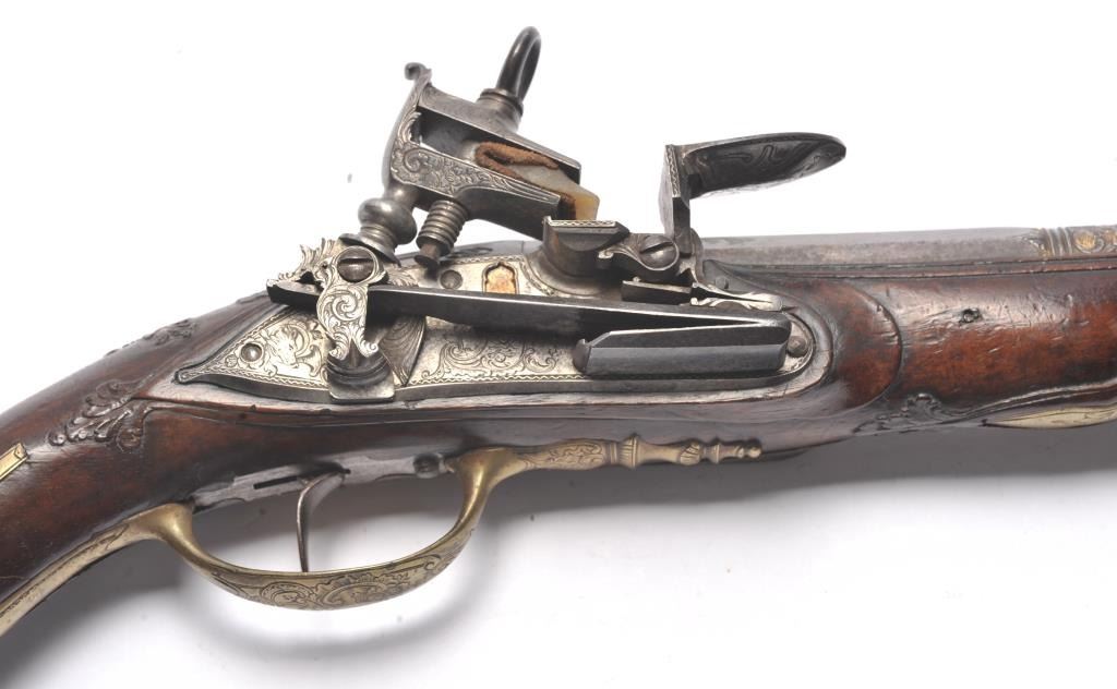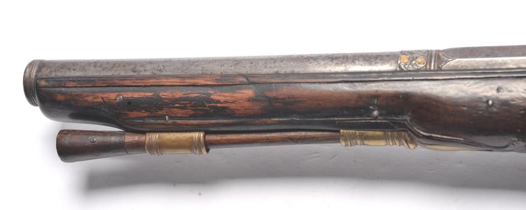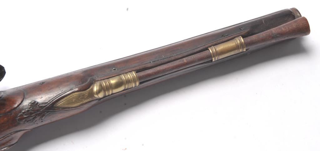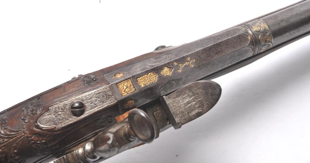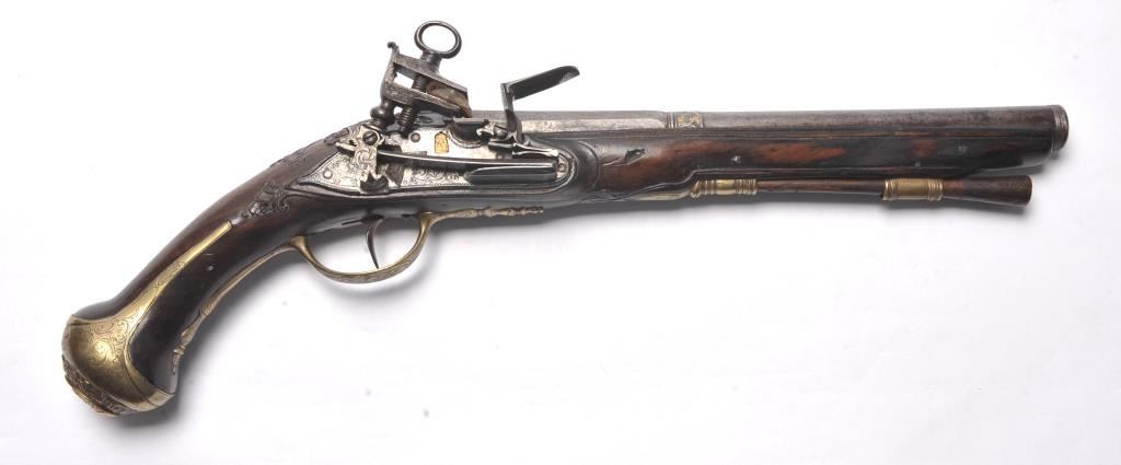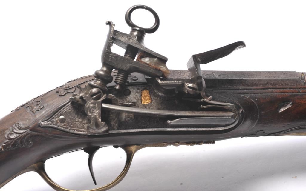 Pair of high-quality horseman’s size miquelet flintlock pistols signed “Bustin Dui” on the barrels and “AR, GVI, ANO” on the locks in a 3-line small maker’s hallmark or cartouche. Measures 17” overall with 10 ¼” ringed muzzle 2 stage cannon barrels with nice chisel and gold at juncture of octagon to round. Also, many gold inlaid marks and engravings at the breech. The mounts are engraved brass with monarch’s bust on the butt. The brass sideplates show an engraved scene of a man hunting bird with flintlock fowler and dog. The locks are nicely engraved in florals and retains all original parts. The actions work well and metal surfaces are very good withlight gray to brown patina. The stocks are good with fancy raised carving and 1 pistol shows an excellent spliced in repair of wood extending approximately 3”. The carving is well defined. Correct style wooden ramrods. A very nice and large pair of miquelets dating late 18th to early 19th century. (Antique) Est.: $3000-$6000