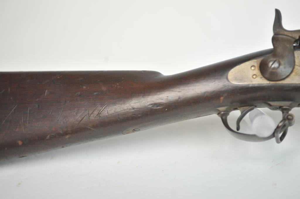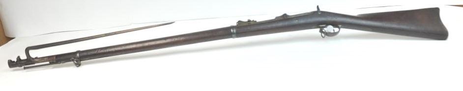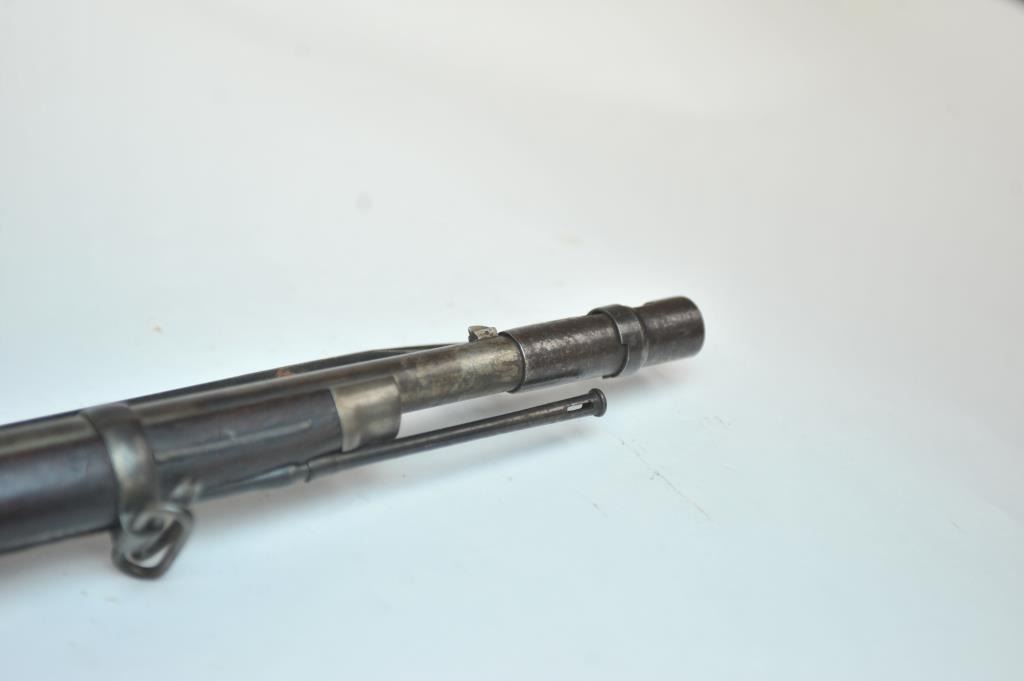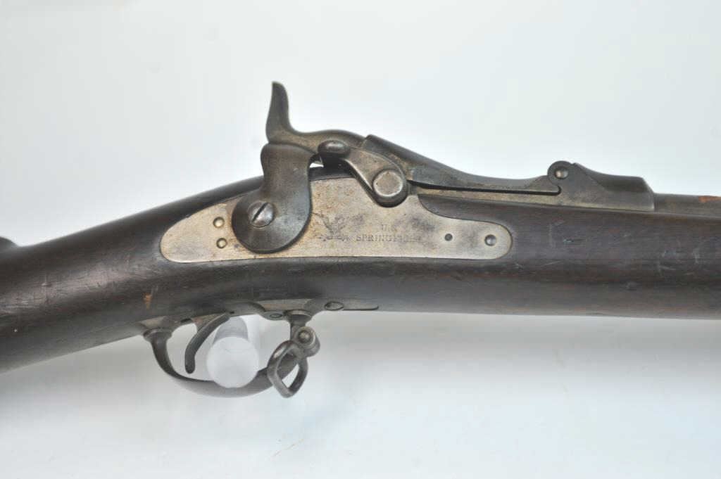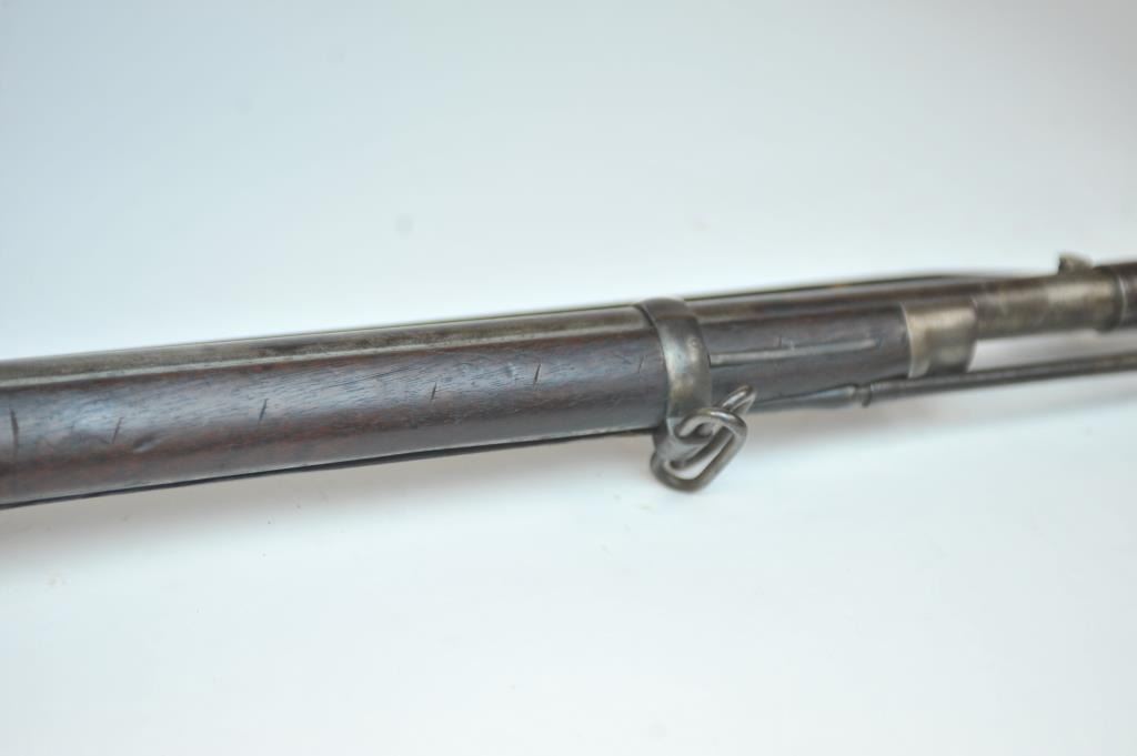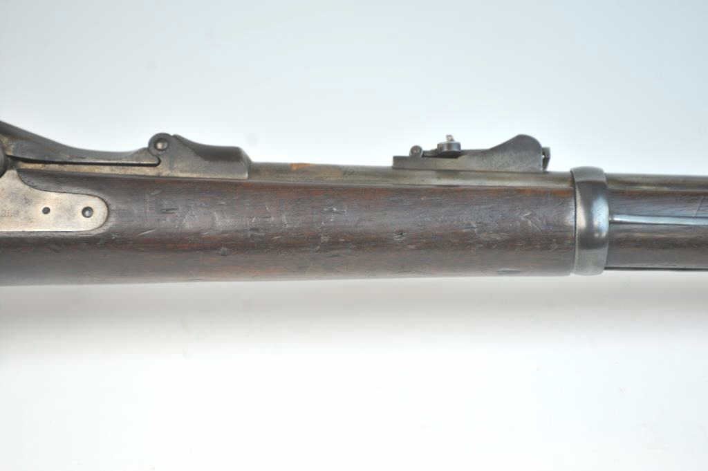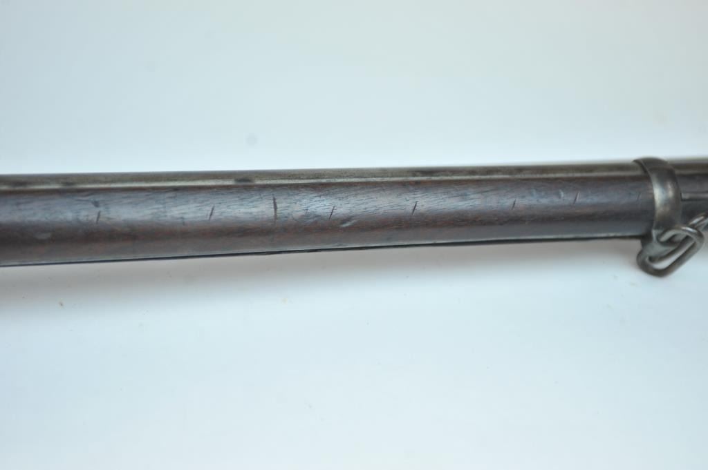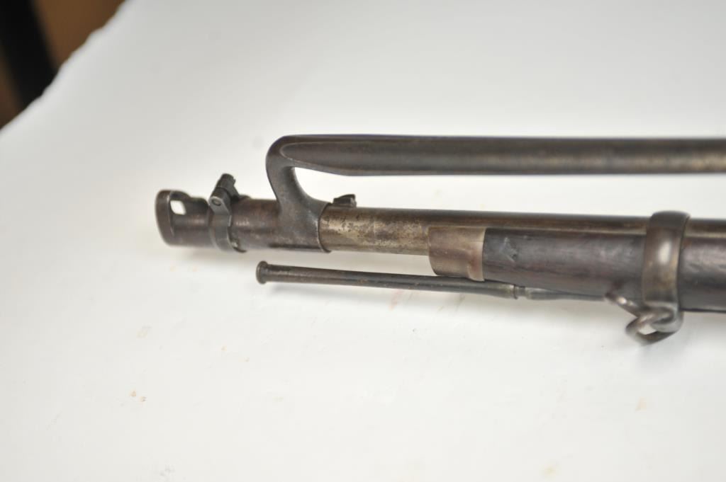 Springfield Model 1884 2 band Cadet Rifle with bayonet and rod, S/N 263472. Good overall condition with metal showing some minor pitting and erosion. Good eagle and lock marking. Outline of cartouche is dark.Stained stock that is generally good overall with many small imperfections and some purposely cut slashes in the stock and comb. The action is good and the bore is fair to good and may clean. (Antique) Est.:$700-$1400