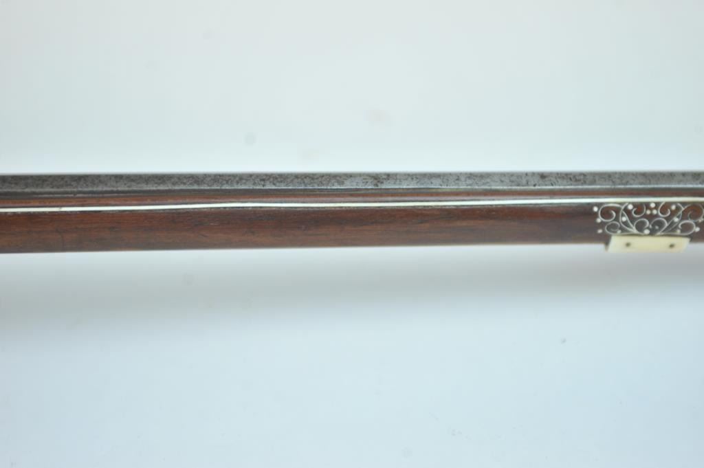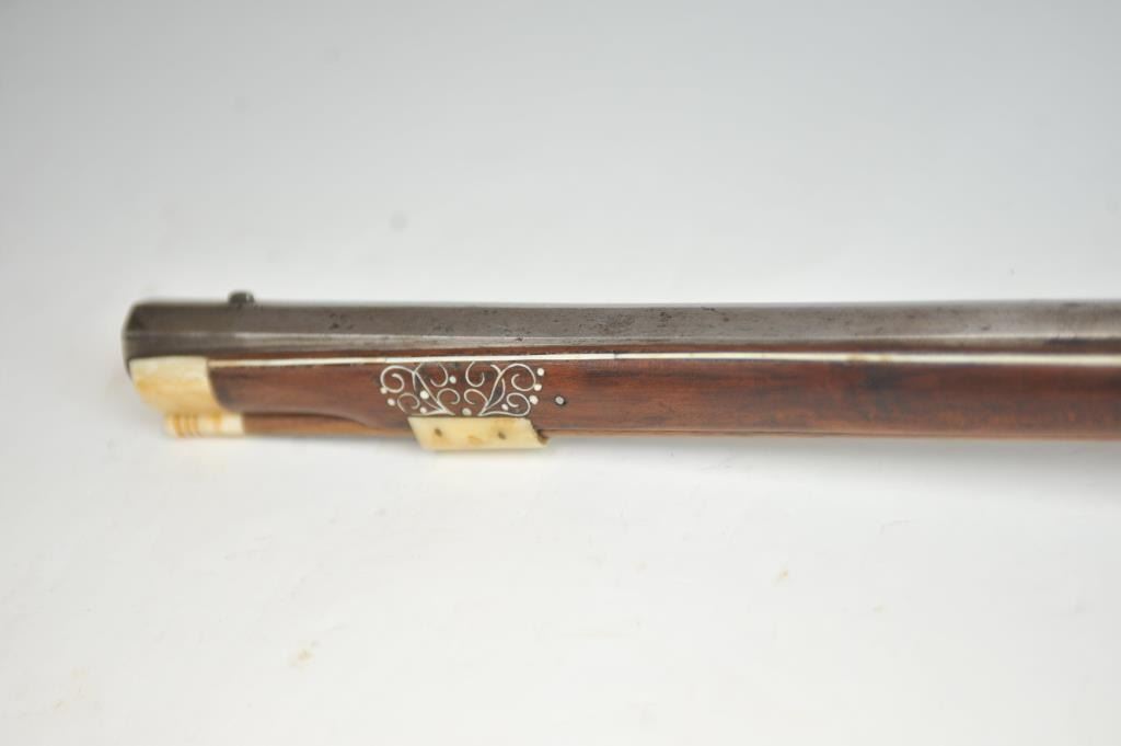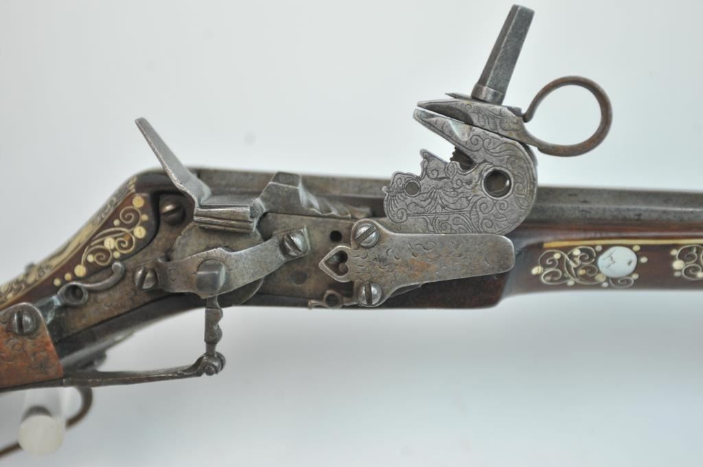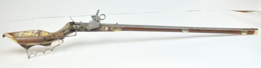 Eastern European Tsinke style wheelock with period inlaid stock. Typical outside spring with light floral engraving. Measures 46” overall with 32” octagon barrel and typical lightweight. The stock is nicely inlaid withfigures of angel playing mandolin, mystic beasts, game and geometric figures along with fancy scrolls and varying size dots inlaid in both bone and pearl. The patch box door is not inlaid but shows matching bone at therear to inlays and probably the original. The condition is very good plus with minor erosion and pitting on the metal. The wood is very good and there has been minor well done restoration replacing some inlays andferrells plus cleaning to wood. Circa about 1590-1640 from the area of Silesia East to Czechoslovakia, Hungary, and Poland. (Antique) Est.: $5,000-$10,000