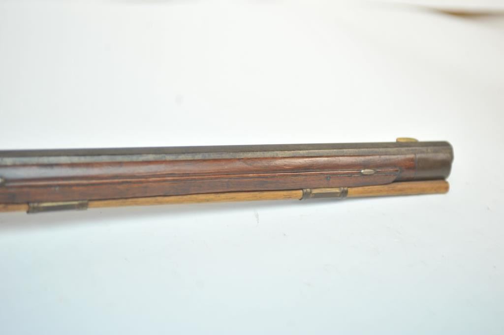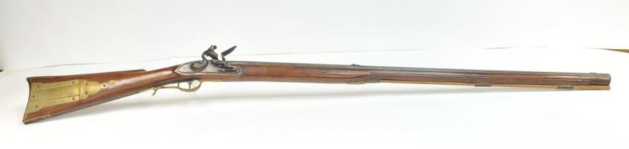 Virginia manufacture flintlock military rifle (2nd model) marked “Richmond 1821” at the rear of lock. Reconverted back to flintlock with good quality restoration overall. Tag #1 from the Fred Slayton confederate armscollection and last sold by Little Johns in the early 1990s. Rifling is bored or shot out to about .52 caliber from original .50 with no trace of rifling remaining. Some scattered pitting and erosion with light but visiblelock markings. The stock is very good as restored. A very rare American rifle (Approximately 1700 made). Refer Flayderman (9B-018). (Antique) Est.: $2750-$5500