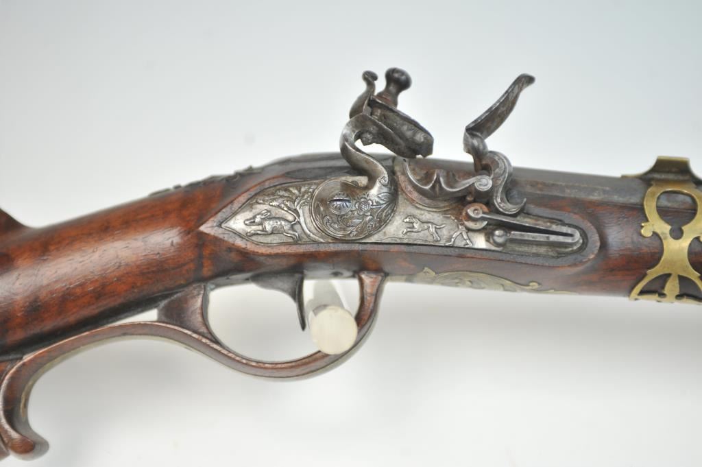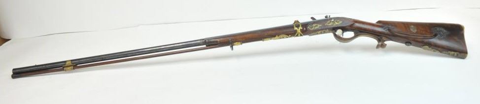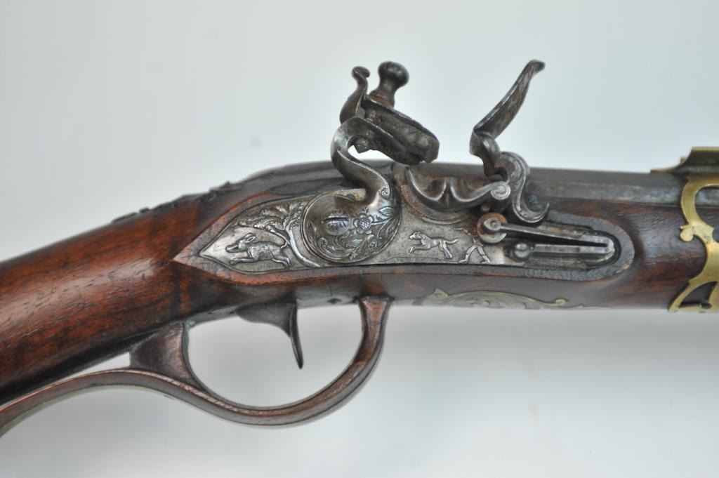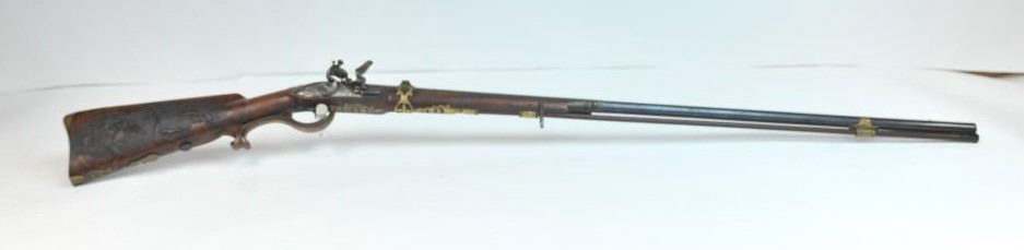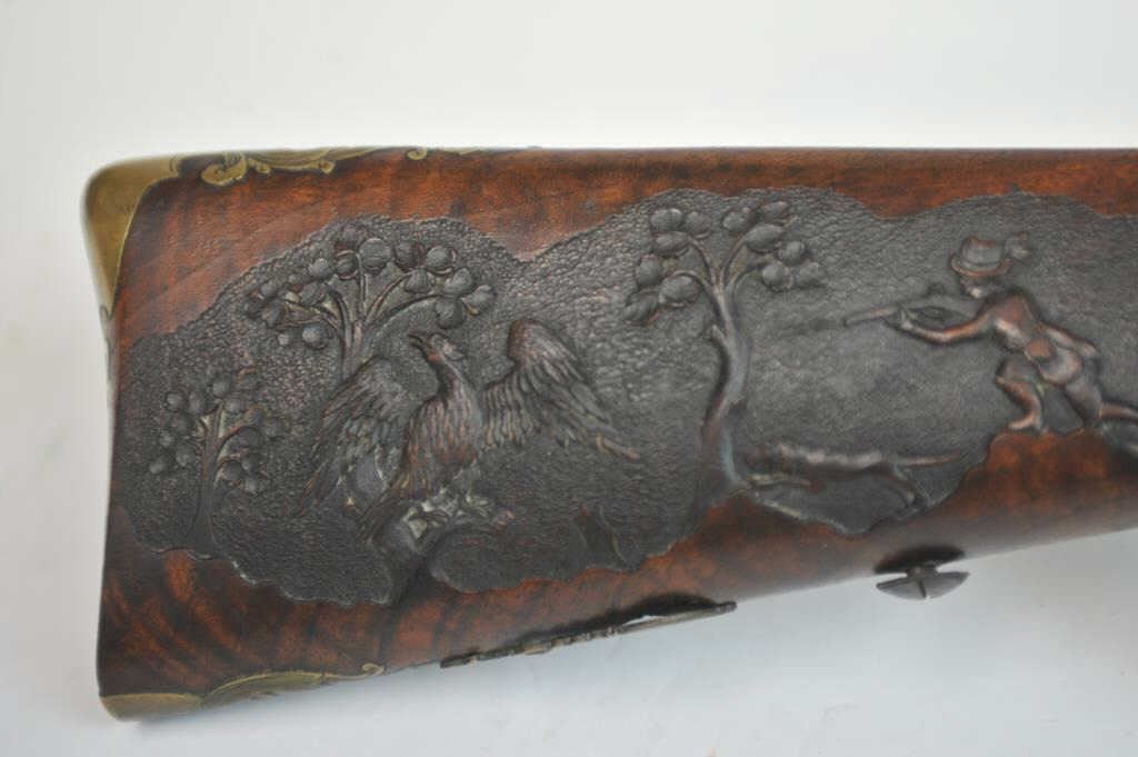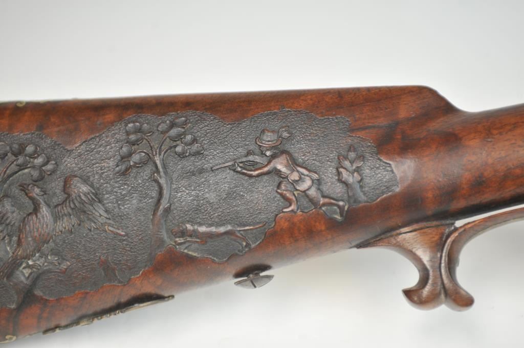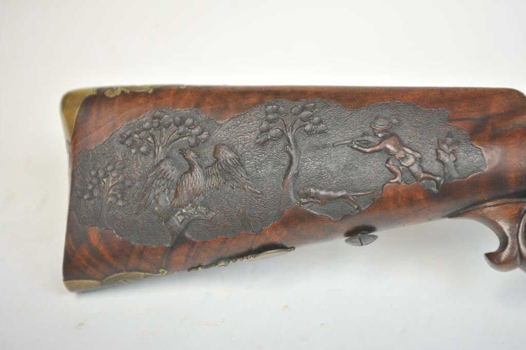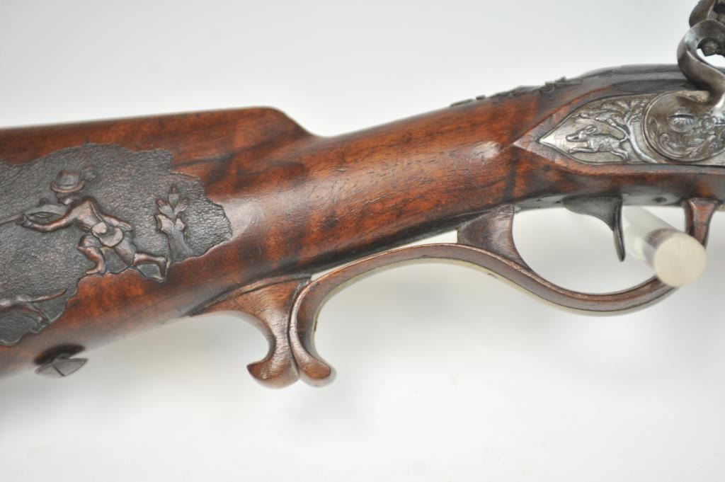 Highly decorated and diminutive size flintlock fowler probably Austrian or German circa early 19th century. Measures 49” overall with nearly 36” barrel of approximately 20GA weighing on 3.75 lbs. Thelock is chiseled in relief with scenes of hunter, dog and game surrounded by scrolls. The stock is finely carved with another hunter and dog shooting a Hapsburg style eagle in a tree, the reverse side of thestock shows finely carved roses at each end of the cheek piece and around tang. The center of the cheek piece shows a crown and shield in silver. All original flintlock parts and circa 1790s-1830s. The barrel shows most of its original blue with minor light beginning rust and erosion. Lock has colored from its original bright slightly with crisp chiseled figures and all original flintlock parts. The stock is crisp and the arm is near fine condition overall. Lock works perfectly and tight. All small parts retained and correct style ramrod. (Antique) Est.: $1750-$3500