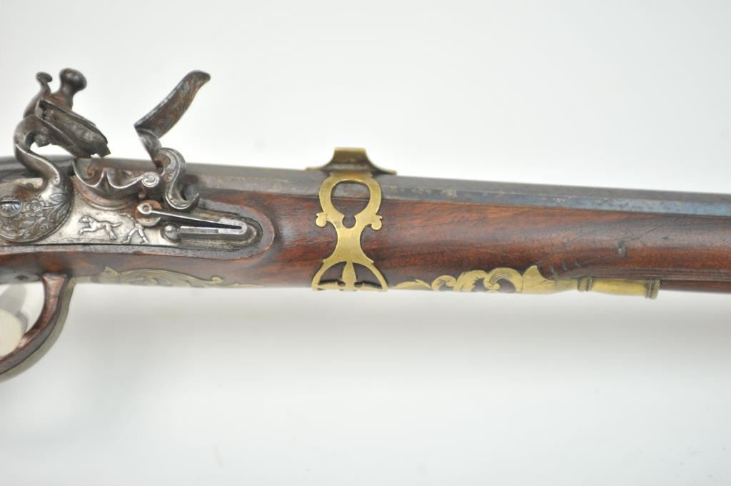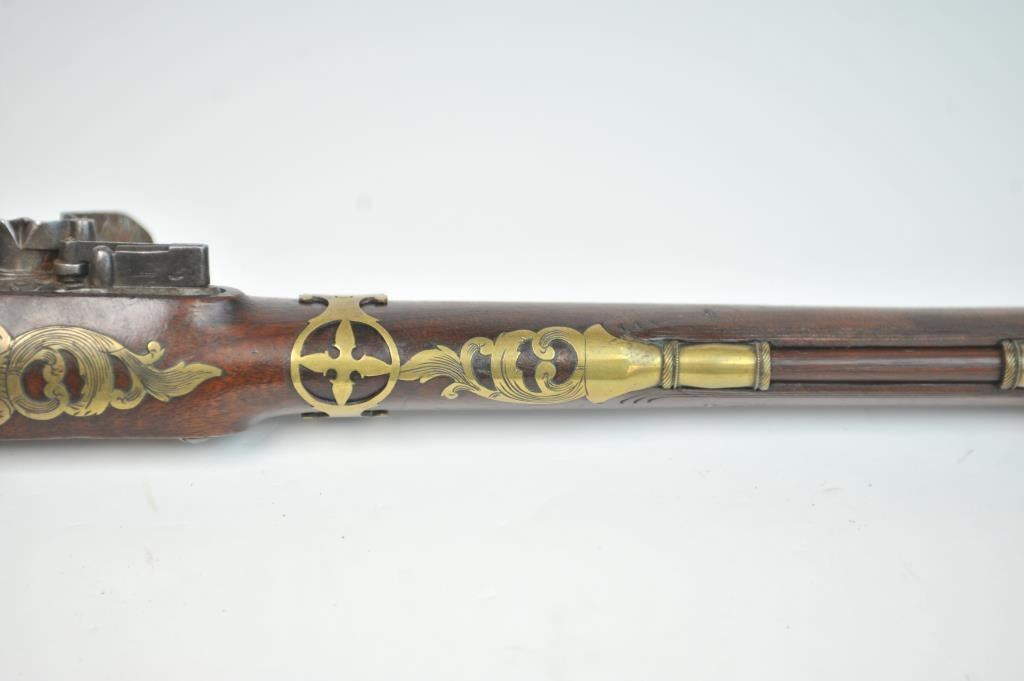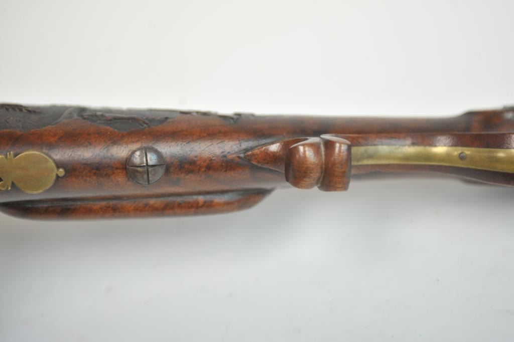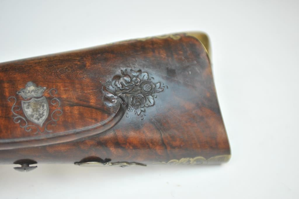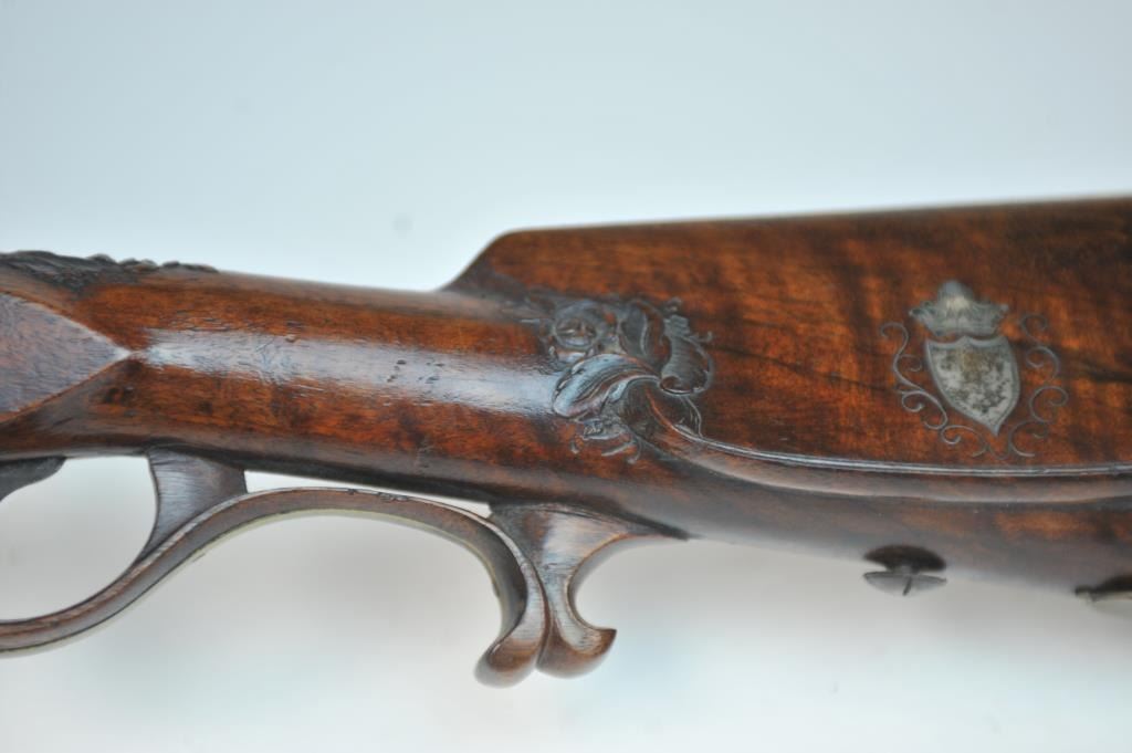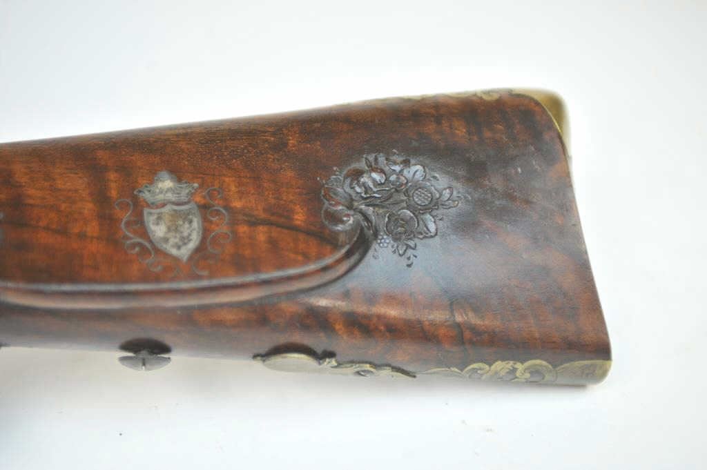 Highly decorated and diminutive size flintlock fowler probably Austrian or German circa early 19th century. Measures 49” overall with nearly 36” barrel of approximately 20GA weighing on 3.75 lbs. Thelock is chiseled in relief with scenes of hunter, dog and game surrounded by scrolls. The stock is finely carved with another hunter and dog shooting a Hapsburg style eagle in a tree, the reverse side of thestock shows finely carved roses at each end of the cheek piece and around tang. The center of the cheek piece shows a crown and shield in silver. All original flintlock parts and circa 1790s-1830s. The barrel shows most of its original blue with minor light beginning rust and erosion. Lock has colored from its original bright slightly with crisp chiseled figures and all original flintlock parts. The stock is crisp and the arm is near fine condition overall. Lock works perfectly and tight. All small parts retained and correct style ramrod. (Antique) Est.: $1750-$3500