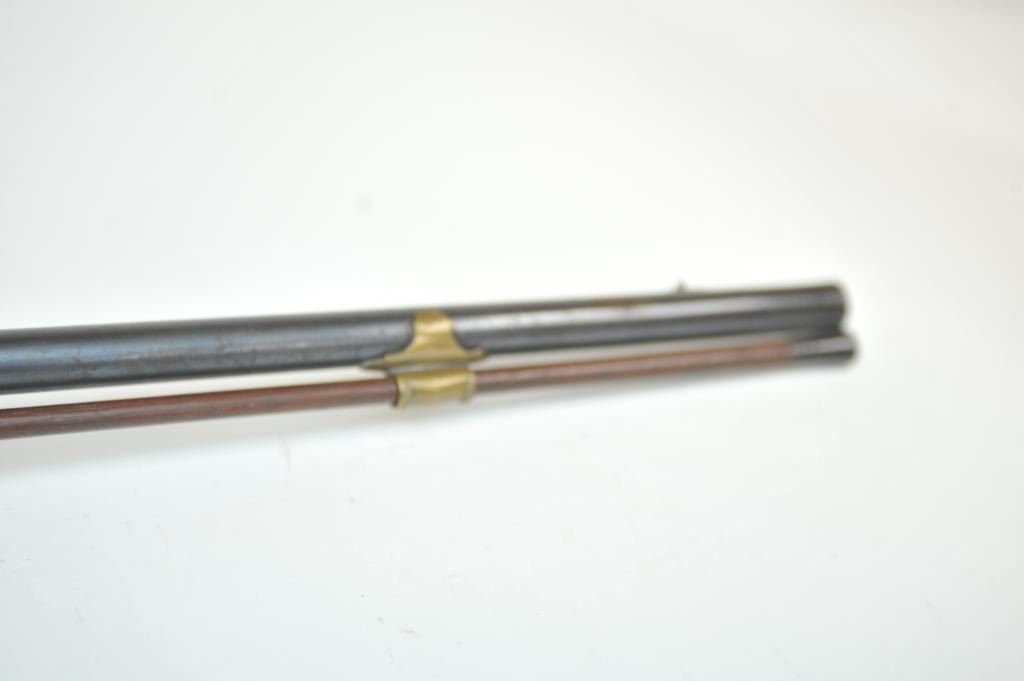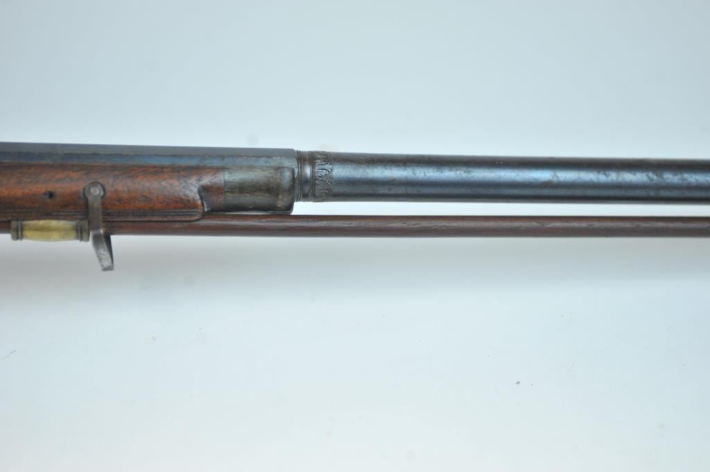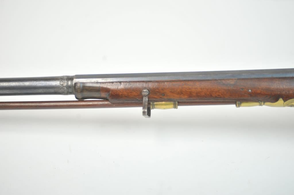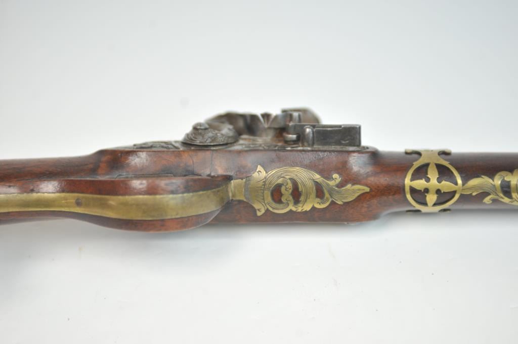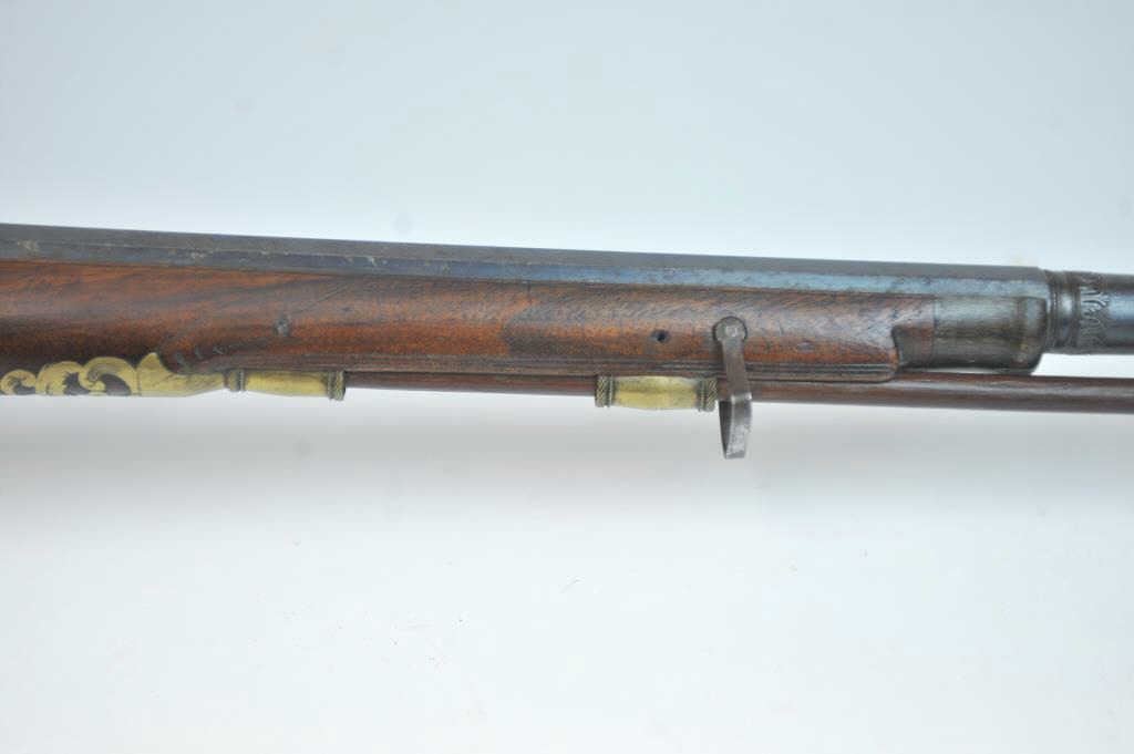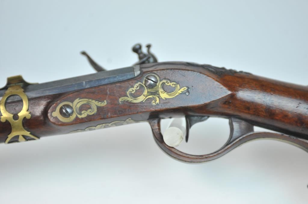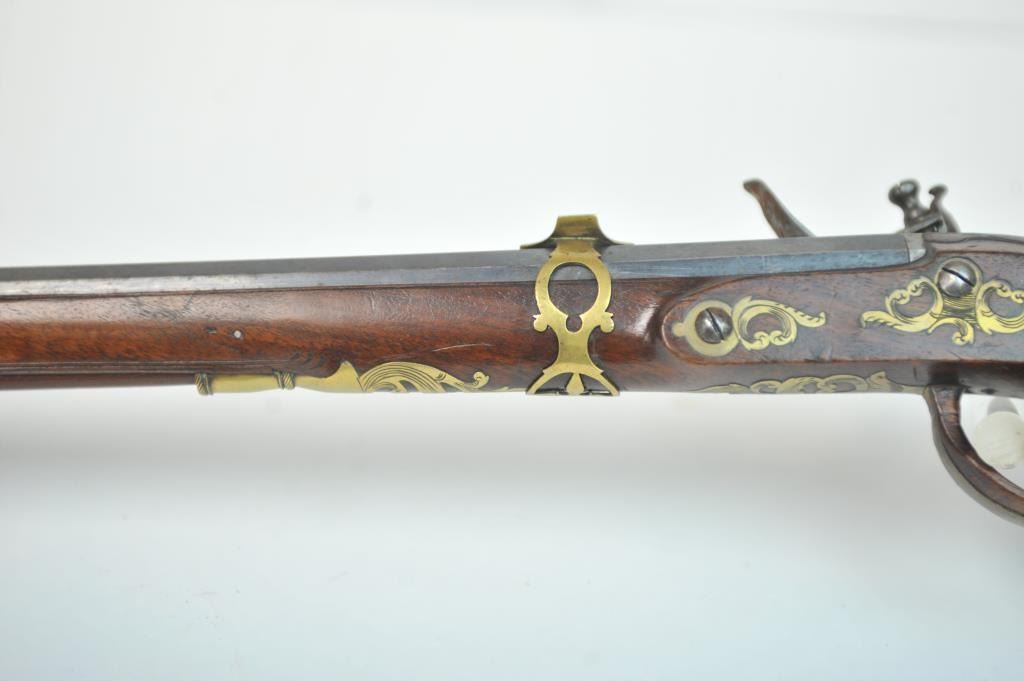 Highly decorated and diminutive size flintlock fowler probably Austrian or German circa early 19th century. Measures 49” overall with nearly 36” barrel of approximately 20GA weighing on 3.75 lbs. Thelock is chiseled in relief with scenes of hunter, dog and game surrounded by scrolls. The stock is finely carved with another hunter and dog shooting a Hapsburg style eagle in a tree, the reverse side of thestock shows finely carved roses at each end of the cheek piece and around tang. The center of the cheek piece shows a crown and shield in silver. All original flintlock parts and circa 1790s-1830s. The barrel shows most of its original blue with minor light beginning rust and erosion. Lock has colored from its original bright slightly with crisp chiseled figures and all original flintlock parts. The stock is crisp and the arm is near fine condition overall. Lock works perfectly and tight. All small parts retained and correct style ramrod. (Antique) Est.: $1750-$3500