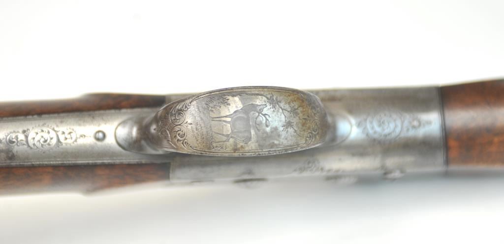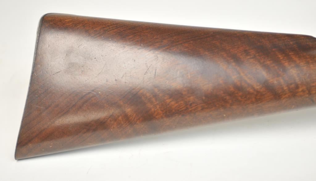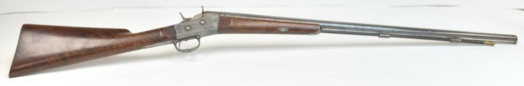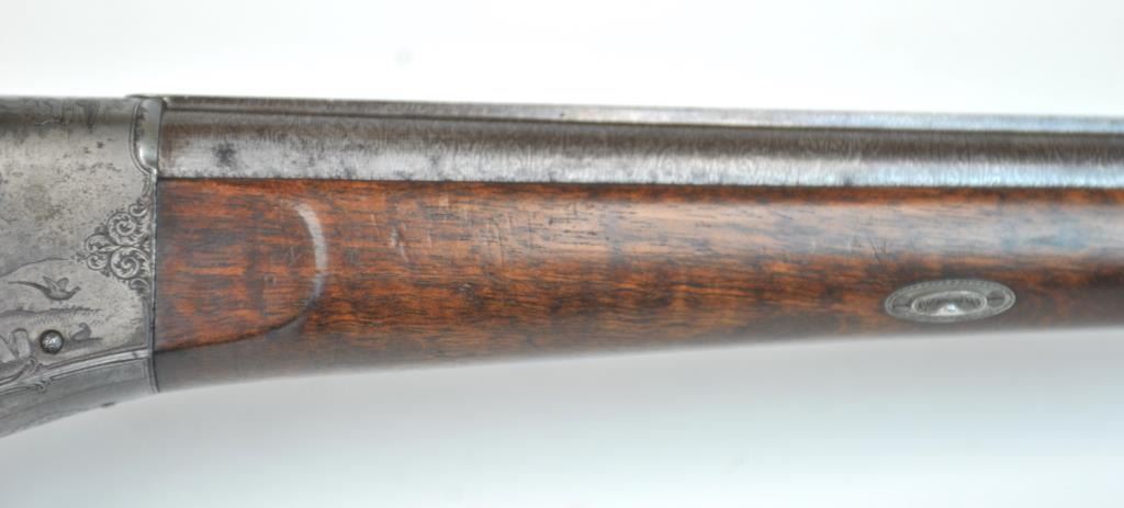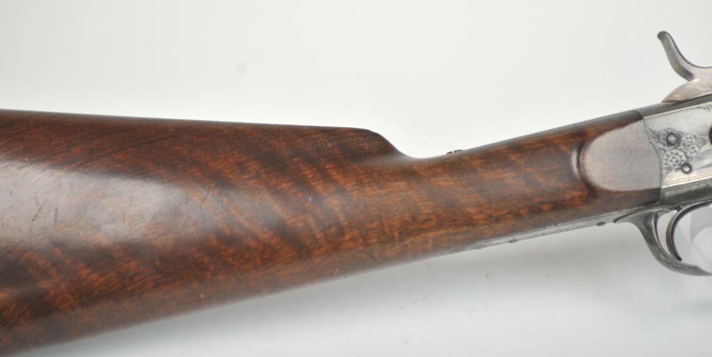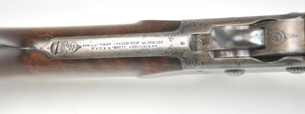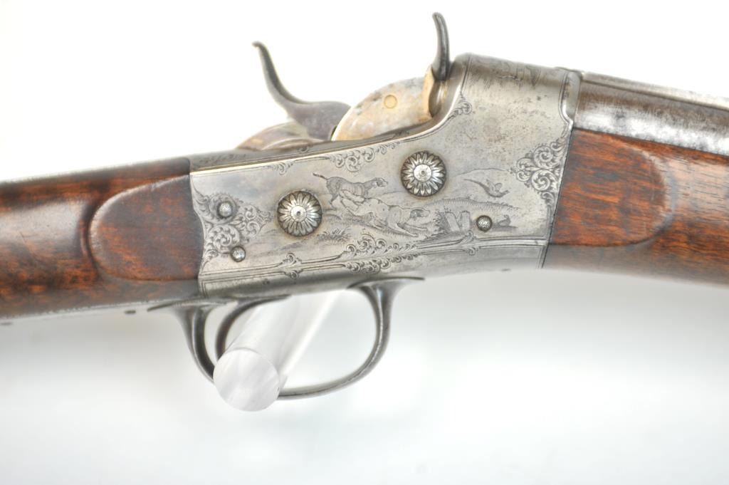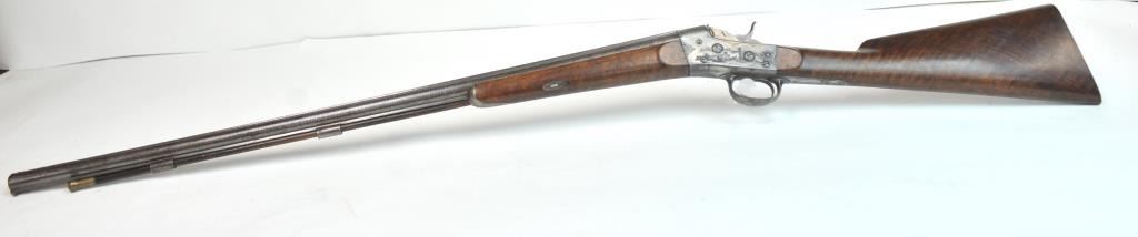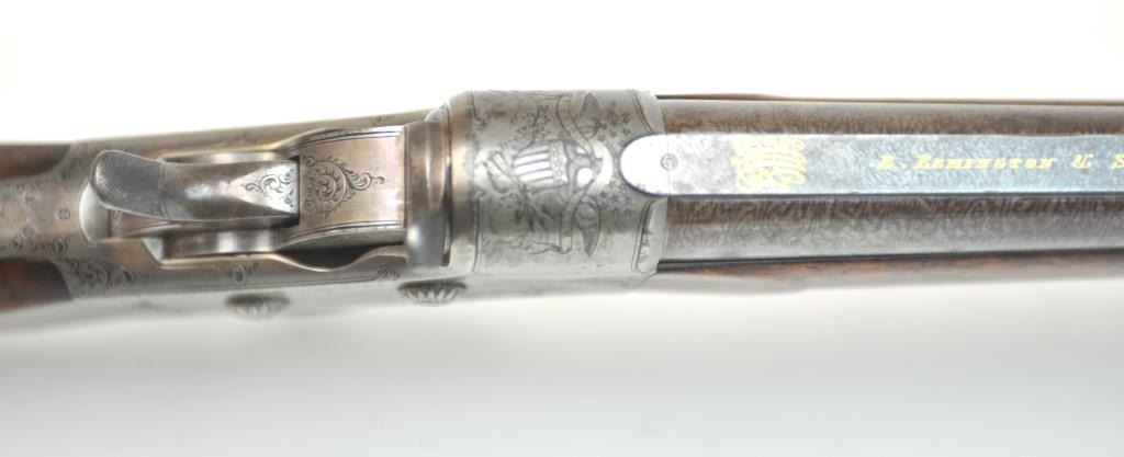 Exhibition Quality Remington Rolling Block Shotgun fully and finely engraved showing American eagle on the breech and banner inscribed “E Plurbis Unum”. The side of the action shows game scenes as does the triggerguard. The barrel has “E. Remington & Sons” in gold and “S.H.G.” Initials for Schuyler, Hartley, and Graham. Measures 48” overall with a 30” barrel of approximately 16 GA centerfire. Marked “Remington” on the tangwith last patent date 1866. Hinged trap in the butt with two compartments for 2 shells. The wood is select grained and remains in near fine condition with minimal handling and slight normal age. The metal condition isfine to excellent also with slight aging only crisp action with bright bore. The engraving is superb and the quality of Gustave Young or Nimschke’s best work. Last sold Gene Herrick collection late 1980s to early 1990s. (Antique) Est.: $5,000-$10,000
