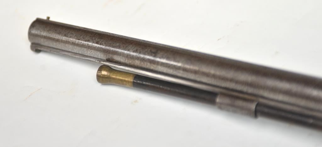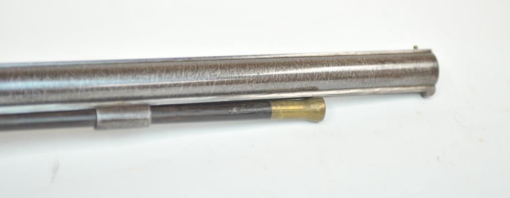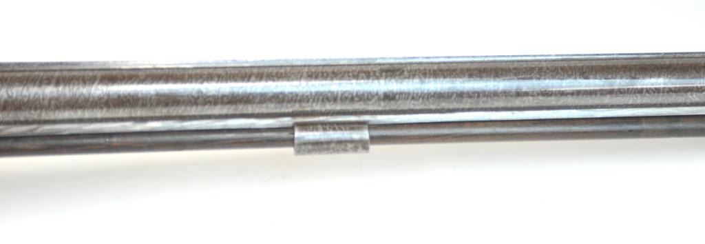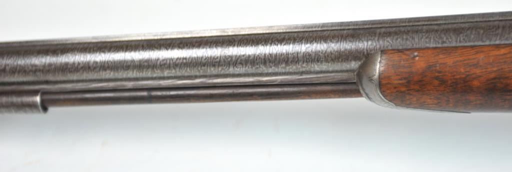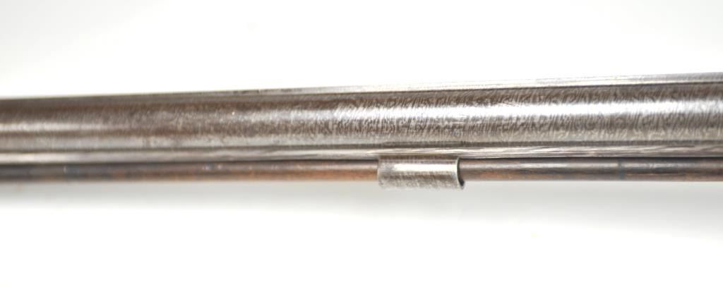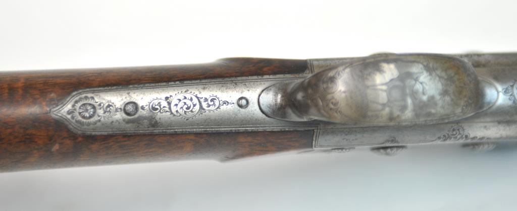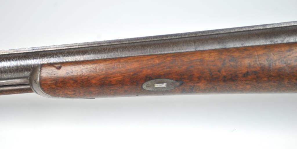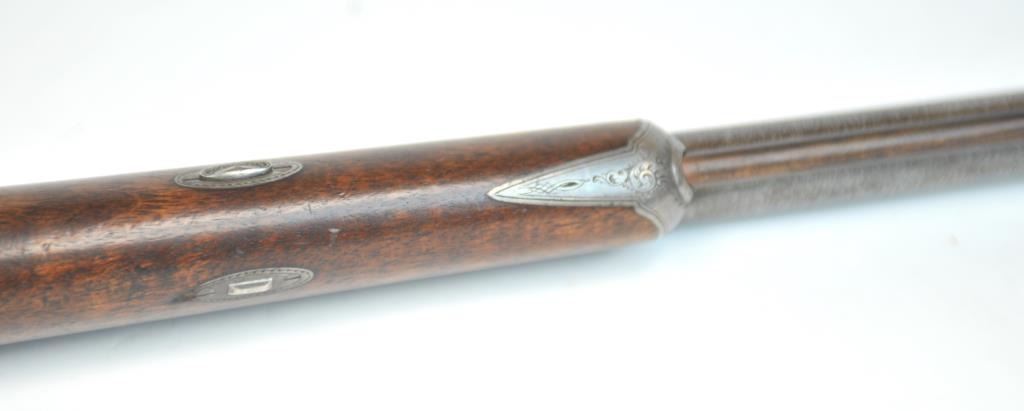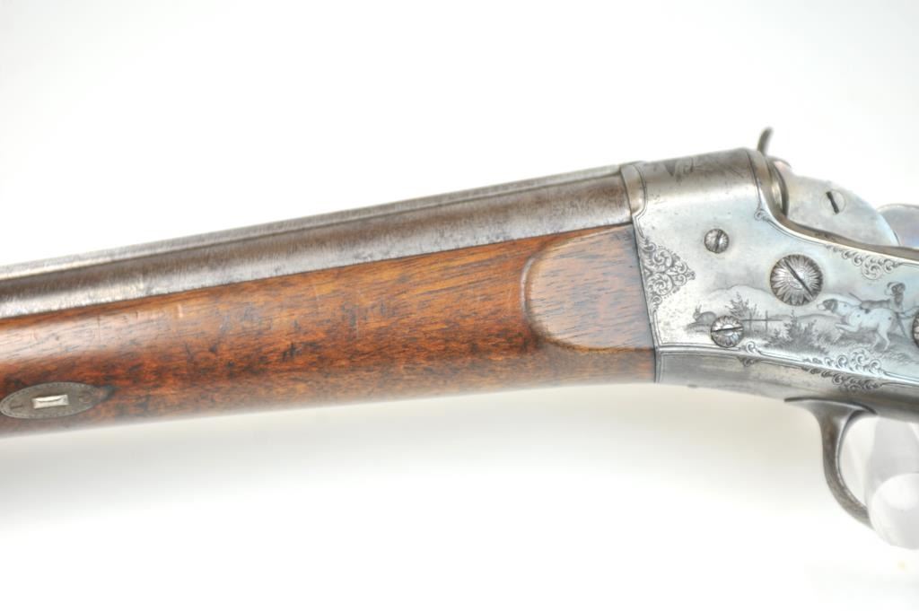 Exhibition Quality Remington Rolling Block Shotgun fully and finely engraved showing American eagle on the breech and banner inscribed “E Plurbis Unum”. The side of the action shows game scenes as does the triggerguard. The barrel has “E. Remington & Sons” in gold and “S.H.G.” Initials for Schuyler, Hartley, and Graham. Measures 48” overall with a 30” barrel of approximately 16 GA centerfire. Marked “Remington” on the tangwith last patent date 1866. Hinged trap in the butt with two compartments for 2 shells. The wood is select grained and remains in near fine condition with minimal handling and slight normal age. The metal condition isfine to excellent also with slight aging only crisp action with bright bore. The engraving is superb and the quality of Gustave Young or Nimschke’s best work. Last sold Gene Herrick collection late 1980s to early 1990s. (Antique) Est.: $5,000-$10,000