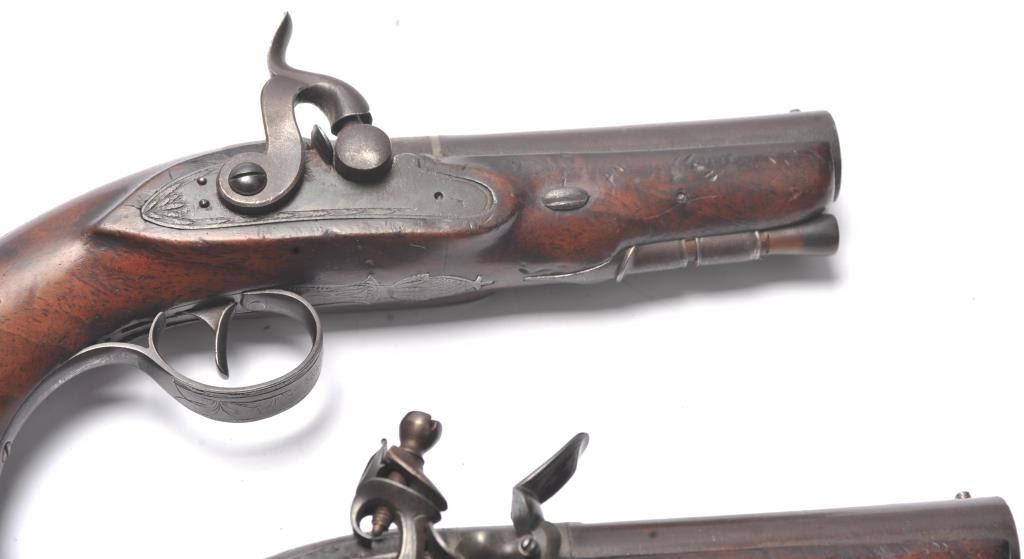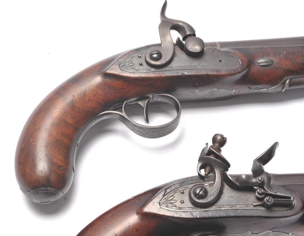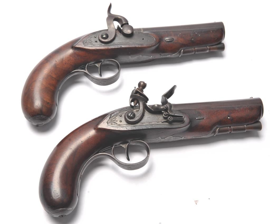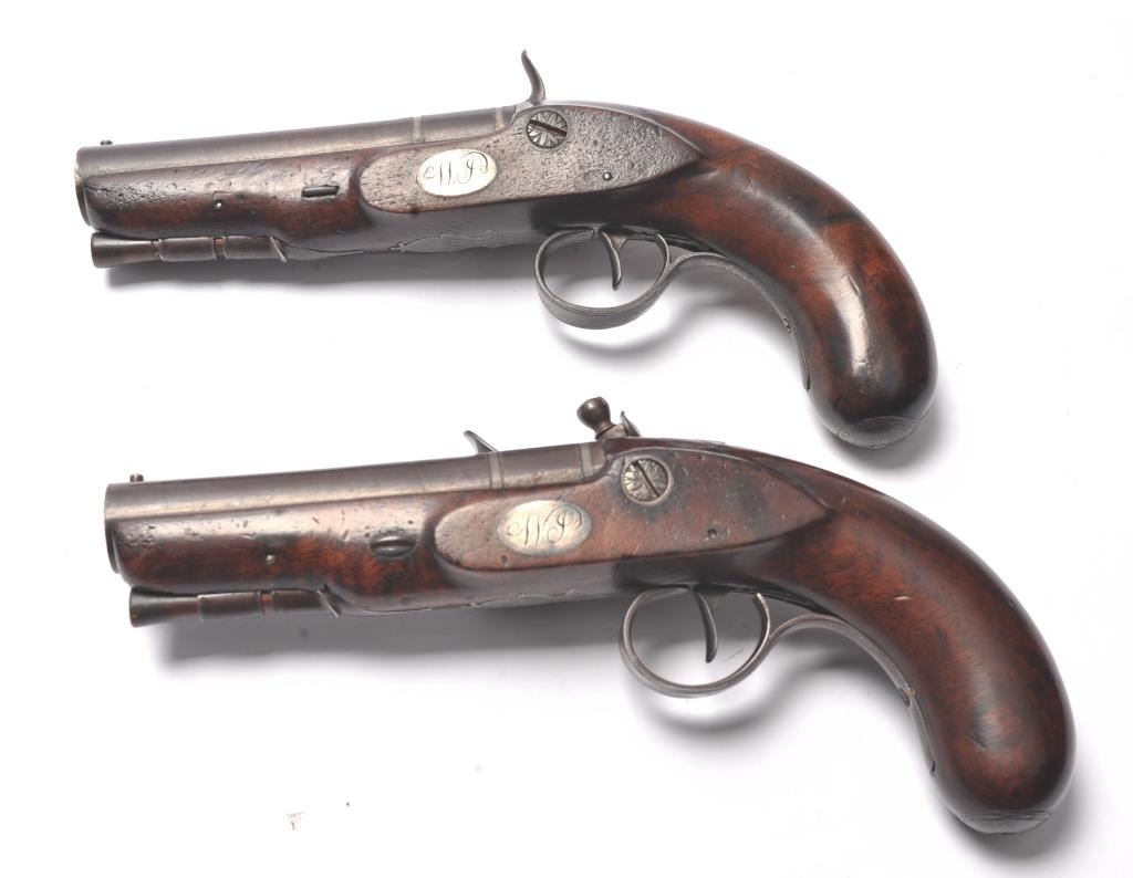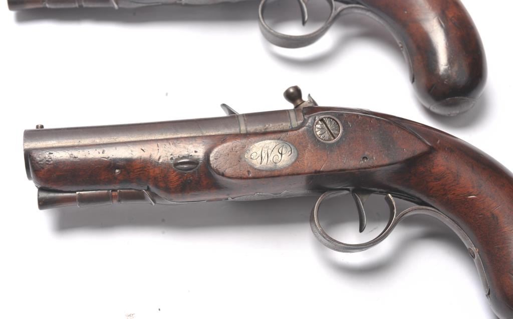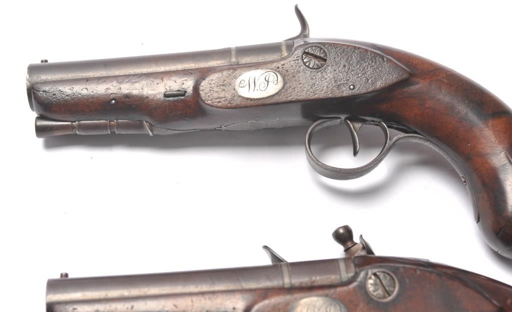Pair of coat size pistols by Pattison Newton Limavady I T R L (Ireland). Circa about 1824. 1 pistol is in original flintlock and its mate is converted to percussion. Measure 8 ¾” overall with 3 ¼” heavy round barrels ofapproximately .56 caliber smoothbore. Iron mounts with silver plaque inlaid in the left side in front of the lock screw engraved “W J”. Double silver bands with gold inlaid maker’s cartouche. Very good originalcondition with brown patina and very good stocks. Note: Interesting the owner only converted 1 pistol probably a cheapskate or practical matter as he may not have trusted the new caps or been able to purchase them.(Antique) Est.: $1000-$2000