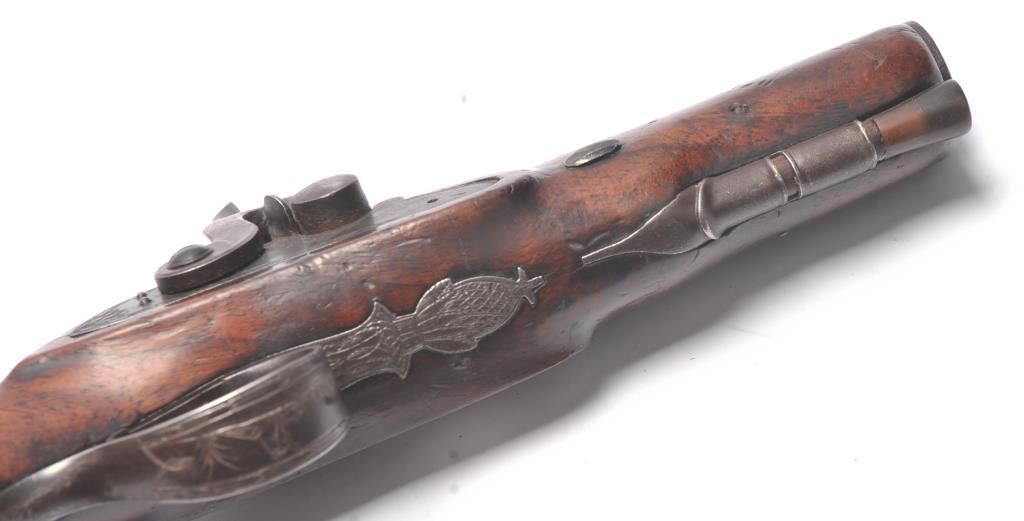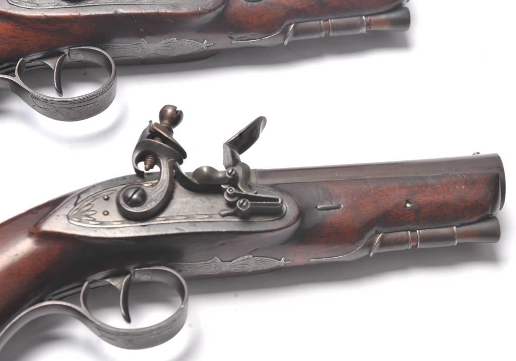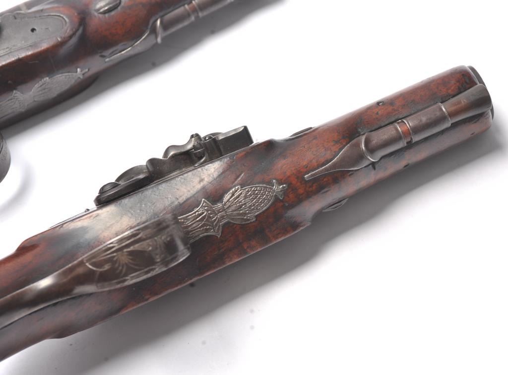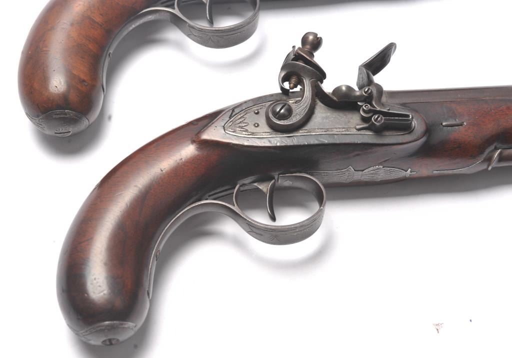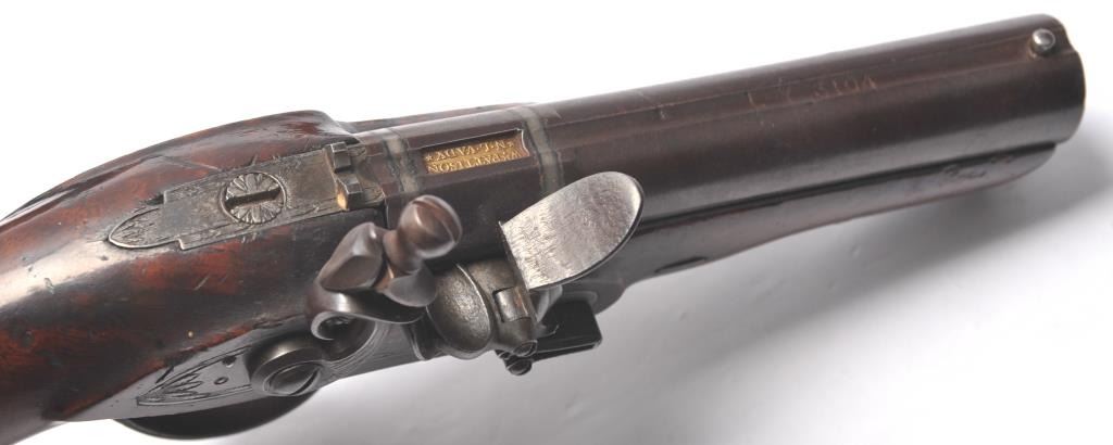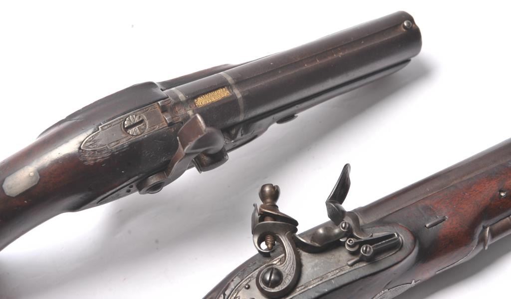 Pair of coat size pistols by Pattison Newton Limavady I T R L (Ireland). Circa about 1824. 1 pistol is in original flintlock and its mate is converted to percussion. Measure 8 ¾” overall with 3 ¼” heavy round barrels ofapproximately .56 caliber smoothbore. Iron mounts with silver plaque inlaid in the left side in front of the lock screw engraved “W J”. Double silver bands with gold inlaid maker’s cartouche. Very good originalcondition with brown patina and very good stocks. Note: Interesting the owner only converted 1 pistol probably a cheapskate or practical matter as he may not have trusted the new caps or been able to purchase them.(Antique) Est.: $1000-$2000