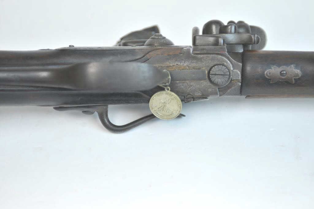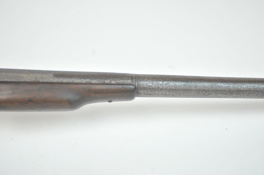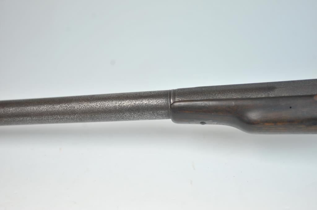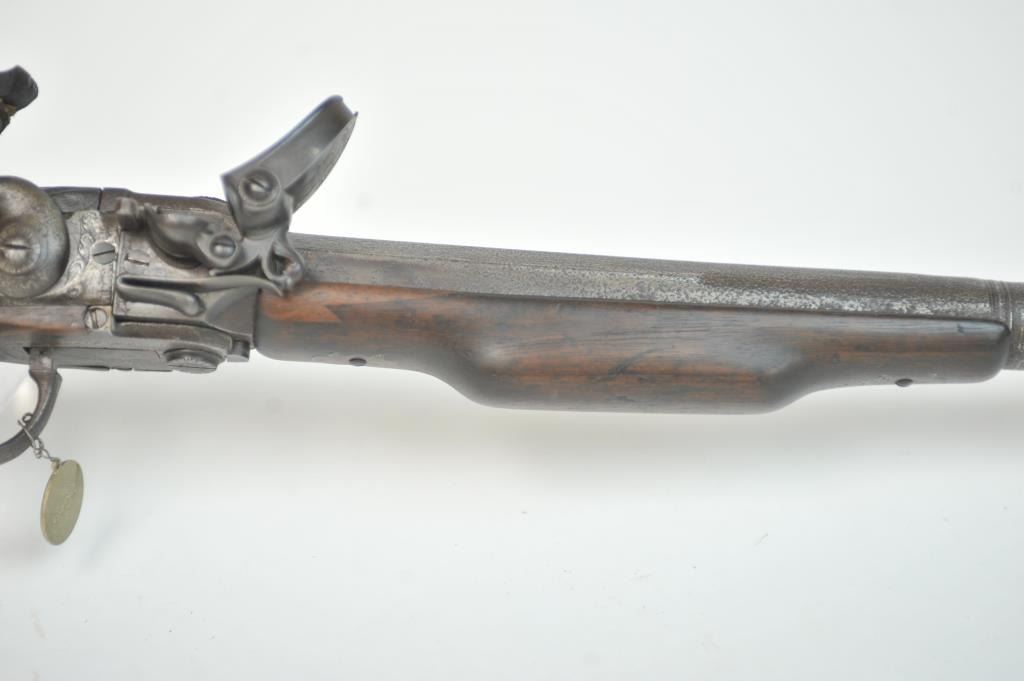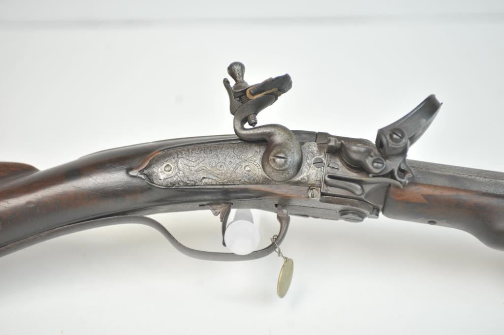 Early and Important breech loading and “self-priming flintlock rifle by H. Barne London” circa 1638-1661 from the William “Keith” Neal collection tag #G562 still attached. The gun swings to the side andexposes the breech and a removable pre-loading metal cartridge inserted and the frizzen primes the pan from internal magazine. The gun shows early engraving on the lock and retains its original hammer,frizzen and small parts. The metal surfaces show light to moderate scattered pitting. The fore end shows well done restoration. Scattered light to moderate pitting with deeper pitting on the barrel. The butt stockIs good. Ringed muzzle and about .60 caliber rifled bore. Measures 43” overall with a nearly 28” barrel. It would be difficult to find an earlier English breech loading rifle as this is the earliest we have viewed in 52years. A museum quality rarity. (Antique) Est.: $5,000-$10,000