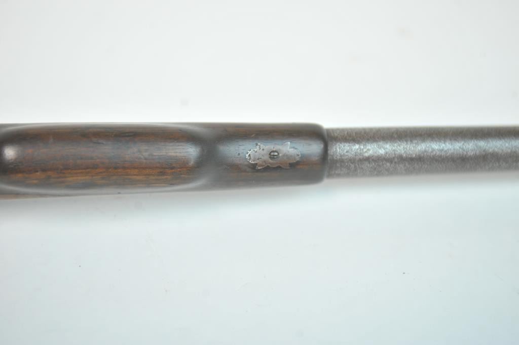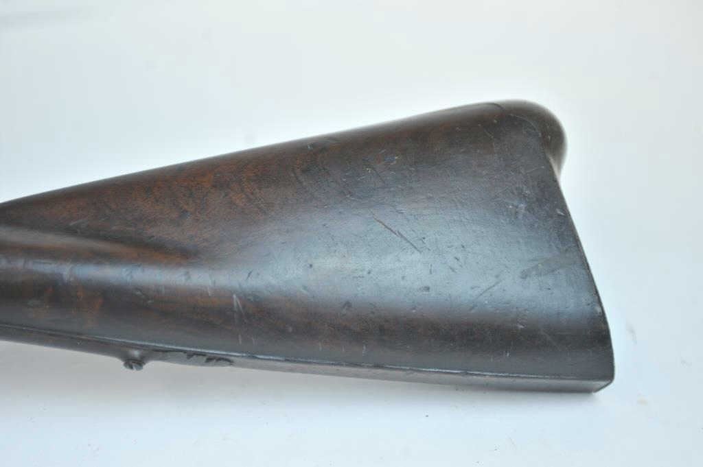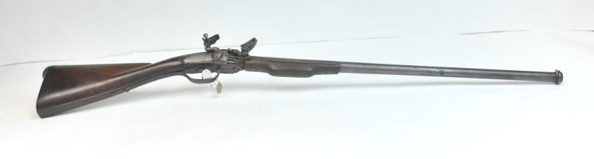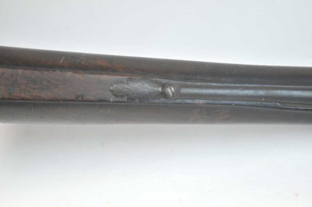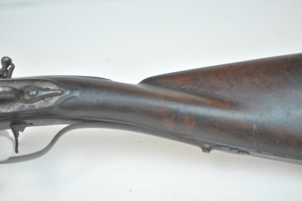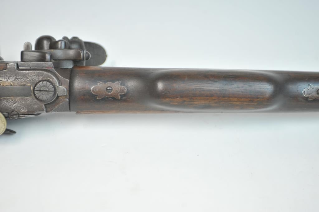 Early and Important breech loading and “self-priming flintlock rifle by H. Barne London” circa 1638-1661 from the William “Keith” Neal collection tag #G562 still attached. The gun swings to the side andexposes the breech and a removable pre-loading metal cartridge inserted and the frizzen primes the pan from internal magazine. The gun shows early engraving on the lock and retains its original hammer,frizzen and small parts. The metal surfaces show light to moderate scattered pitting. The fore end shows well done restoration. Scattered light to moderate pitting with deeper pitting on the barrel. The butt stockIs good. Ringed muzzle and about .60 caliber rifled bore. Measures 43” overall with a nearly 28” barrel. It would be difficult to find an earlier English breech loading rifle as this is the earliest we have viewed in 52years. A museum quality rarity. (Antique) Est.: $5,000-$10,000