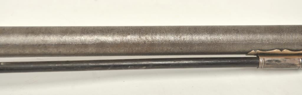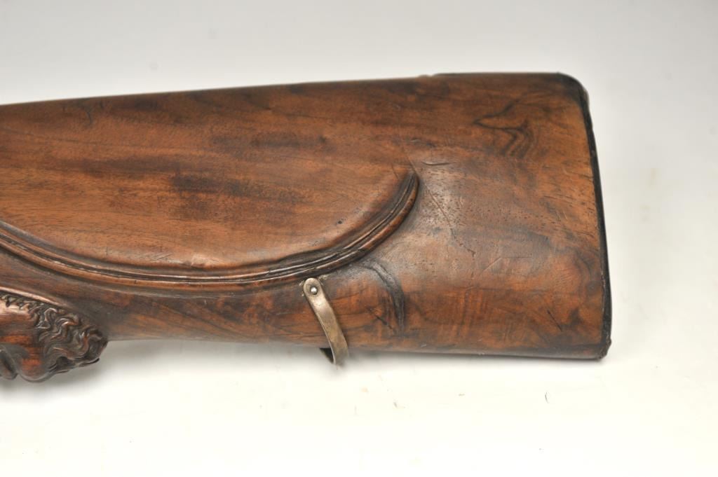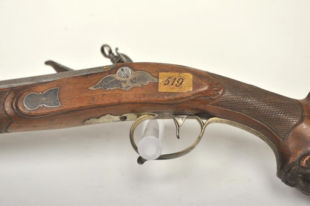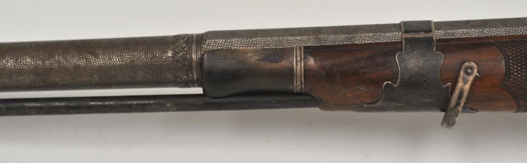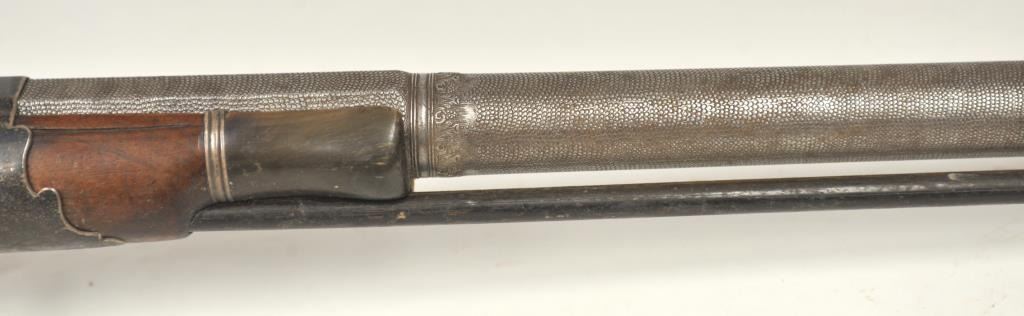 High Grade Italian Flintlock Fowler utilizing English lock showing gold maker’s cartouche of H. Nock. The breech end of the barrel shows 5-pointed crown with R monarchs initial and FABR DE Napoli in cartouche indicatingkingdom of Naples. The barrel is pebble grain decorated with gold spider shaped front sight, chiseled ring at joint between octagon and round and engraved tang. Silver mounts with raised carved portrait of a satyr on the bottom of the grip that is checkered to match fore end. Horn end cap, matching ramrod tip, and butt plate which shows minor damage and rust in butt screw. Measures 47” overall with a 31” barrel of 19 GA smoothbore. Thecondition is very good plus and may clean to fine with some T.L.C. A real quality arm utilizing the best English lock in a superb Italian made gun. (Antique) Est.: $1500-$3000