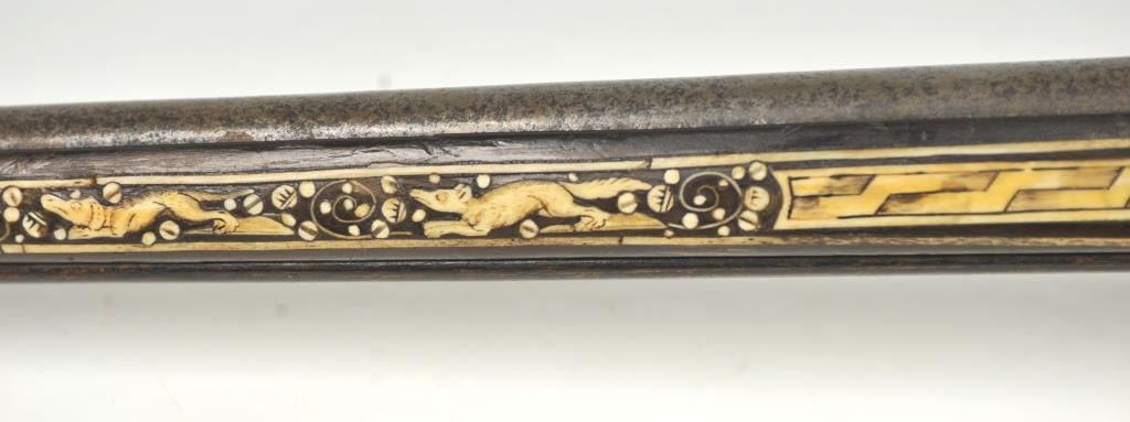 Germanic style Wheelock rifle with fully and finely inlaid stock by Spitzer circa 19th century. The lock and barrel are genuine to the late Wheelock era showing enclosed wheel. The lock is nicely engraved with scrolls and figures that are worn down. The bone inlay is high quality and shows game scenes, plaques and geometric designs. The inlay is 98%-99%+ intact. Matching ramrod tip and well forged trigger guard. 1 lock screw ismissing and mechanism, spring, and chain are intact. Patina finish with some minor pitting. A very good looking Wheelock that was decorated over a hundred years later than its manufacture when redecorating greathalls of Europe and castles in the 19th century. (Antique) Est.: $2000-$4000