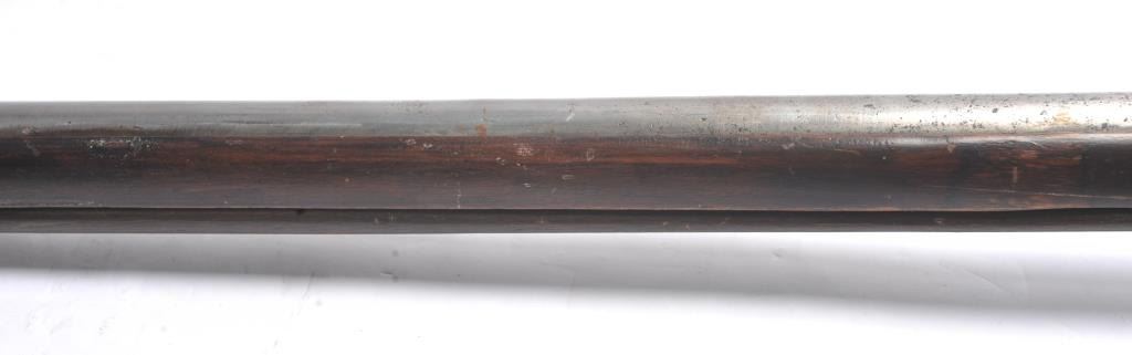 Spanish Miquelet Flintlock Musket marked in 3 maker’s cartouches Gabiola (Eibar Spain) circa early 19th century. The metal surfaces show cleaning long ago with scattered light to moderate pitting and erosion. The stockhas had some areas of restoration and refinishing. The gun measures 55” overall with a 39” octagon to round barrel of approximately .64-.66 caliber smoothbore or about 16 GA. Original flintlock parts on thelock with gold lined pan. The lock cocks but slips off and does not always hold needing repair or adjustment. There is a loss of wood beneath the frizzen spring measuring approximately 1” by ¼”-1/2”. A good maker and a scarce long arm that could have traveled to colonies of Spain in the new world. (Antique) Est.: $750-$1500