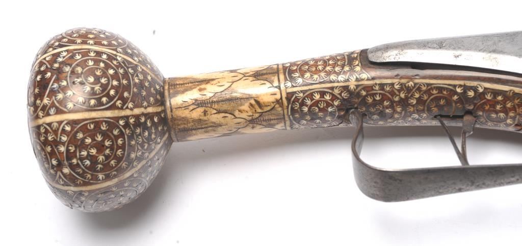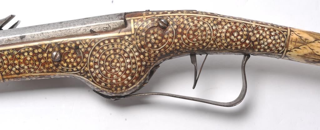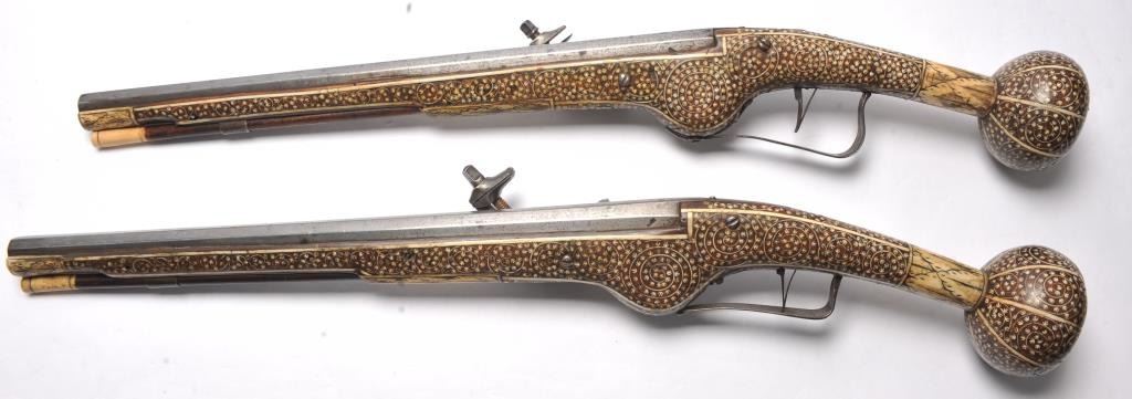 Pair of Ornately Inlaid Wheelock Pistols showing armory marks on the barrels. This pair originally made in early to Mid-17th century and inlaid in the 19th century probably by Spitzer. The locks are completeincluding chain and springs. The inlay work is top quality and very profuse with Saxson style crests at the centers of the butt. Correct style ramrods with bone tips to match. The condition is very good plus with96%-98% inlays intact and only small imperfections. Measures 24” overall with 15 ¼” octagon barrels of approximately .56 caliber smoothbore. Provenance: Theodore Dexter catalog of Albert Foster collection(Former President of Colt Firearms) early 1950s where he is pictured with this pair. (Antique) Est.: $6,000-$12,000
