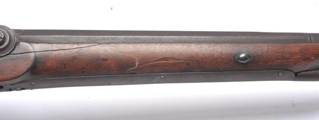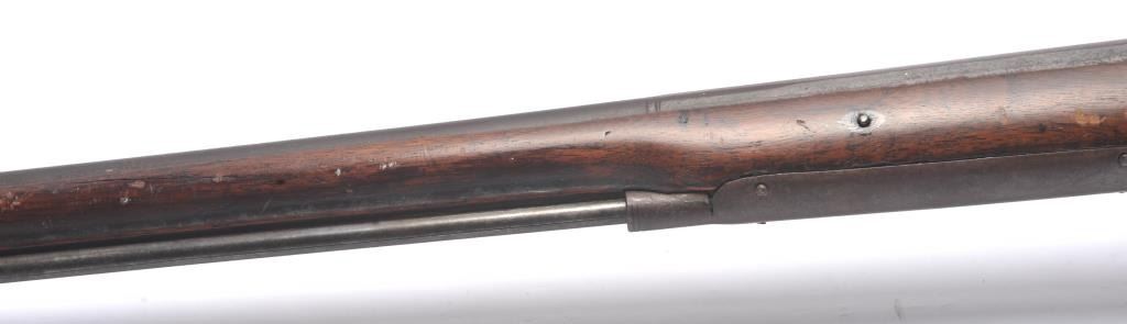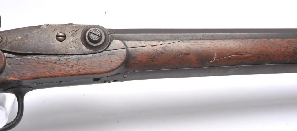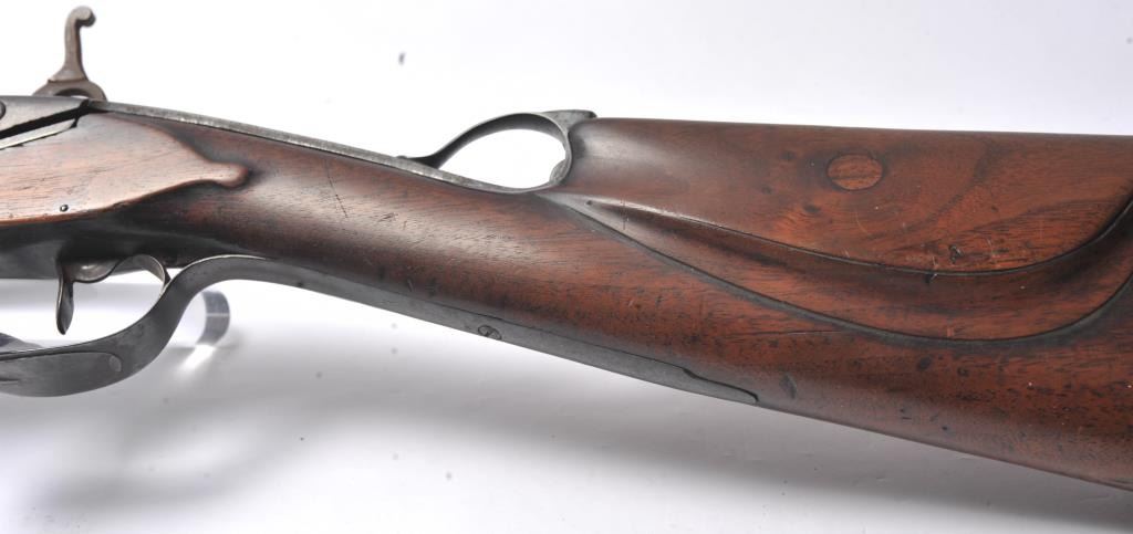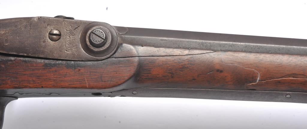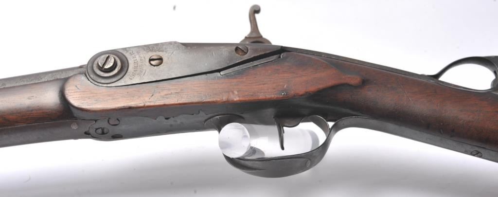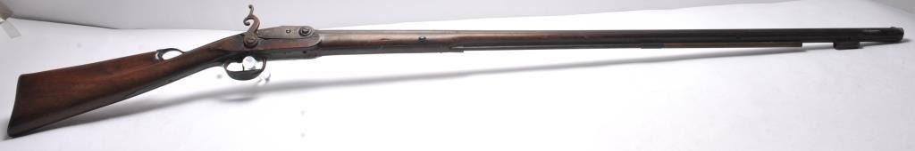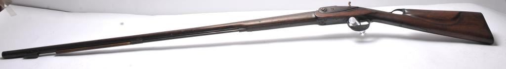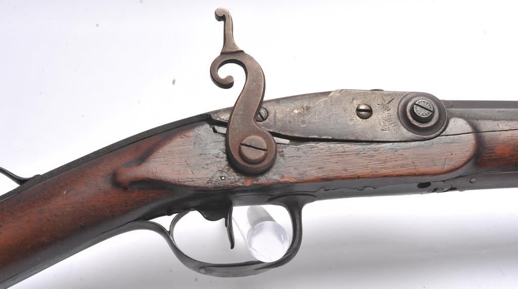 Ultra-rare breech loading fowling piece signed on the left side of the action “Charier Baltimore”. John Charier of Baltimore worked 1822-1836. Consignors note on the trigger guard states “Trial of 1837 at West Point”. The action lifts up to expose a nipple mounted in the breech end of the barrel and is fired by a striker activated by the outside hammer protecting shooter’s eyes from cap and firing. The gun is simplycontracted and full stocked to the muzzle. Measures 56” overall with a 37” half round to octagon barrel of approximately .58 caliber smoothbore or 24 GA. The condition is fair to good with dark brown patina and wood lightly cleaned with steel wool showing a few stress cracks and imperfections. Old period ramrod retained. Provenance: The estate of Gregory T. Fisher, Little Johns, Johnny Bassett collection who obtained from iconic collector Henry Stewart in trade. Mr. Stewart knew of 3 such arms by Charier of Baltimore of which one was in a museum. This is a museum quality rarity. (Antique) Est.: $10,000-$20,000