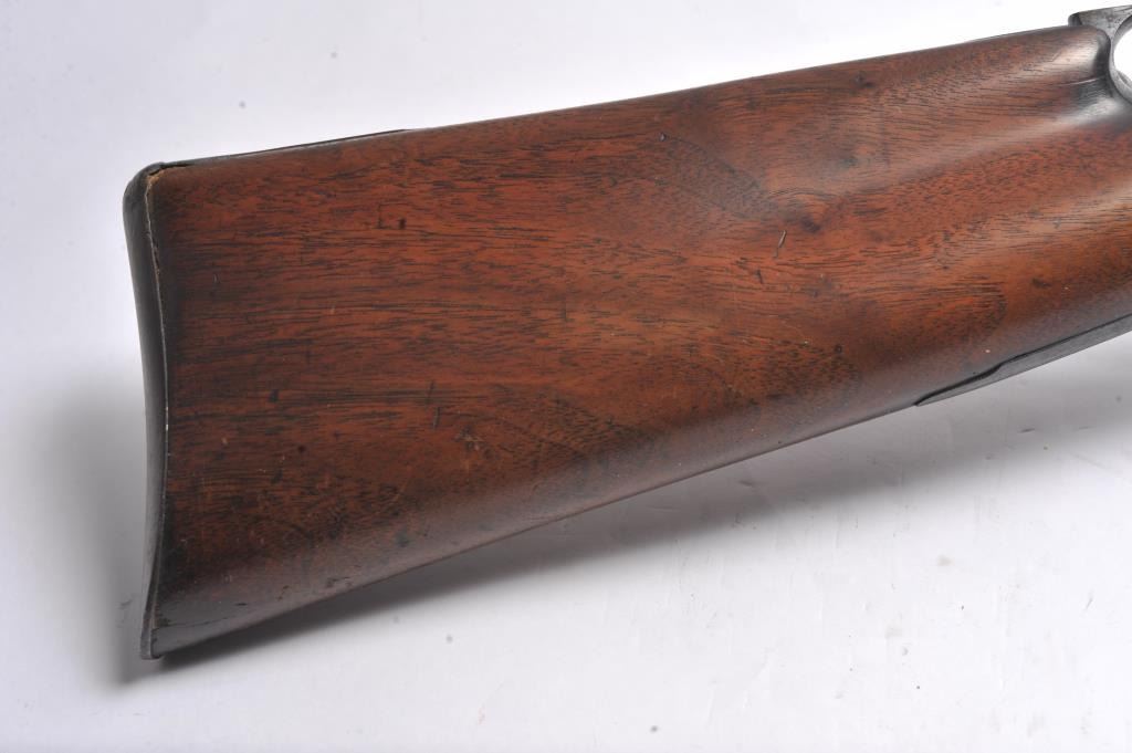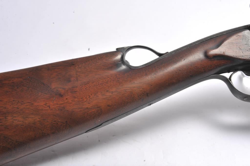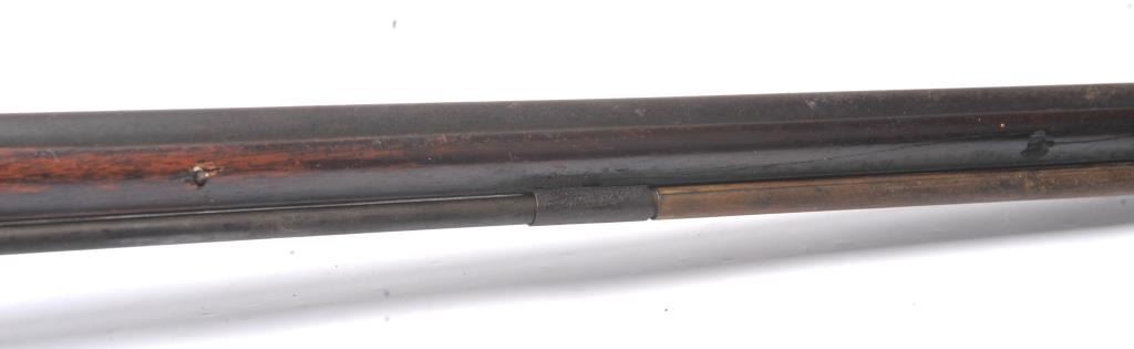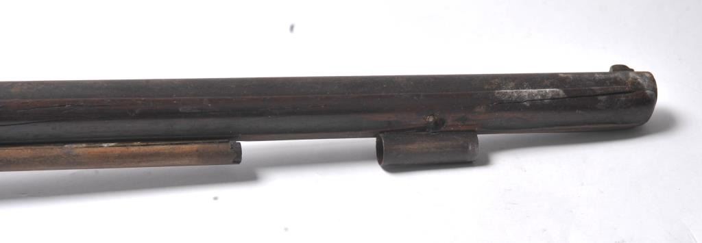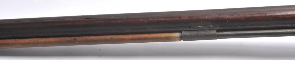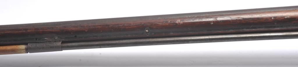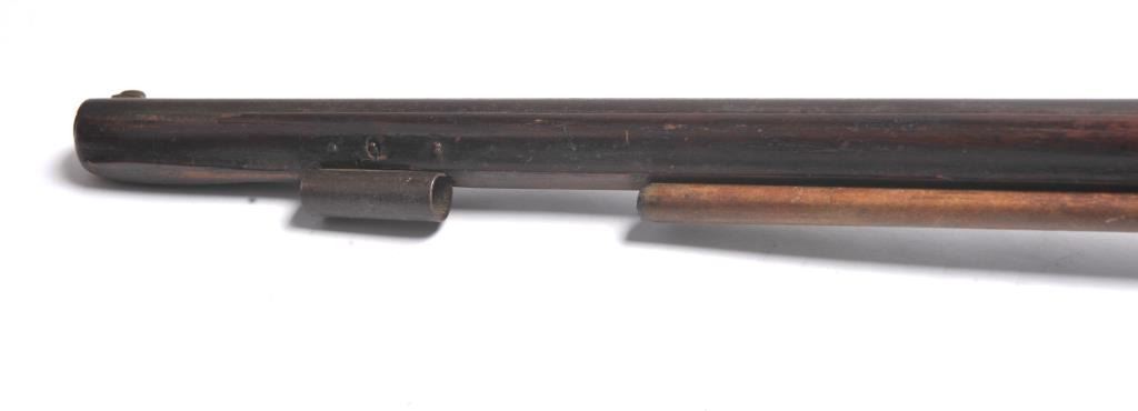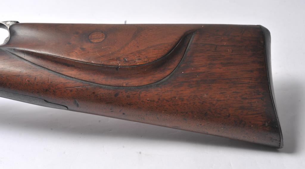 Ultra-rare breech loading fowling piece signed on the left side of the action “Charier Baltimore”. John Charier of Baltimore worked 1822-1836. Consignors note on the trigger guard states “Trial of 1837 at West Point”. The action lifts up to expose a nipple mounted in the breech end of the barrel and is fired by a striker activated by the outside hammer protecting shooter’s eyes from cap and firing. The gun is simplycontracted and full stocked to the muzzle. Measures 56” overall with a 37” half round to octagon barrel of approximately .58 caliber smoothbore or 24 GA. The condition is fair to good with dark brown patina and wood lightly cleaned with steel wool showing a few stress cracks and imperfections. Old period ramrod retained. Provenance: The estate of Gregory T. Fisher, Little Johns, Johnny Bassett collection who obtained from iconic collector Henry Stewart in trade. Mr. Stewart knew of 3 such arms by Charier of Baltimore of which one was in a museum. This is a museum quality rarity. (Antique) Est.: $10,000-$20,000
