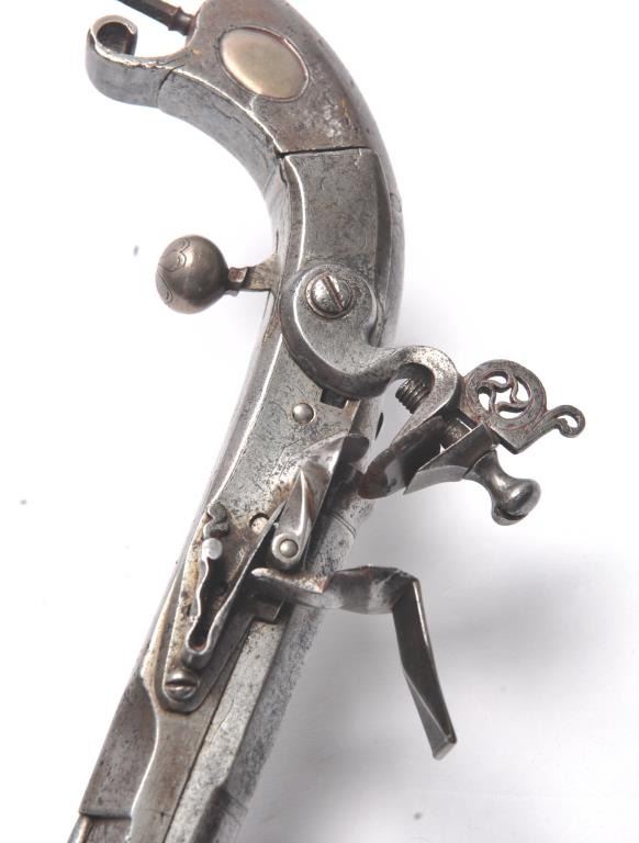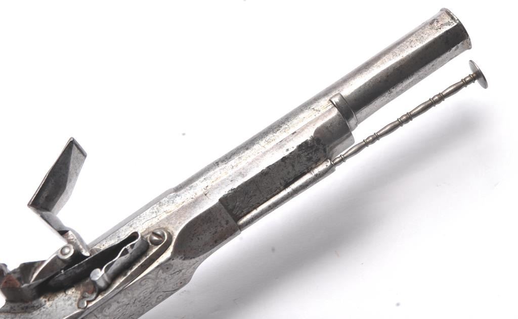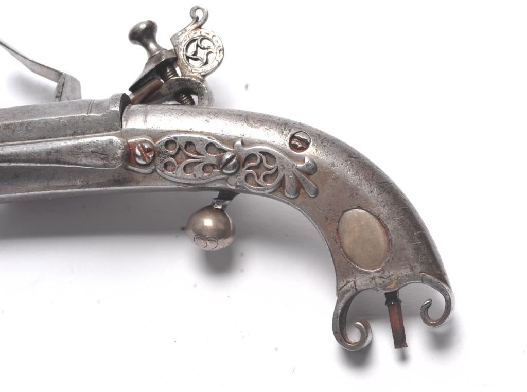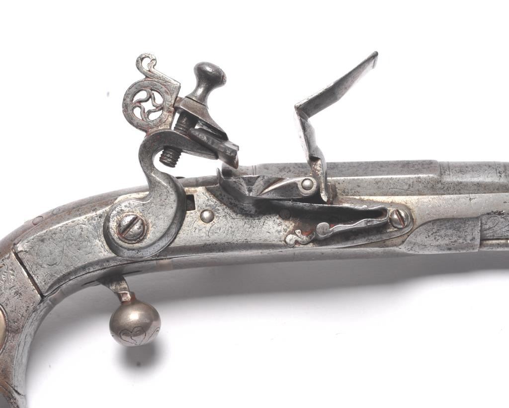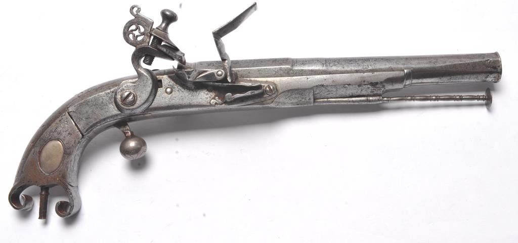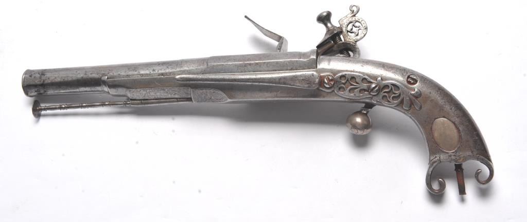 John Campbell signed Scottish Flintlock pistol with rams horn shaped butt and silver inlaid stock. Fancy pierced back, hammer and belt hook. Two silver ovals for owner’s crest or initials rubbed out as it was illegal for Scott’s to retain arms after Colodan unless specifically allowed by British rulers. Measures 11” overall with a 7” barrel showing octagon to round back to octagon fancy barrel. The pick is oddly made with no ballat the end and a square shaft. Usually the pick would have a silver ball to match the trigger and may have been purposely made this way for another purpose as it shows proper age. All correct flintlock era parts andworks well. The condition is good with some minor pitting, erosion and natural aging. The rammer is fancy turned and may be the original. A very desirable maker and we would date this pistol 1720s to 1750. (Antique)Est. $2000-$4000