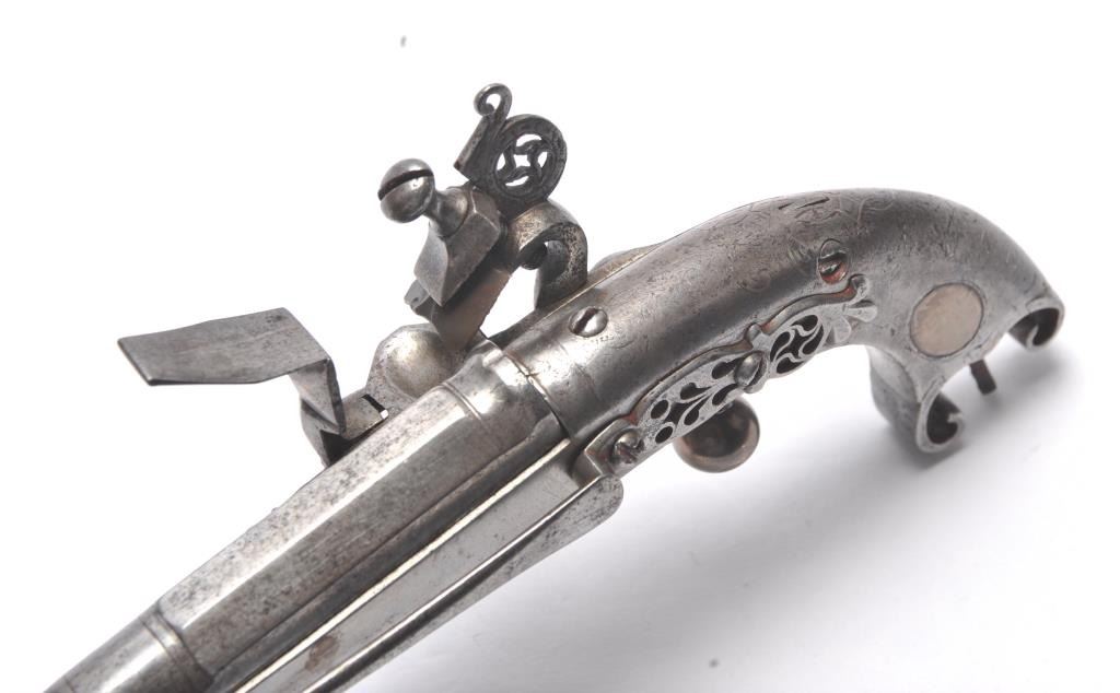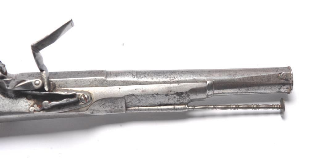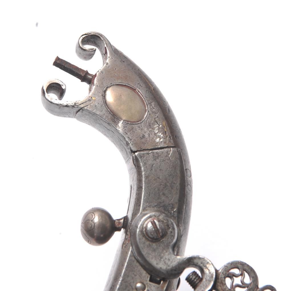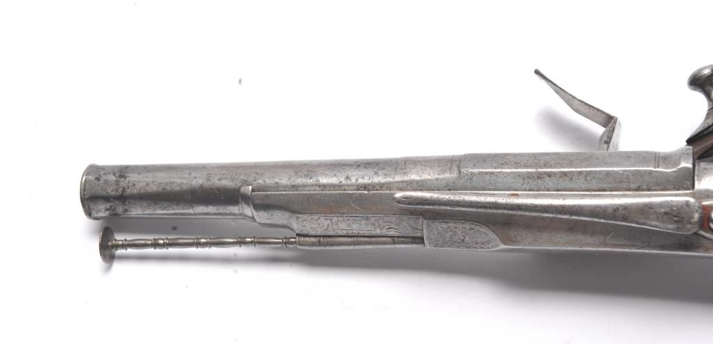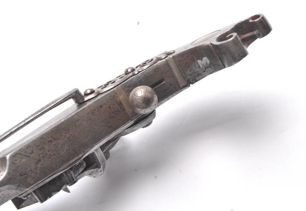 John Campbell signed Scottish Flintlock pistol with rams horn shaped butt and silver inlaid stock. Fancy pierced back, hammer and belt hook. Two silver ovals for owner’s crest or initials rubbed out as it was illegal for Scott’s to retain arms after Colodan unless specifically allowed by British rulers. Measures 11” overall with a 7” barrel showing octagon to round back to octagon fancy barrel. The pick is oddly made with no ballat the end and a square shaft. Usually the pick would have a silver ball to match the trigger and may have been purposely made this way for another purpose as it shows proper age. All correct flintlock era parts andworks well. The condition is good with some minor pitting, erosion and natural aging. The rammer is fancy turned and may be the original. A very desirable maker and we would date this pistol 1720s to 1750. (Antique)Est. $2000-$4000