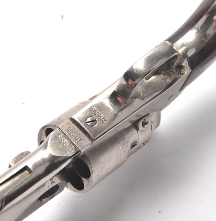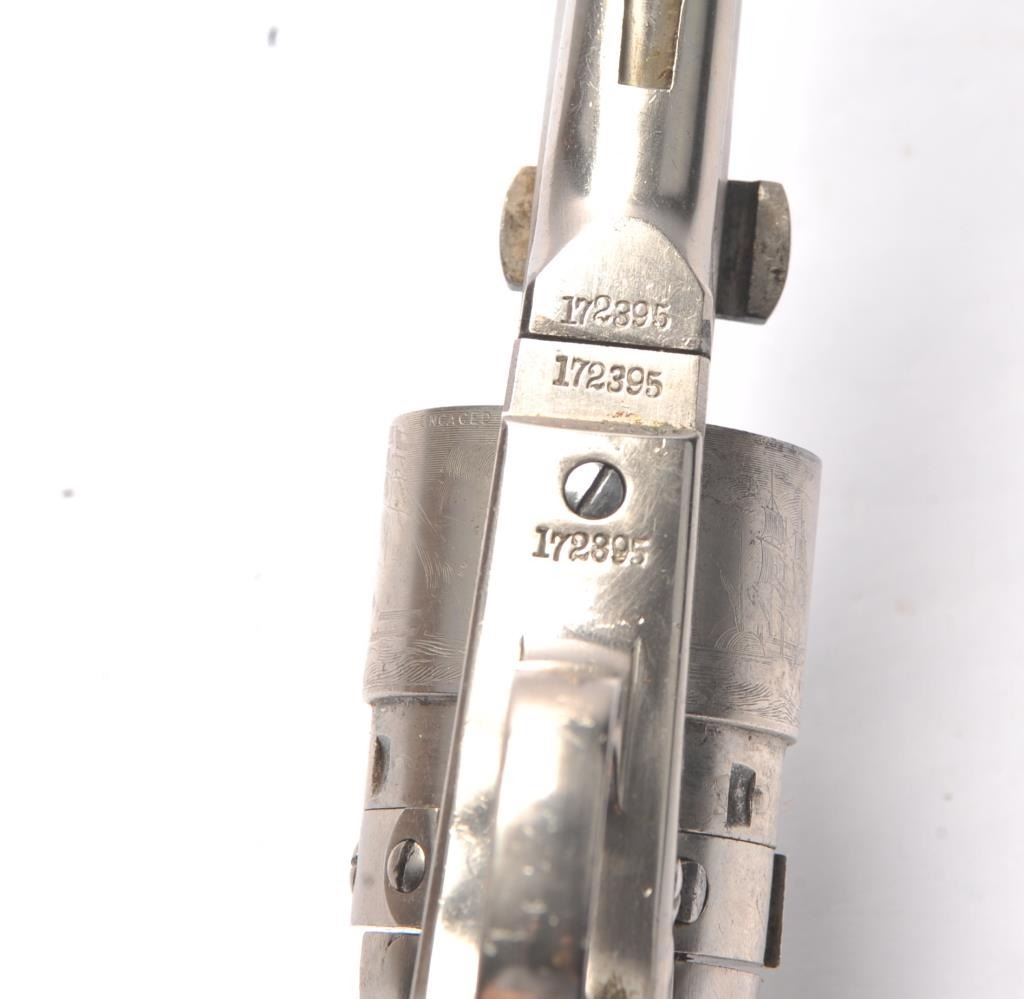 Colt 1860 Army with Thuer style conversion with nickel plating and burl wood grips, S/N 172395. It is our opinion this Colt was originally made as a percussion arm and Thuer cylinder added and nickel plated at the time of the conversion as the barrel does not have the radical Thuer cut out nor does the plunger on the rammer show tapping for use with Thuer tool. The ring and cylinder are stamped 168 on the backs and the cylinder iscorrectly patent marked and a genuine working Thuer cylinder that ejects. The numbers match including the wedge. 90%-95% old period nickel remains with some minor loss mostly at the muzzle. Great bore and sharp and crisp overall. The grips retain 50%-70% varnish and are very good plus to almost fine. Most of its cylinder scene remains and nickel has that right “satin” color and is 19th century applied. (Antique) Est.; $3000-$6000