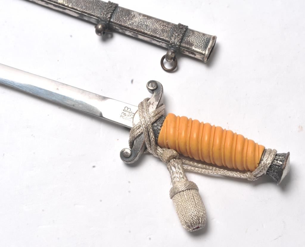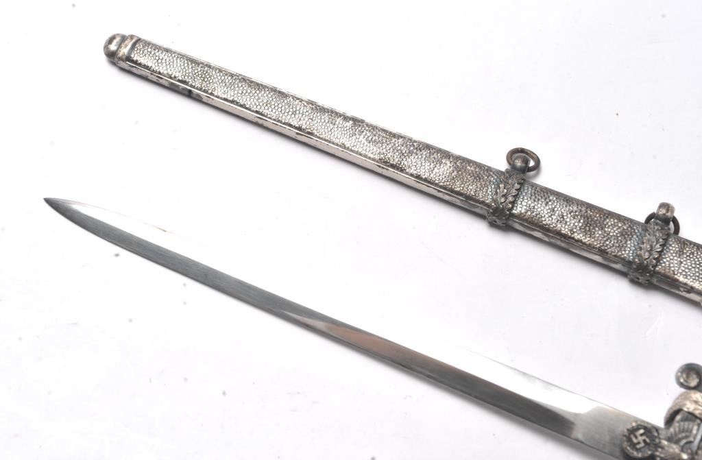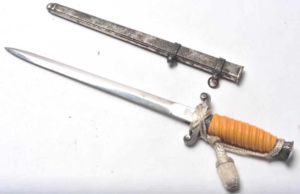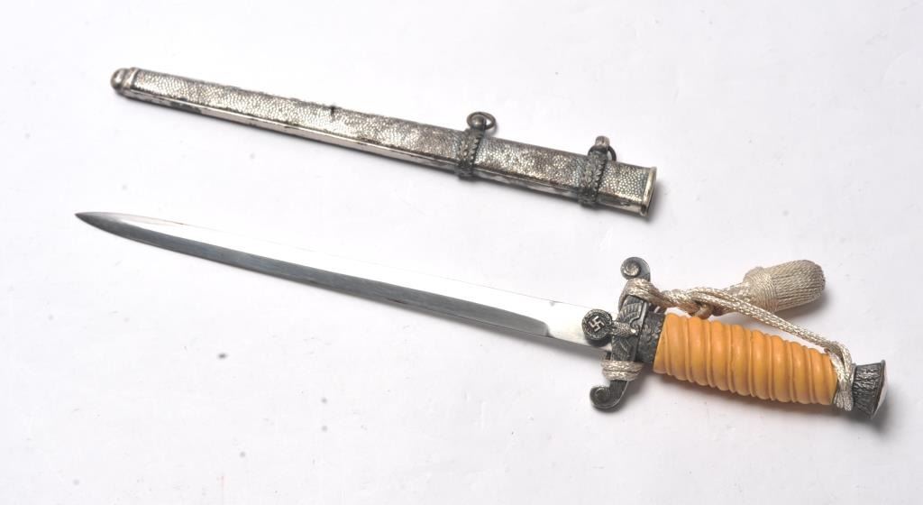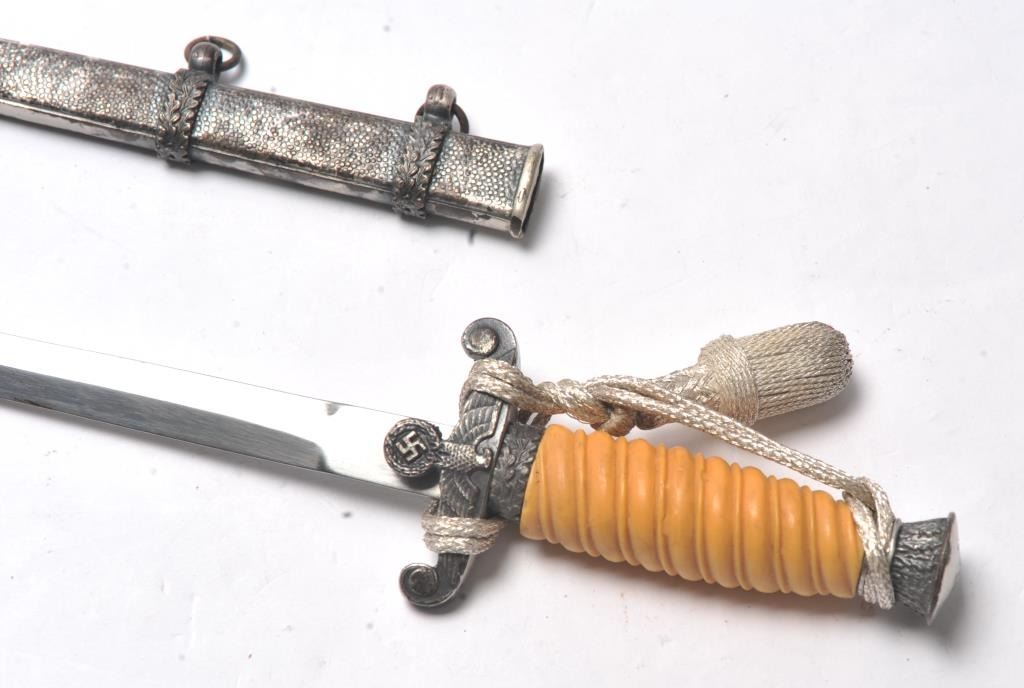 Authentic Nazi Era Salesman’s sample miniature dagger with portapie and scabbard. Eickhorn Solingen trademark. Measures 9 ½” overall blade is excellent. Scabbard shows aging and loss. Very good overall. Est.:$350-$700
