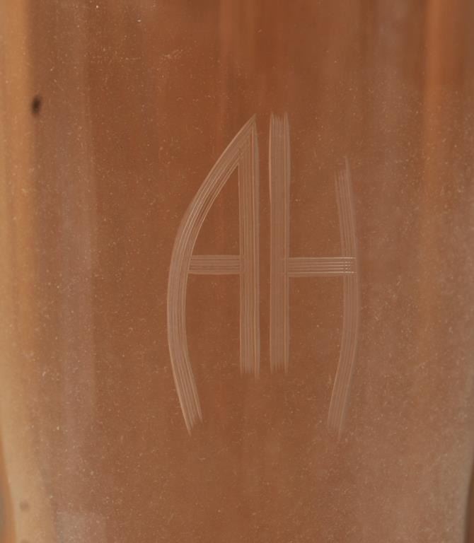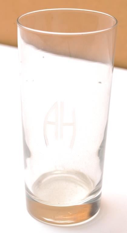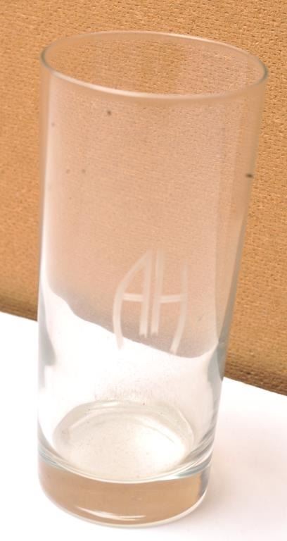 “A.H.” etched tall beer glass measuring 6 ¼” in height. The monogram is similar to thos in Major Snyder’s book “Treasure Trove Looting of the 3rd Reich” from whom this was purchased. Est.: $300-$600