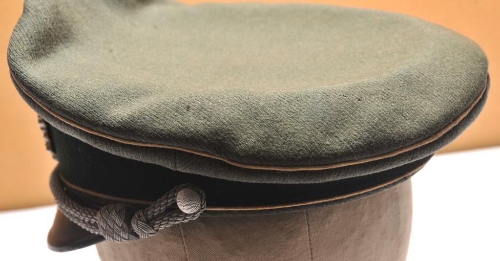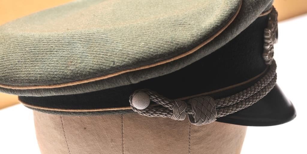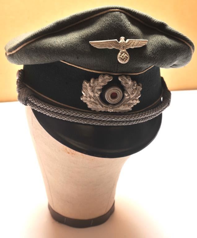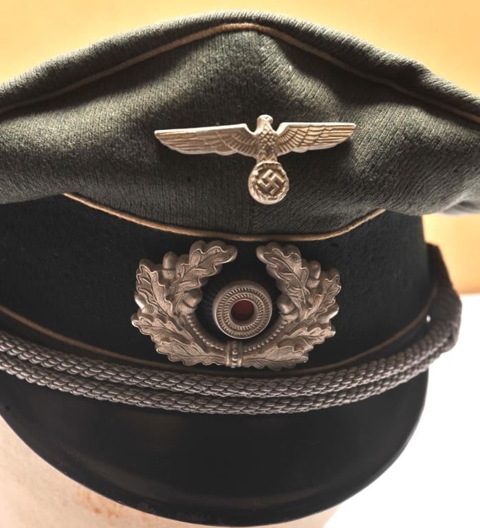 Authentic Luftwaffe cap with insignia and officer’s cord. Very good condition showing sweat stains in the interior and minor aging to the body and brim. An 8 plus on 1-10 scale. Est.: $350-$700