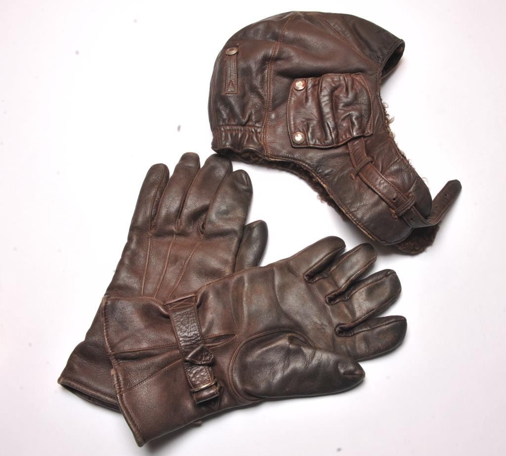Authentic German Aviators Brown Leather Cap and Gloves from Nazi era. Brown died sheep wool interior. In box to preserve. Est.: $175-$350