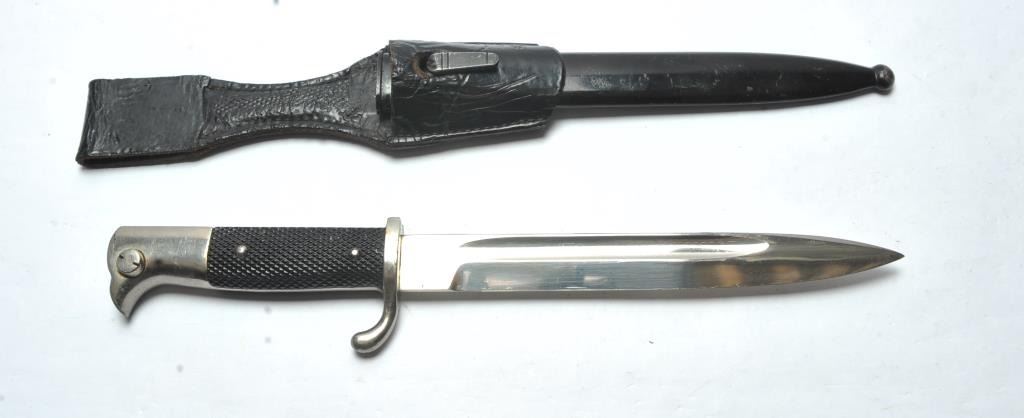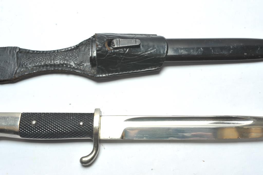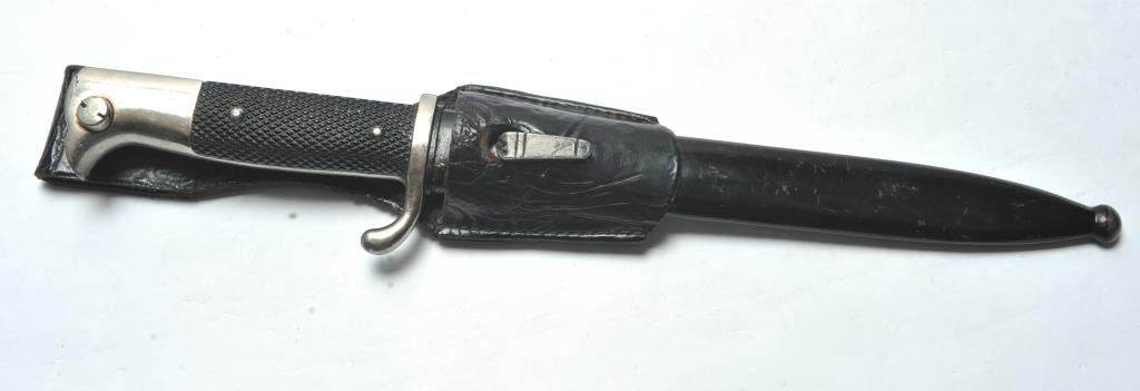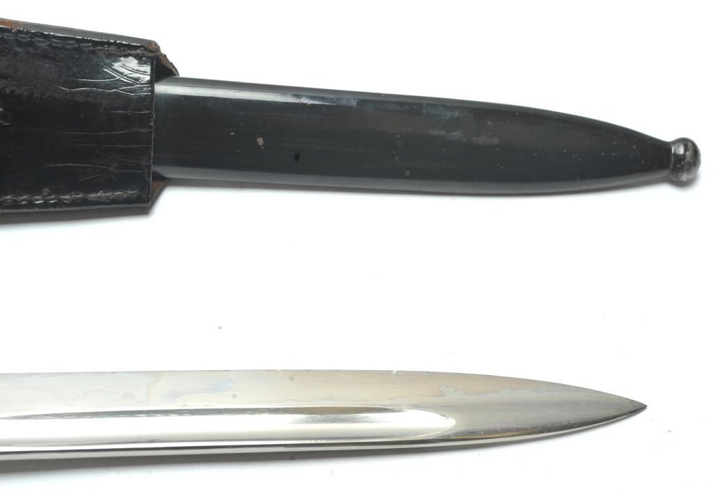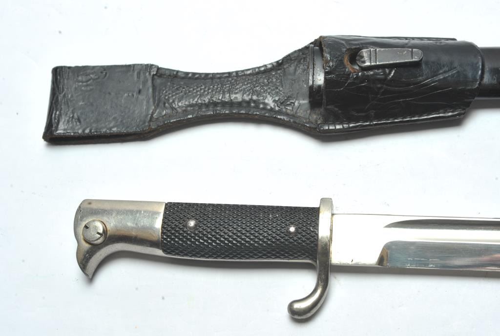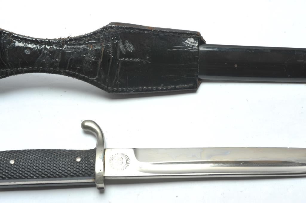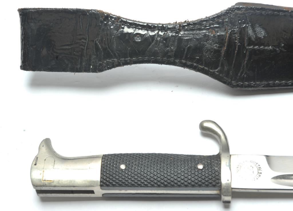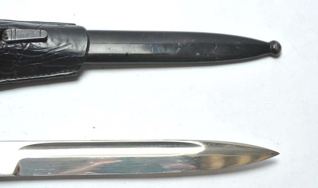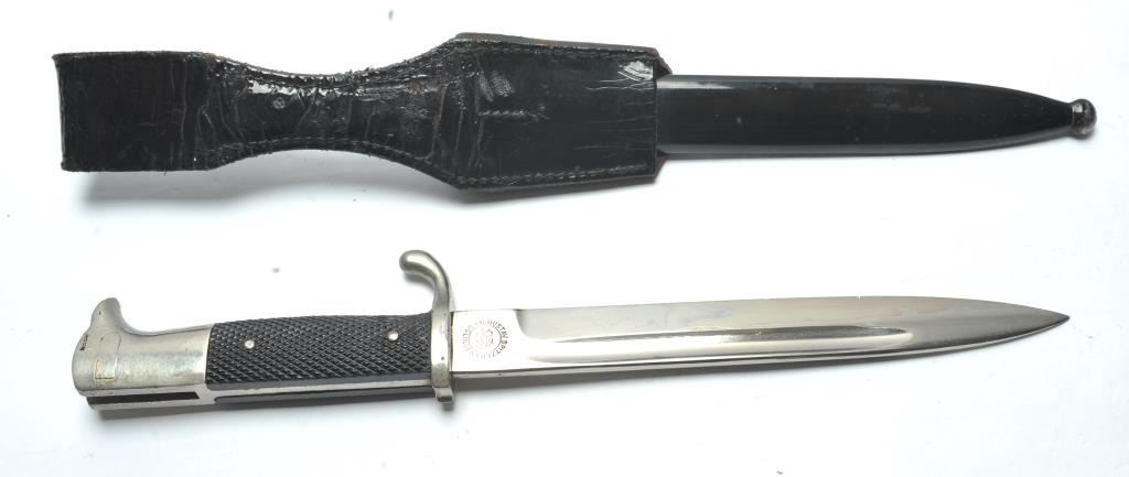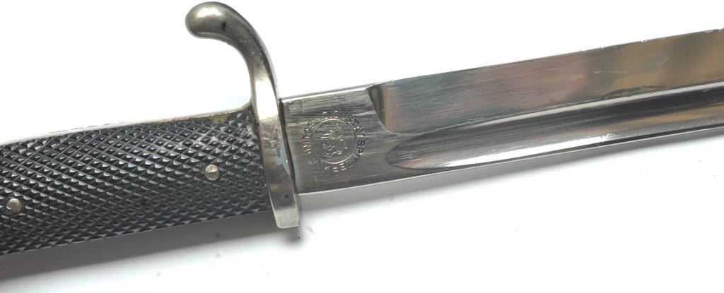 Nazi Era Dress Bayonet marked “Gustav Spitzer Solingen” with lion trademark. 8” pointed and hollow ground with blood grove for piercing. The blade is near fine. Chip from 1 grip scale. Scabbard very good with frog.Est.: $150-$300