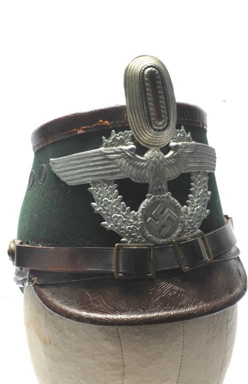 German Nazi Era Police Shako with marked canvas cover. Patent leather aged with cracking but good to very good overall. Eagle plate and pom-pom intact. Chinstrap and lining good with normal age and wear. Est.:$350-$700