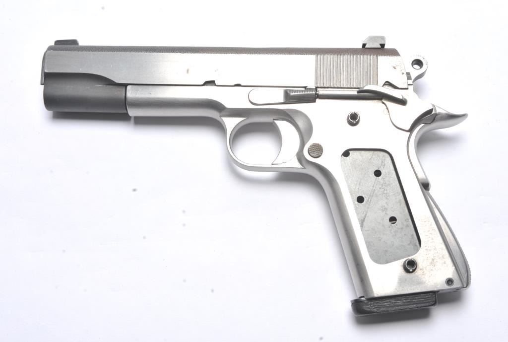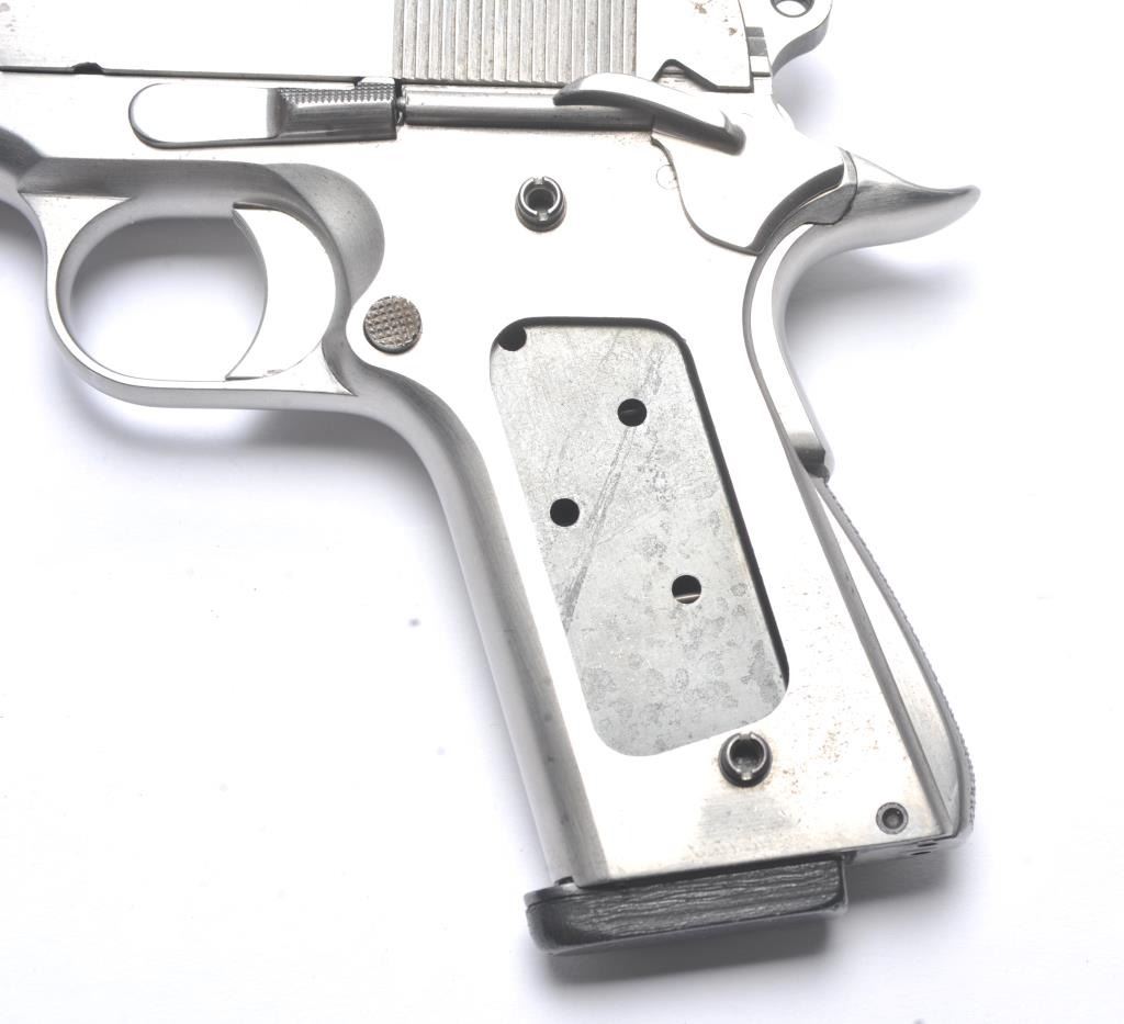 Colt Government Model 1911 pistol sold as parts, Serial #C163124. The pistol is missing the barrel, extractor, guide rod, spring and other miscellaneous internal parts. The frame and slide have beenpolished and the top of the slide is stippled. The frame is import marked. The lot includes one correct magazine. Est.: $350-$700. (C+R/PPT).