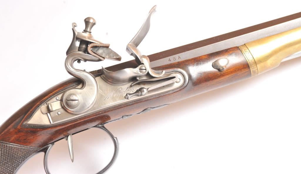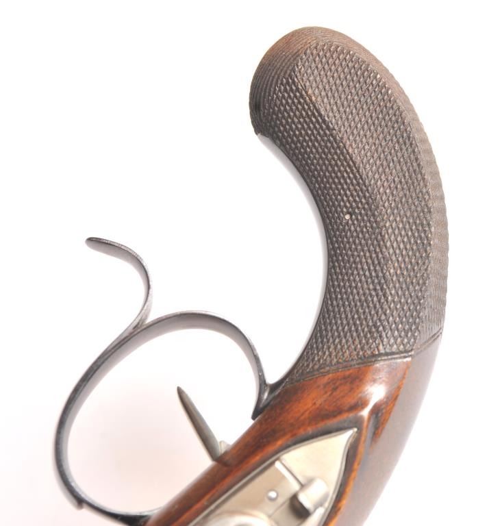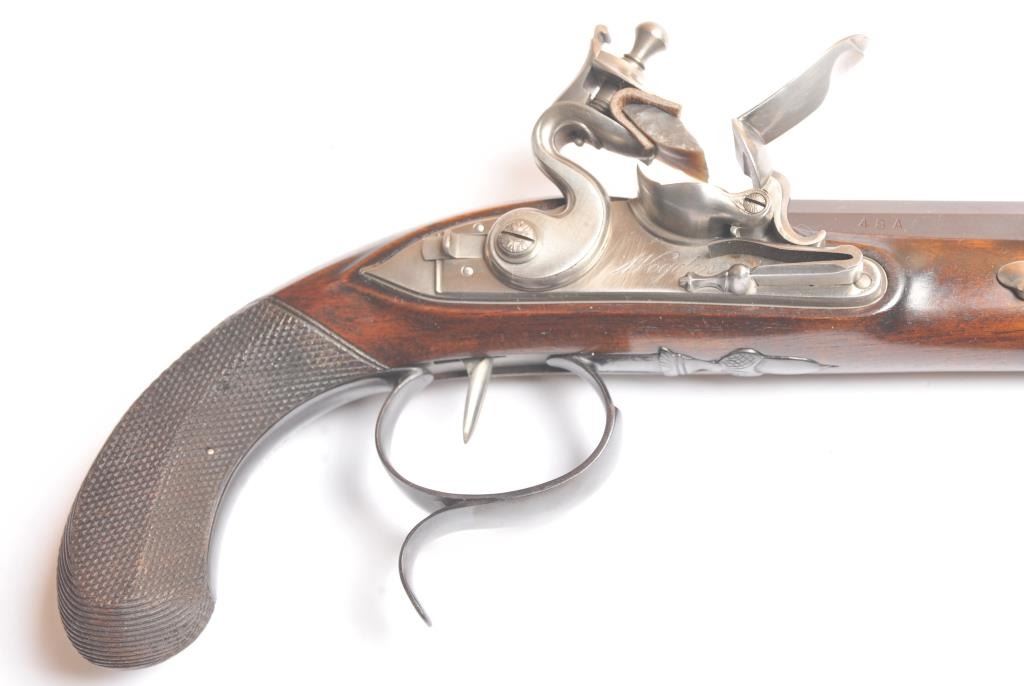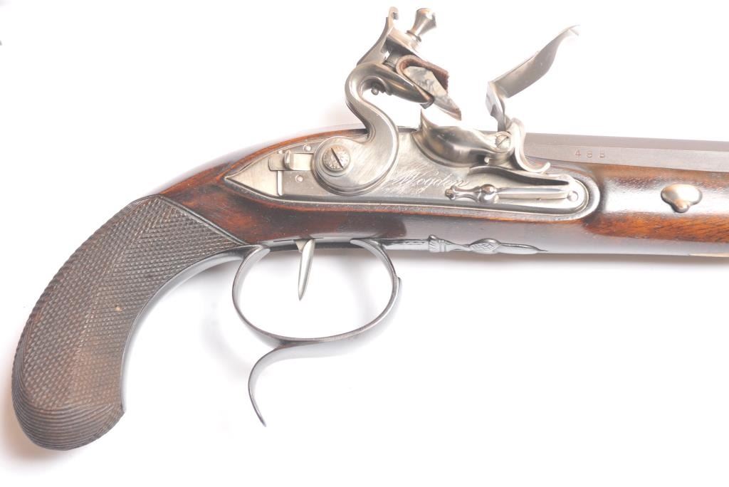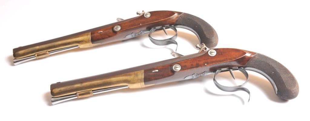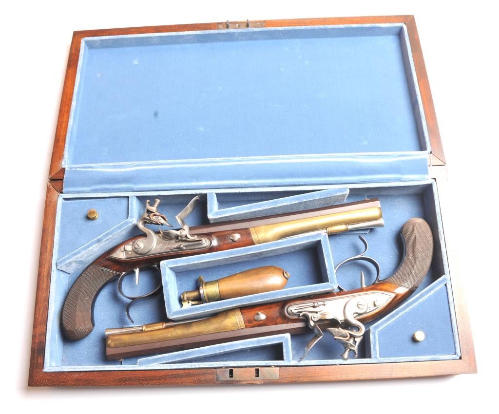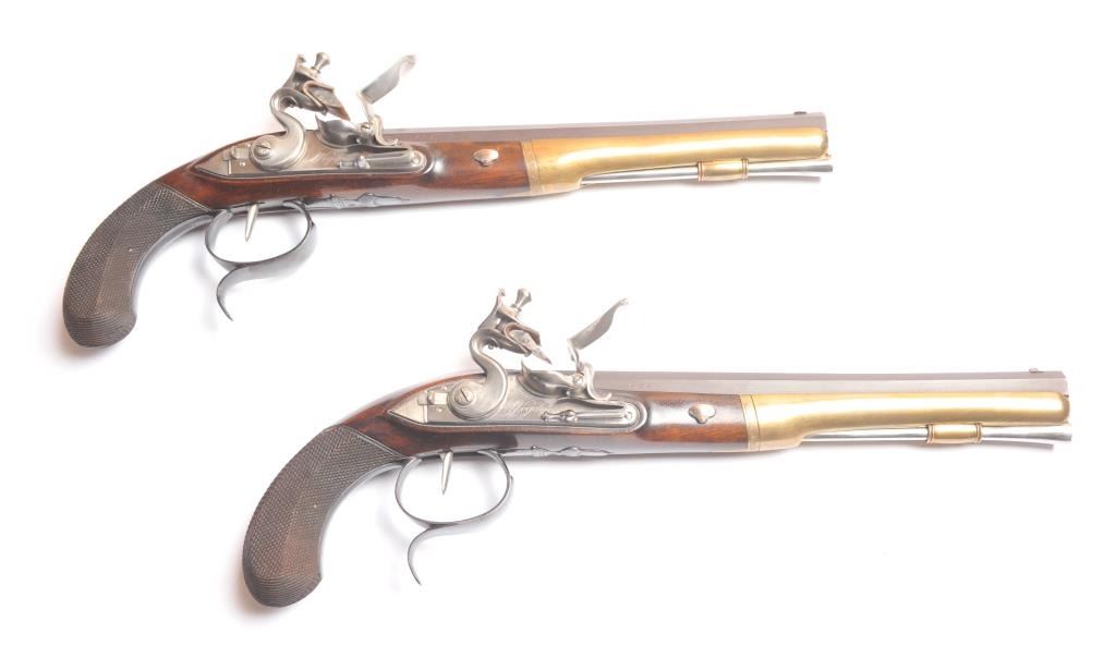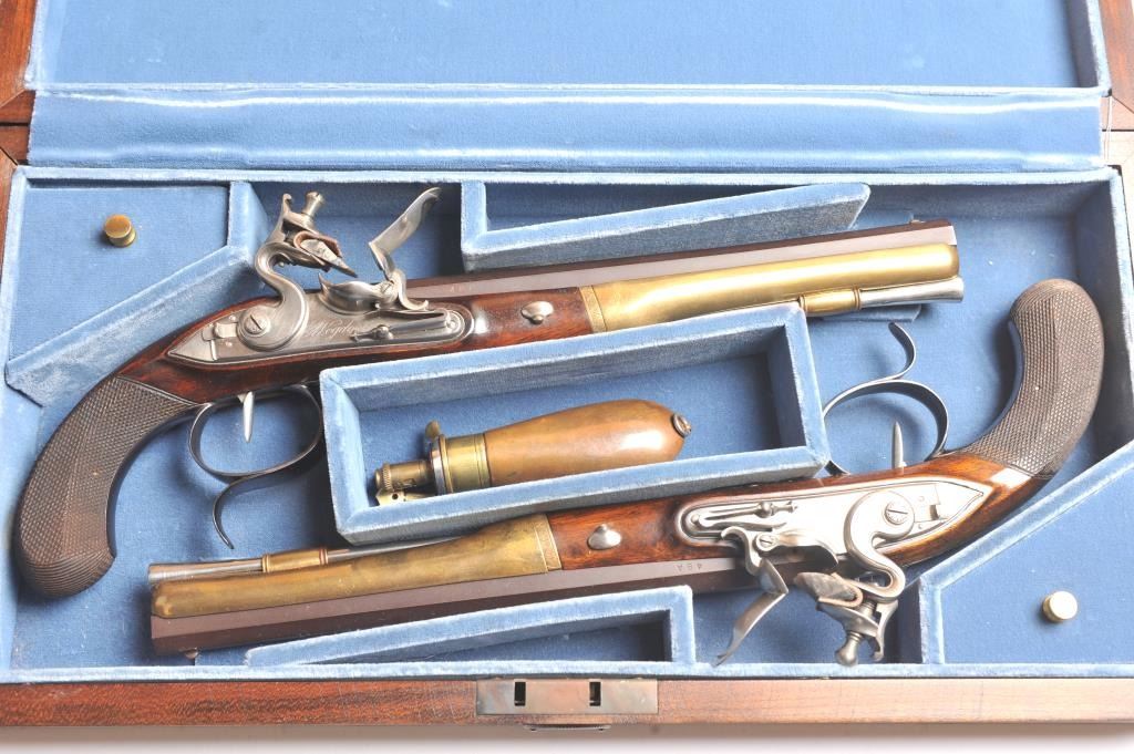 Alexander Hamilton – Aaron Burr cased reproduction flintlock dueling pistols, .54 caliber, by the U.S. Bicentennial Society. The pistols have browned octagon barrels, blued trigger guard, polished steel lockassembly, trigger, pan and frizzen with solid brass fore ends. The grips are hand carved Walnut with fine checkering. These reproduction pistols were crafted by Uberti to represent the pistols used by AlexanderHamilton and Aaron Burr in their famous duel on July 11, 1804. The case is solid American Cherry wood with blue velvet interior, brass hardware and a brass Hawksley marked bag flask. The production was limited to 1,200pairs issued in 1975. The pistols are as new in the box while the case is in nearly excellent condition with light scratches on the top. Est.: $1,250-$2,500.