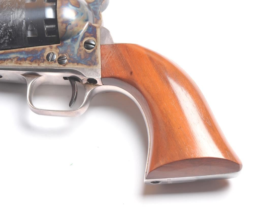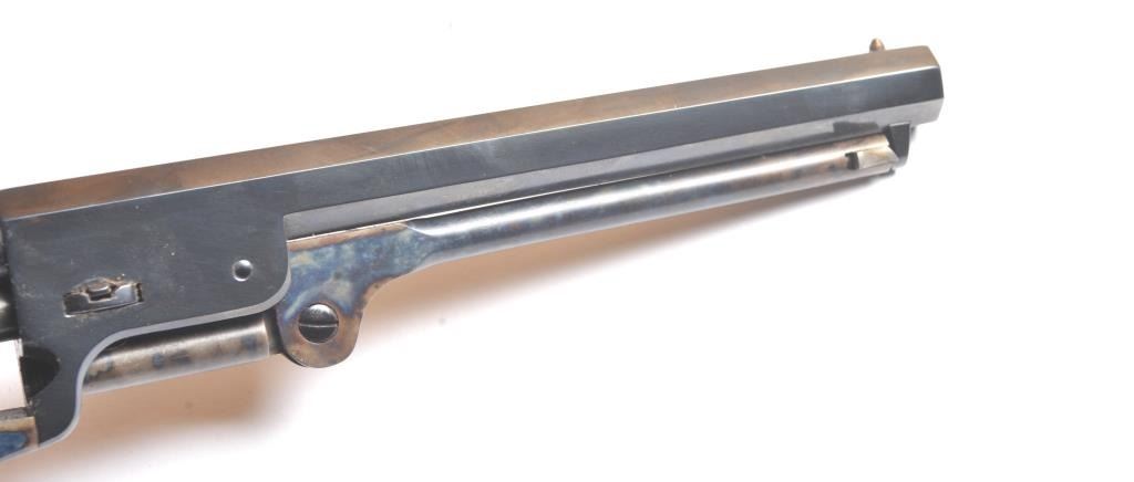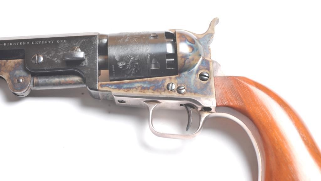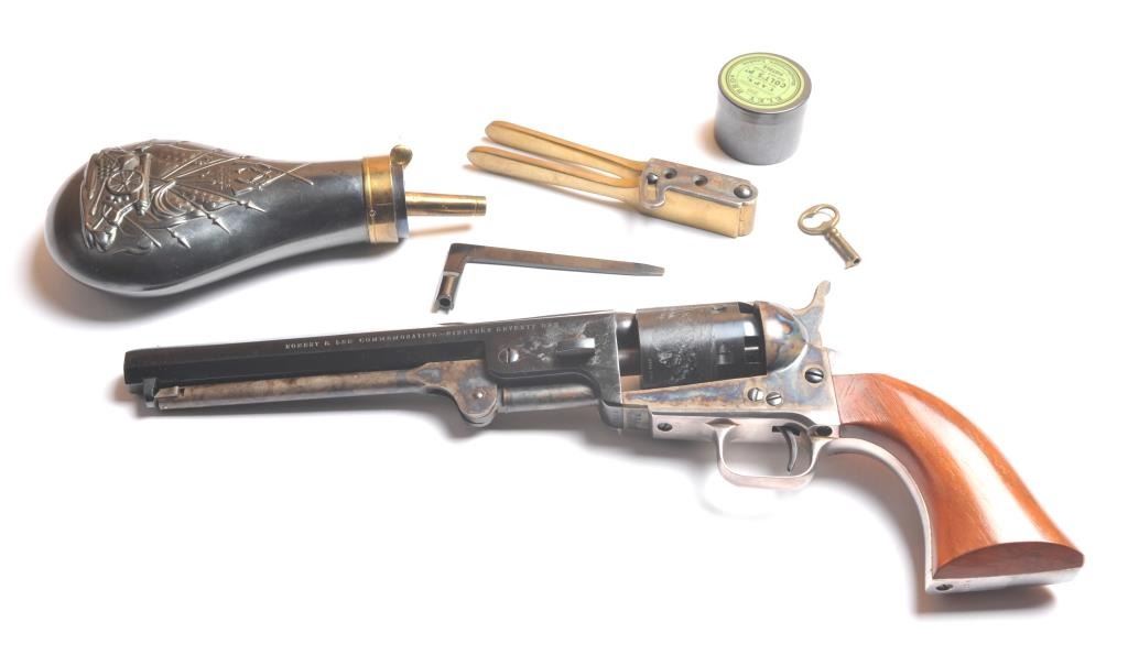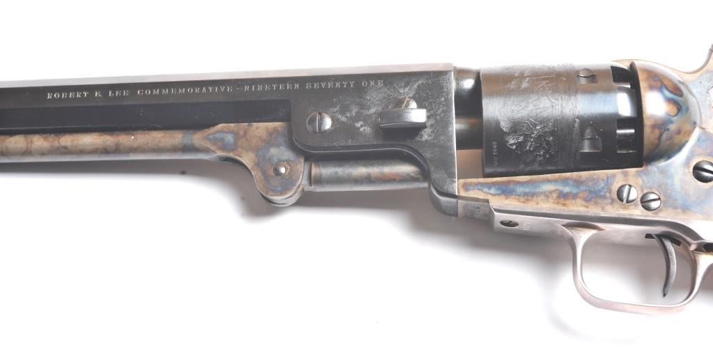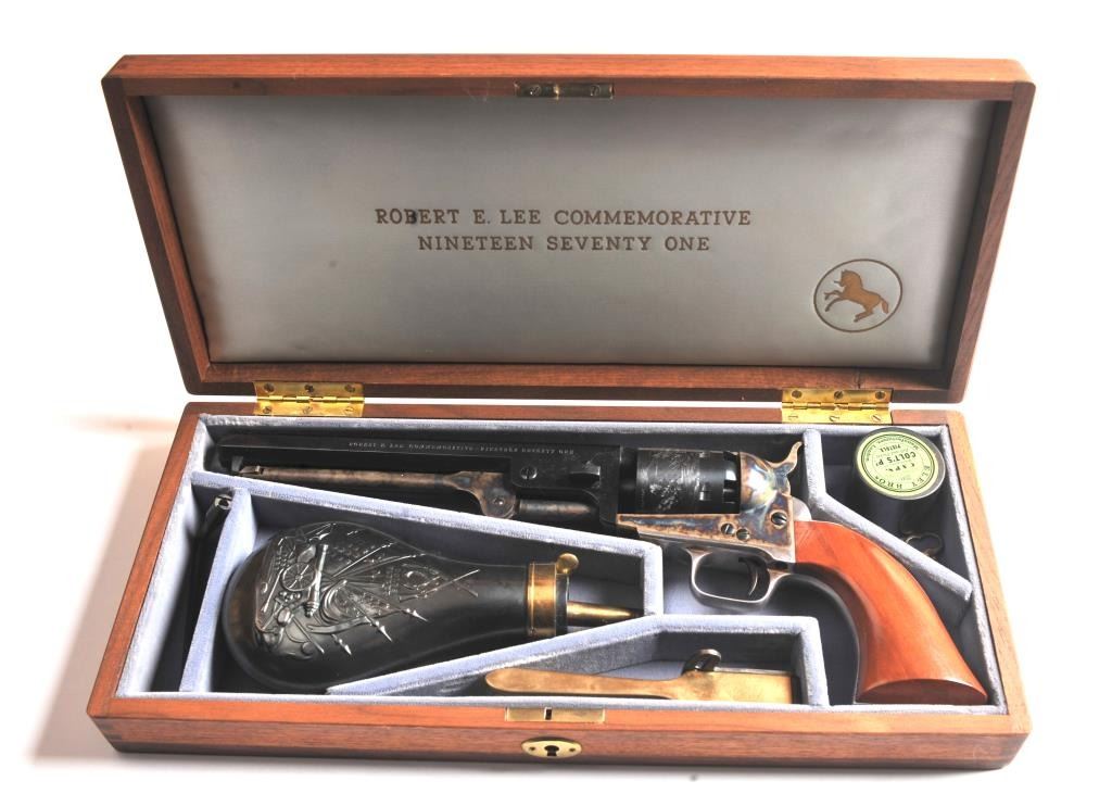 Colt Robert E. Lee Commemorative reproduction 1851 Navy percussion revolver in wooden display case, .36 caliber, Serial #3378REL. The pistol is as new in the box with a 7 ½” octagon barrel. Blue and case hardened withsilver plated straps and trigger guard. The pistol comes in a wooden display case marked, “ROBERT E. LEE COMMEMORATIVE NINETEEN SEVENTY ONE” with a gold tone Colt medallion in the corner. The partition case is linedwith grey velvet and includes; a powder flask, brass bullet mold, cap tin, wrench and key. Est.: $600-$1,200.