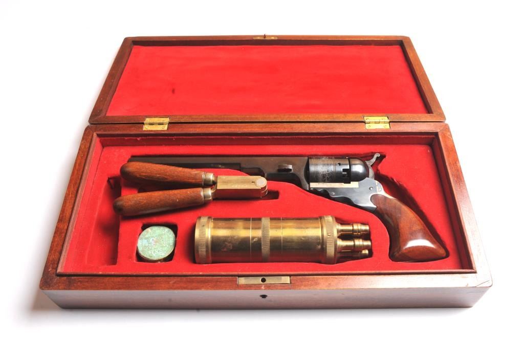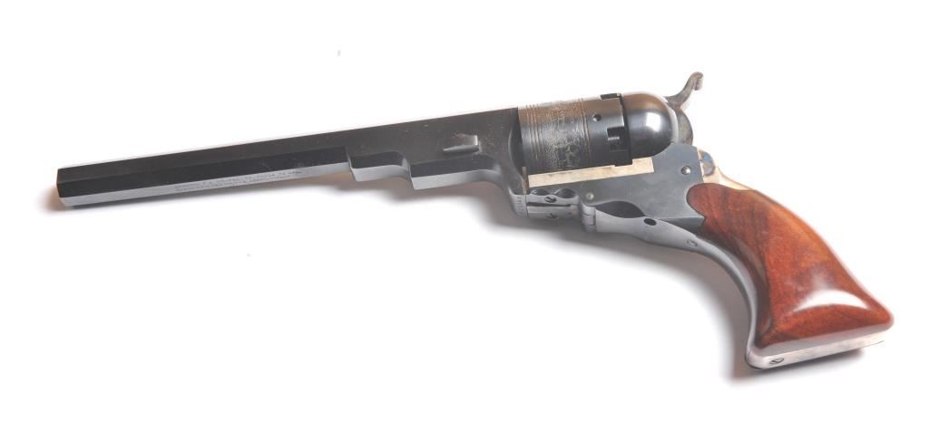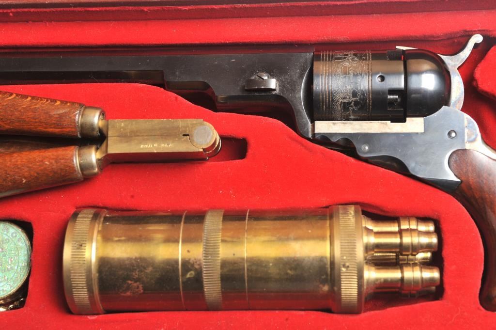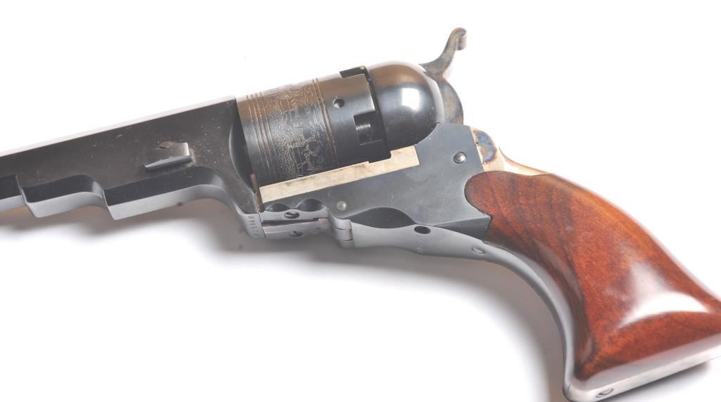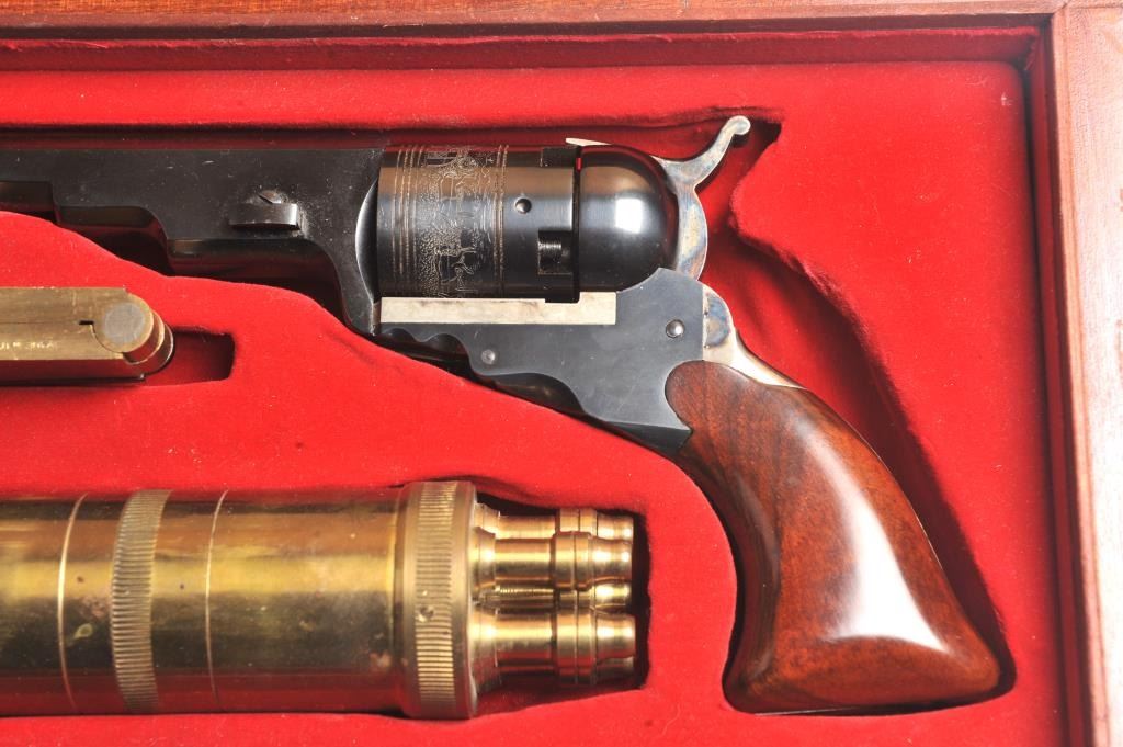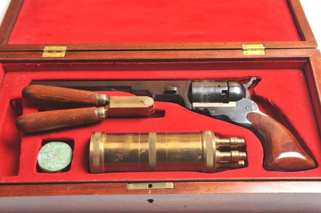 Cimarron by Uberti Reproduction Colt Paterson percussion revolver in wooden partition style display case by Pete Peterson. The pistol is as new in the box with a Colt barrel address. Blue and case hardened withbeautiful smooth wood grips. The pistol is cased in a wooden partition case with red velvet interior including; brass charger, bullet mold and cap tin. The case is in very good condition with light scratches on topand a clean crisp interior. Est.: $700-$1,400.