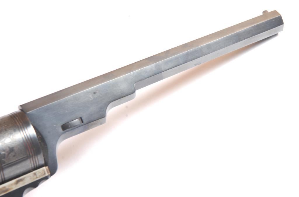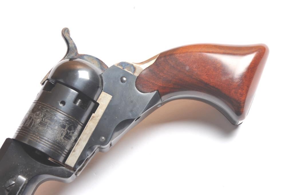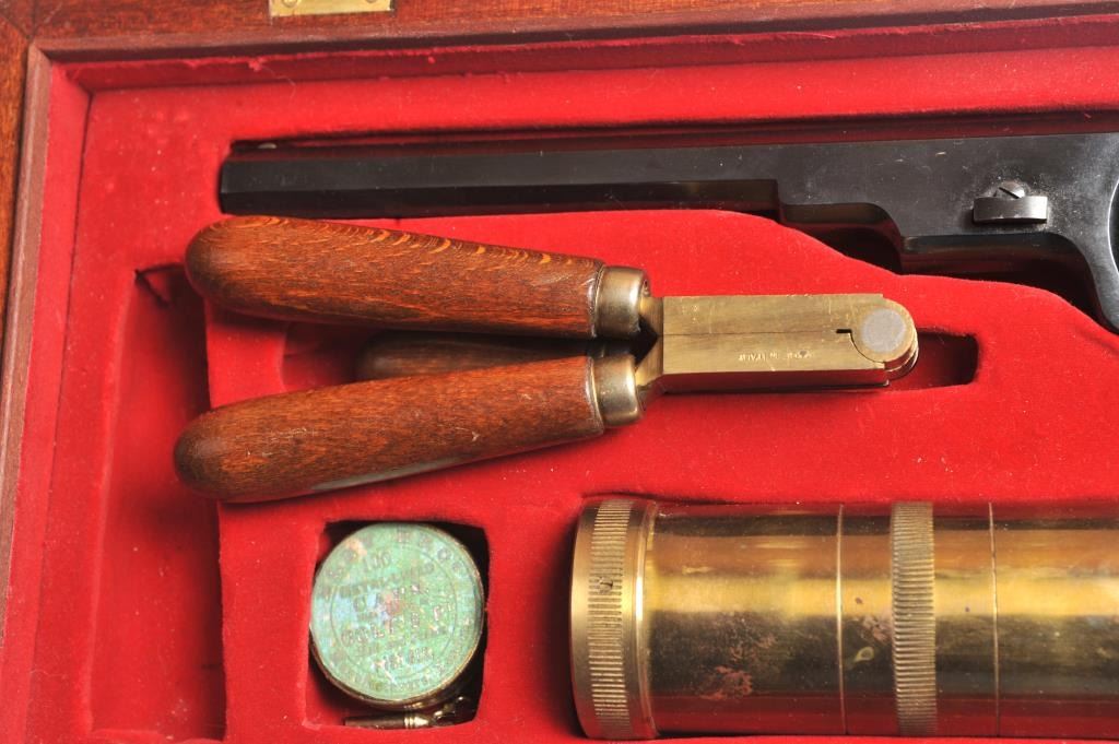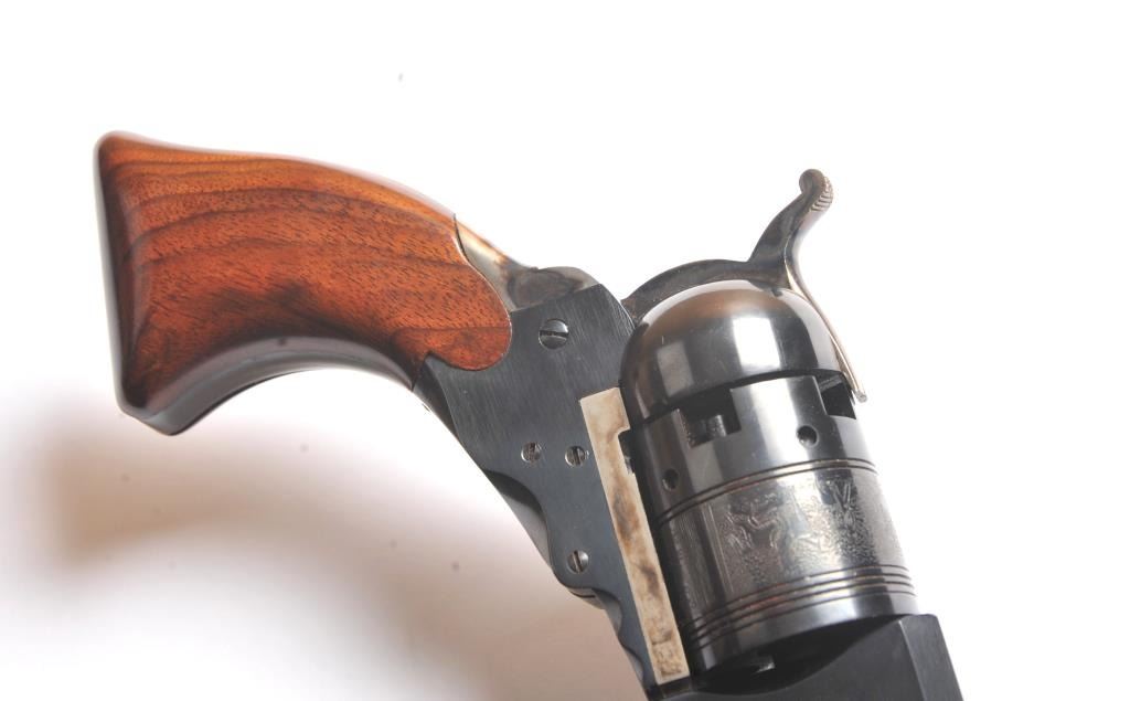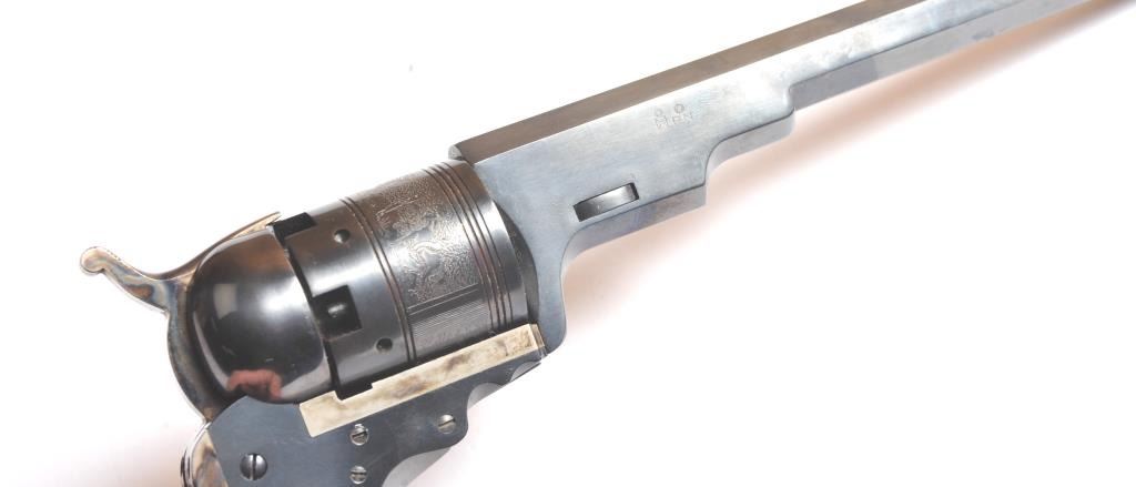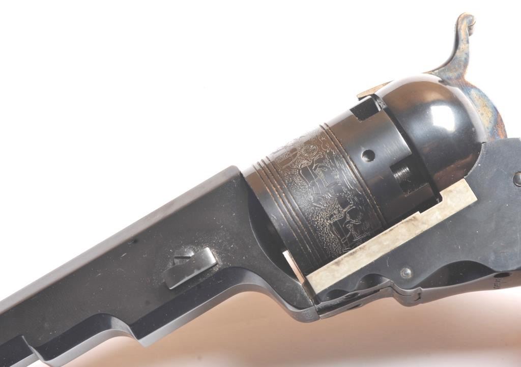 Cimarron by Uberti Reproduction Colt Paterson percussion revolver in wooden partition style display case by Pete Peterson. The pistol is as new in the box with a Colt barrel address. Blue and case hardened withbeautiful smooth wood grips. The pistol is cased in a wooden partition case with red velvet interior including; brass charger, bullet mold and cap tin. The case is in very good condition with light scratches on topand a clean crisp interior. Est.: $700-$1,400.