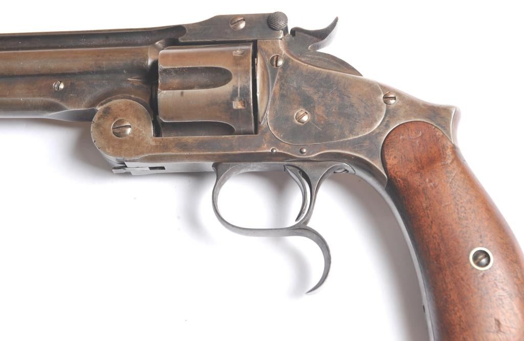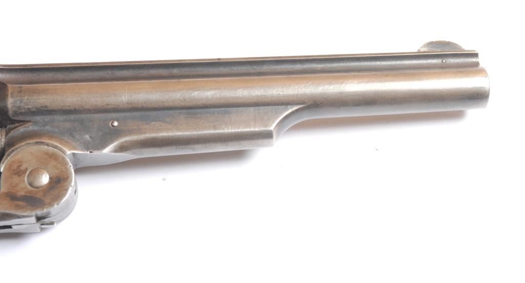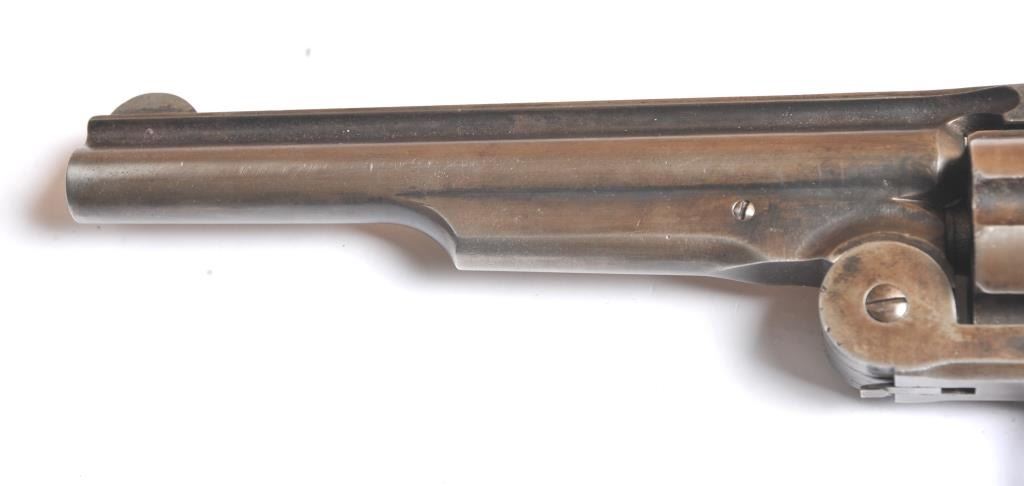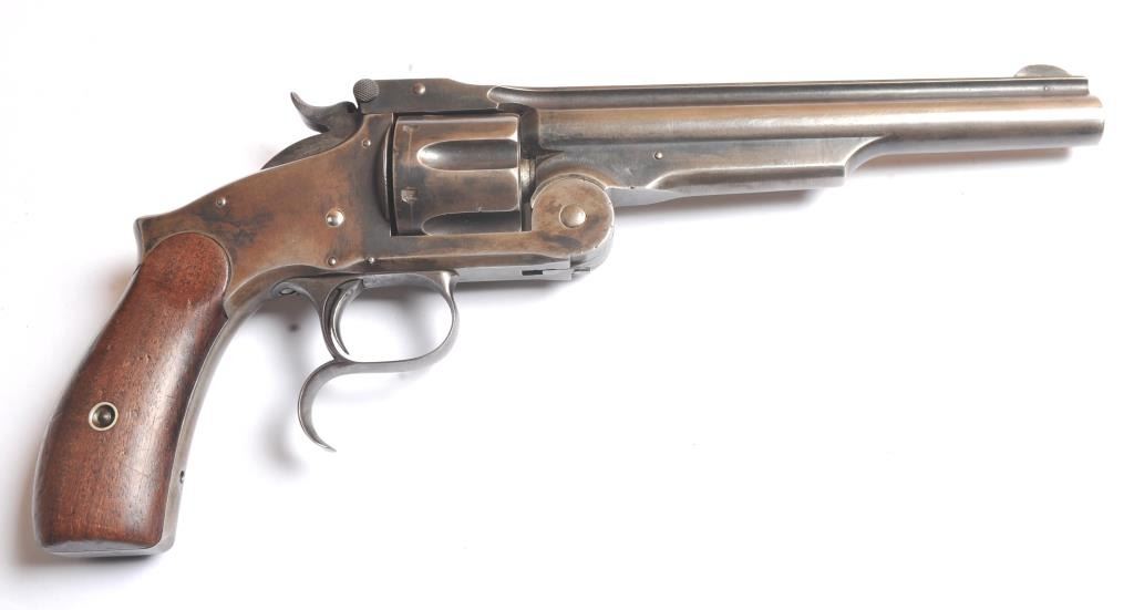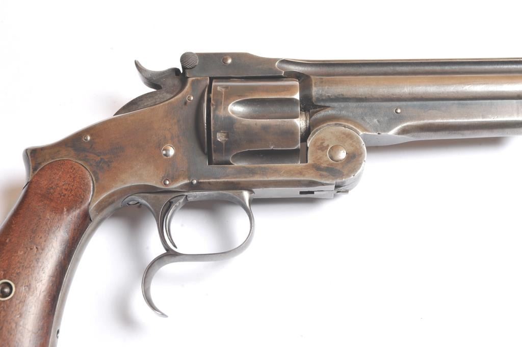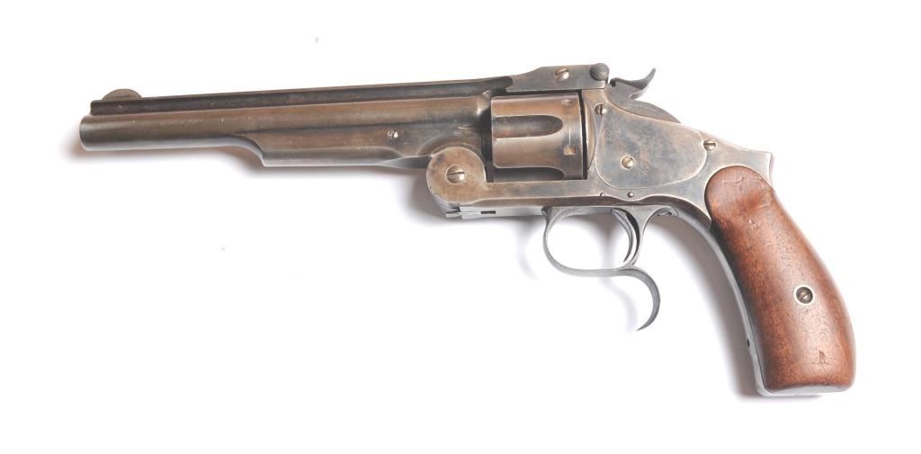 Smith & Wesson Russian 2nd Model SA revolver, .44 Russian caliber, Serial #34855. The pistol is in fine overall condition with a 7” barrel with a solid rib. The pistol retains significant original blue mixing with smooth brown patina. The hammer and trigger show toned case hardening. The trigger guard is the spurred style typical of the model. The smooth wood grips are in very good condition and fit the pistol well. The bore andcylinder both show light to moderate pitting. The action works well and the markings are sharp. Est.: $800-$1,600. (Antique).