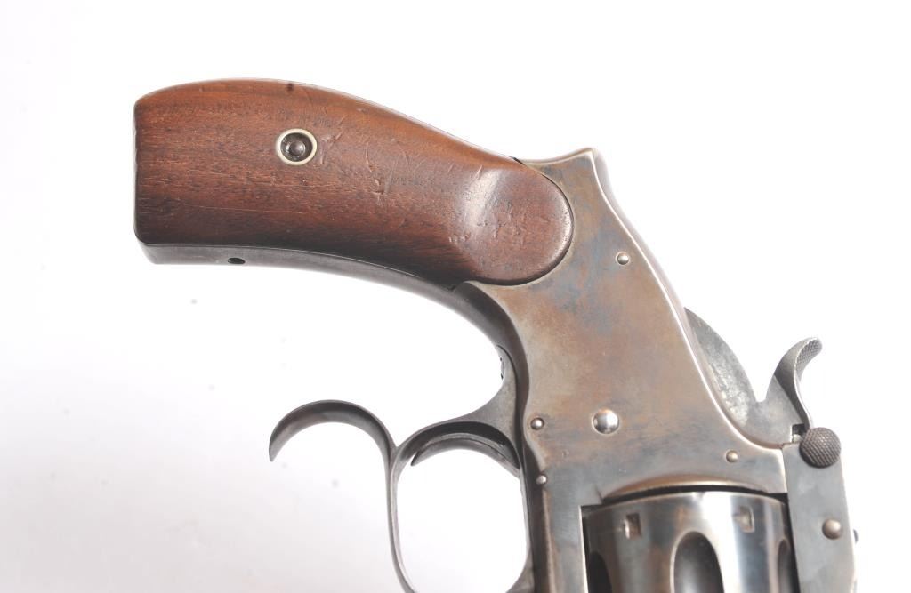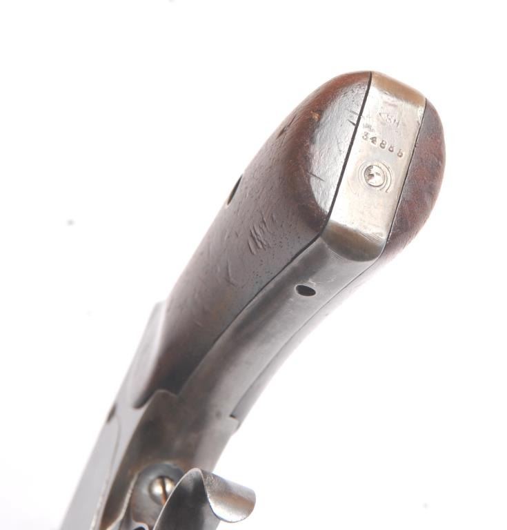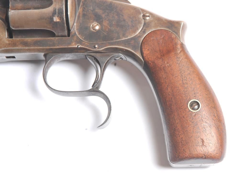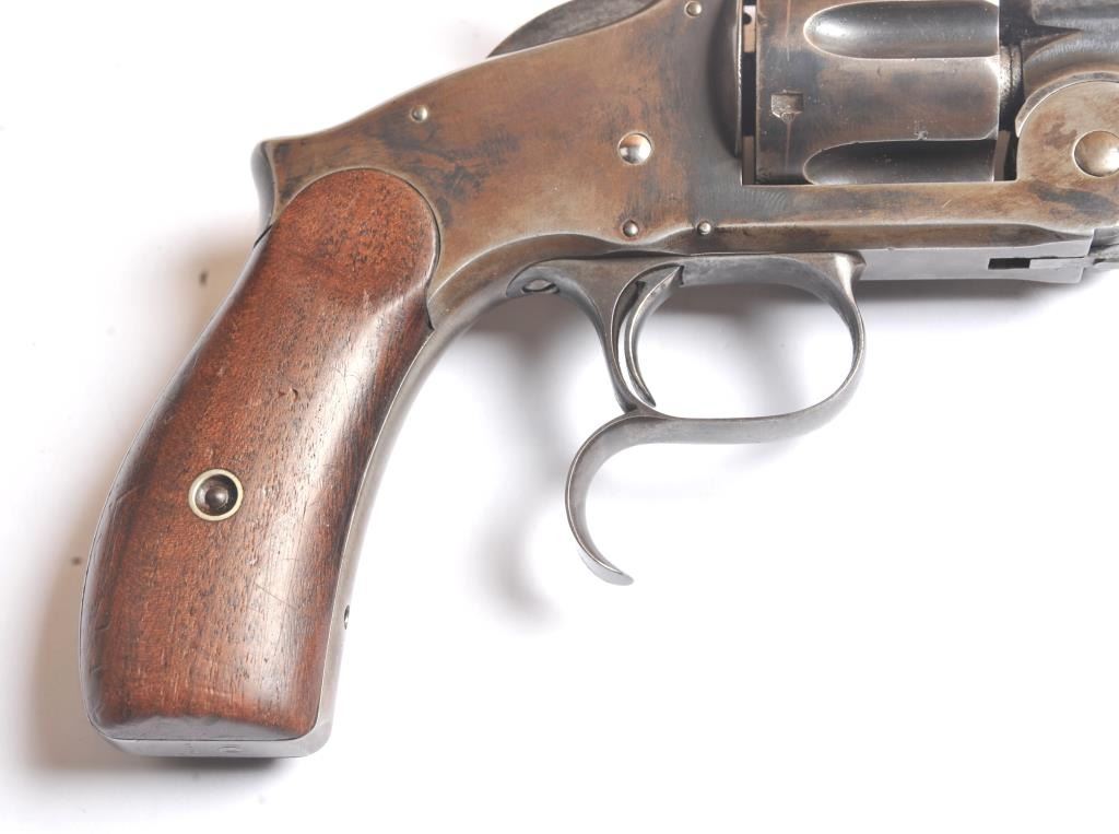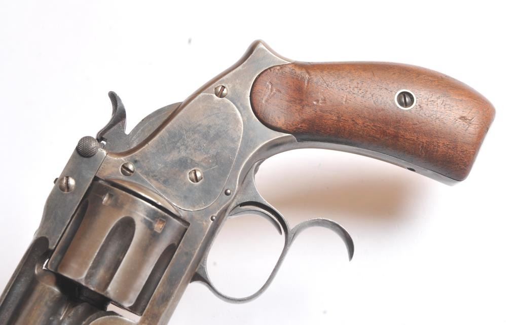Smith & Wesson Russian 2nd Model SA revolver, .44 Russian caliber, Serial #34855. The pistol is in fine overall condition with a 7” barrel with a solid rib. The pistol retains significant original blue mixing with smooth brown patina. The hammer and trigger show toned case hardening. The trigger guard is the spurred style typical of the model. The smooth wood grips are in very good condition and fit the pistol well. The bore andcylinder both show light to moderate pitting. The action works well and the markings are sharp. Est.: $800-$1,600. (Antique).