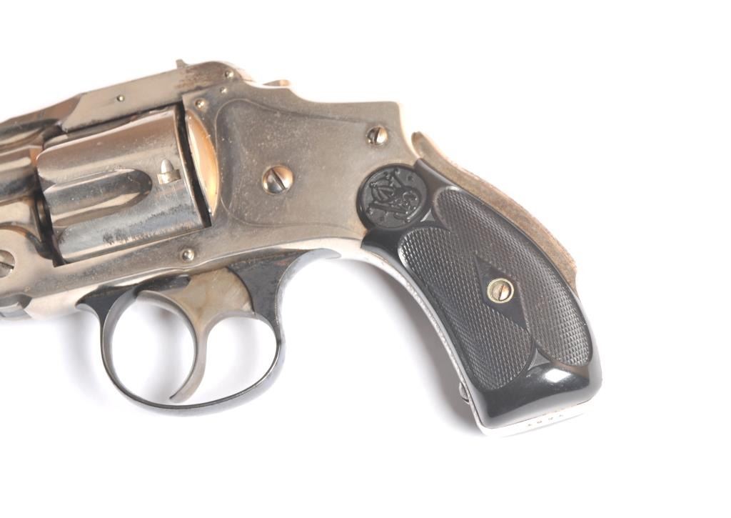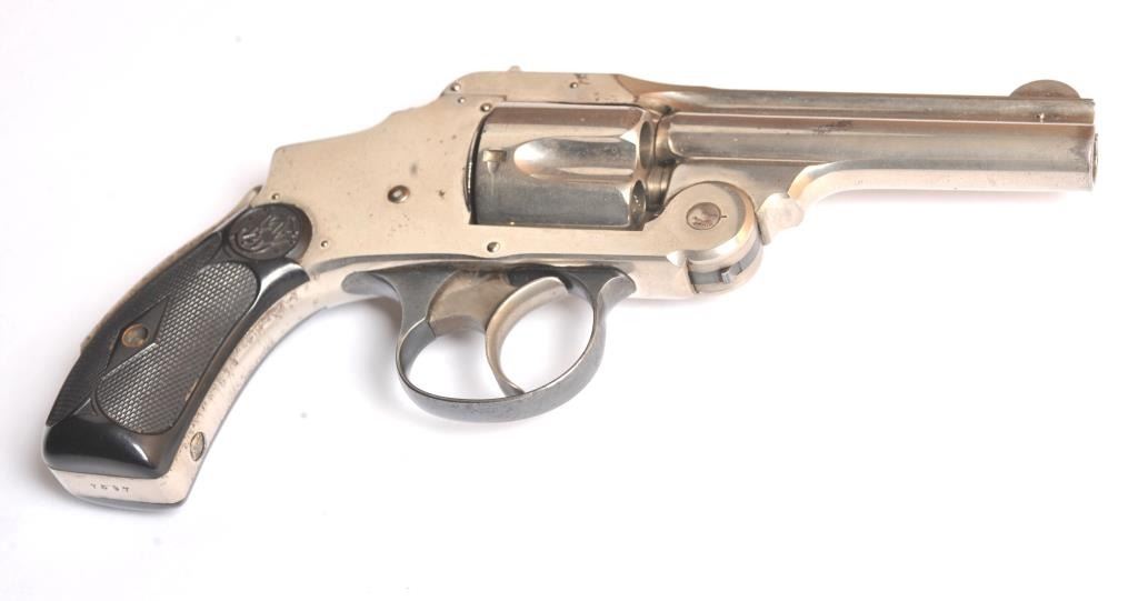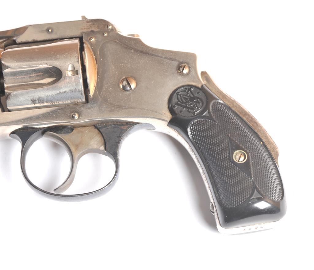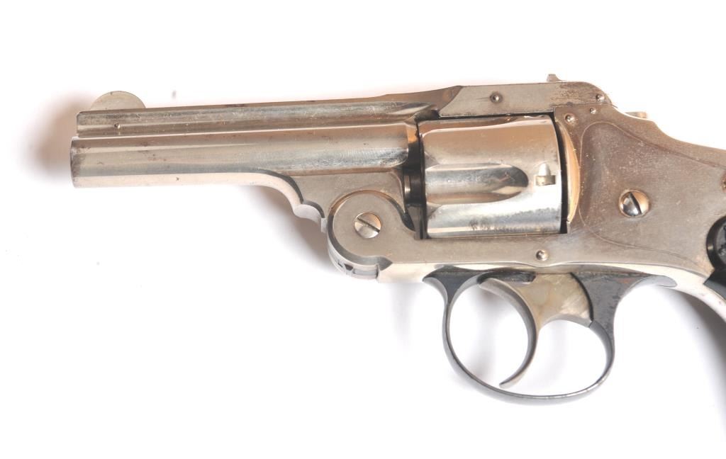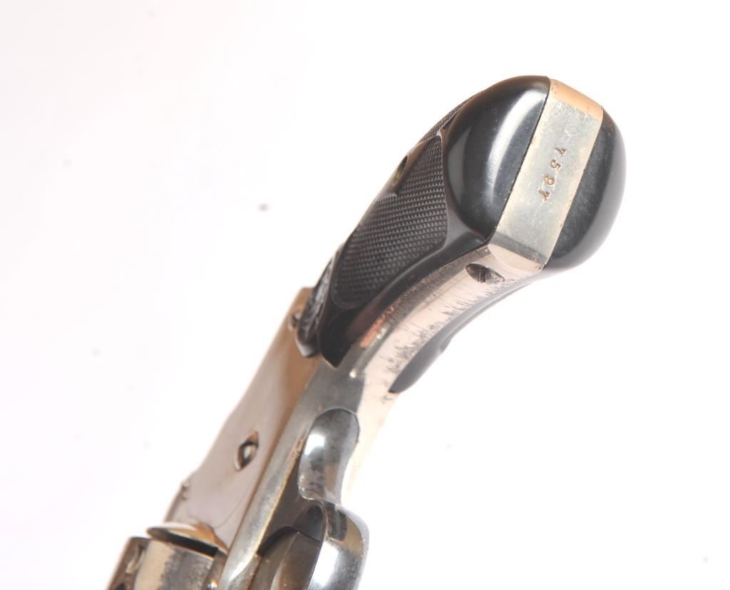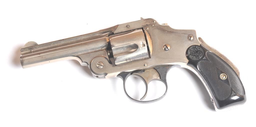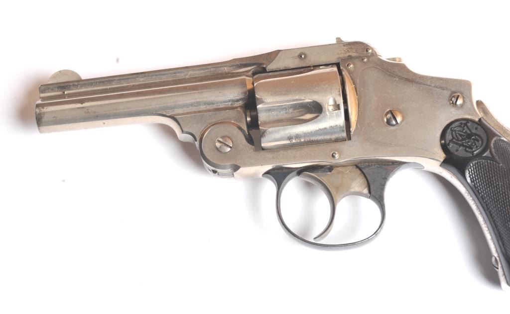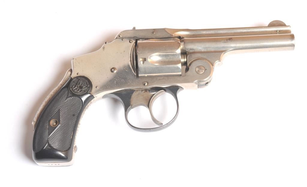 Smith & Wesson Hammerless New Departure Top Break revolver, .38 S&W caliber, Serial #7597. The pistol is in fine overall condition with a 3 ¼” barrel with a two-line address. The pistol retains nearly all ofthe nickel finish with wear at the muzzle and a small amount of light surface erosion. The hammer shows dull case hardening. The checkered hard rubber grips are in very good condition showing little use. The bore isfair, the action works well and the markings are sharp. Est.: $250-$500. (C+R).