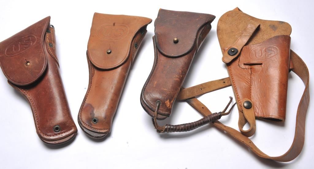 Lot of four U.S. marked leather holsters for 1911 pistols. The lot includes three flap holsters, each with different markings. The 1st is marked, “CRAIGHEAD DENVER U.S.”, the 2nd is marked, “BOYT -42-“, and the third ismarked, “TEX TAN 1944”. The last holster is an open top shoulder rig with leather straps. The holster is marked, “US” on the front and “U.S. BOYT” on the reverse. All four holsters are in good to very good condition. Est.: $150-$300.