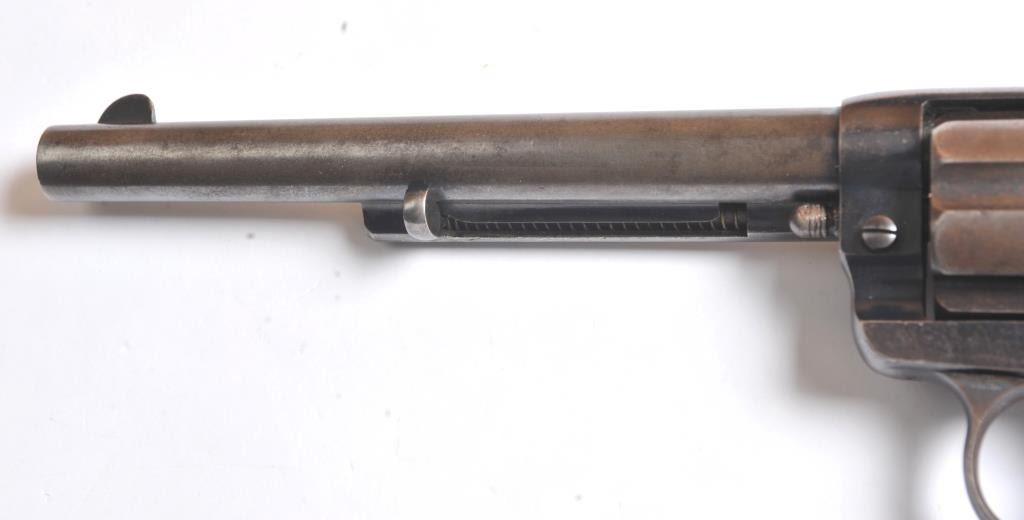 Colt Model 1878 DA revolver, .44-40 caliber, Serial #20842. The pistol is in near fine overall condition with a 7 ½” etched barrel. The acid etched panel is still clearly visible, reading “Colt Frontier Six Shooter”with a full height front sight. The pistol retains approximately 50-60% of the muted blue finish, primarily on the frame and extractor housing with the barrel showing grey patina. The trigger and back side ofthe hammer show vivid niter blue finish. The checkered rubber grips are in very good condition with the lanyard loop retained. The bore is bright, the action is crisp and the markings are sharp on this nice Colt DAcirca 1887. Est.: $1,400-$2,800. (Antique).