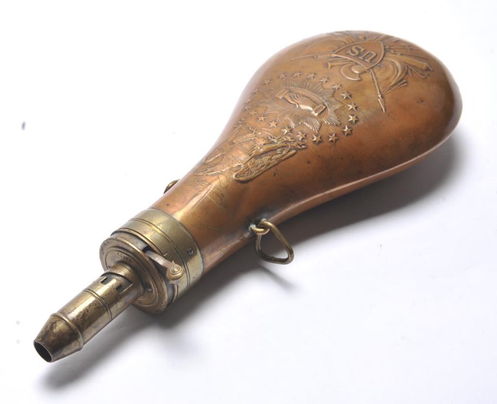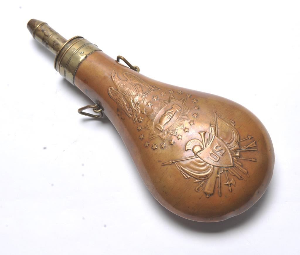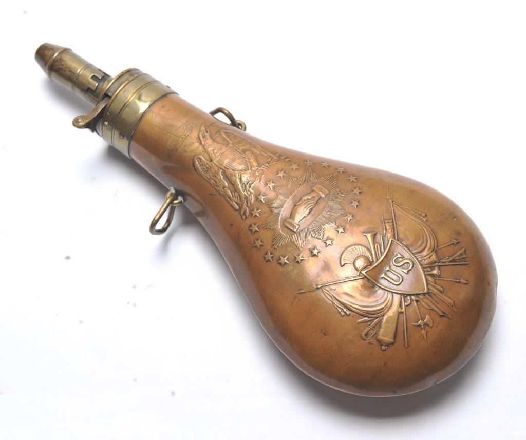 Batty, 1848 dated Peace flask in very good overall condition. The body is free of dings with tight seams and a wonderful patina. The raised design is sharp, consisting of a spread wing eagle above a circle of 26 stars, in the center a pair of hands shake at the center of a starburst. Under the stars is a US shield with flags, crossed cannons and helmet. The adjustable brass spout and cap are in good condition. The top of the capreads, “BATTY 1848” with “JAG” on the top and “G” acceptance marks on the collar. The two triangular sling keepers are both intact and in good shape. Est.: $300-$600.