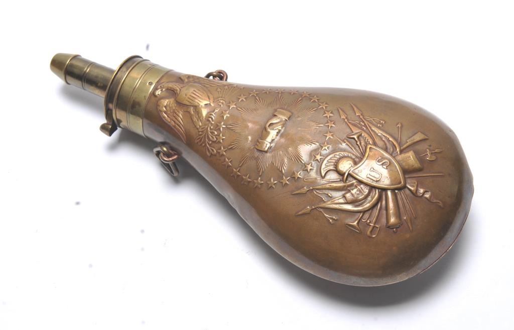 R. Dingee, New York 1833 dated Peace flask in very good overall condition. The body is free of dings other than at the left base. The seams are good except for a small section on one side. The raised design is sharp,consisting of a spread wing eagle above a circle of 26 stars, in the center a pair of hands shake at the center of a starburst. Under the stars is a US shield with flags, crossed cannons and helmet. The adjustablebrass spout and cap are in good condition. The top of the cap reads, “R. DINGEE NEW YORK 1833”. The two triangular sling keepers are both intact and in good shape. Est.: $300-600