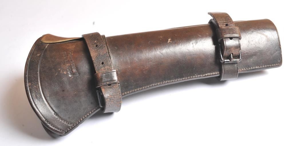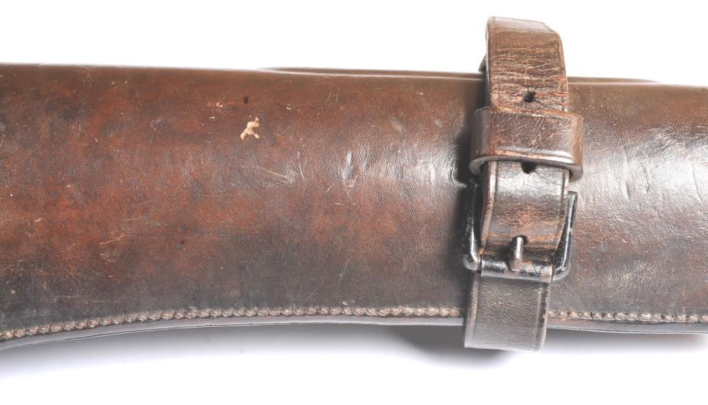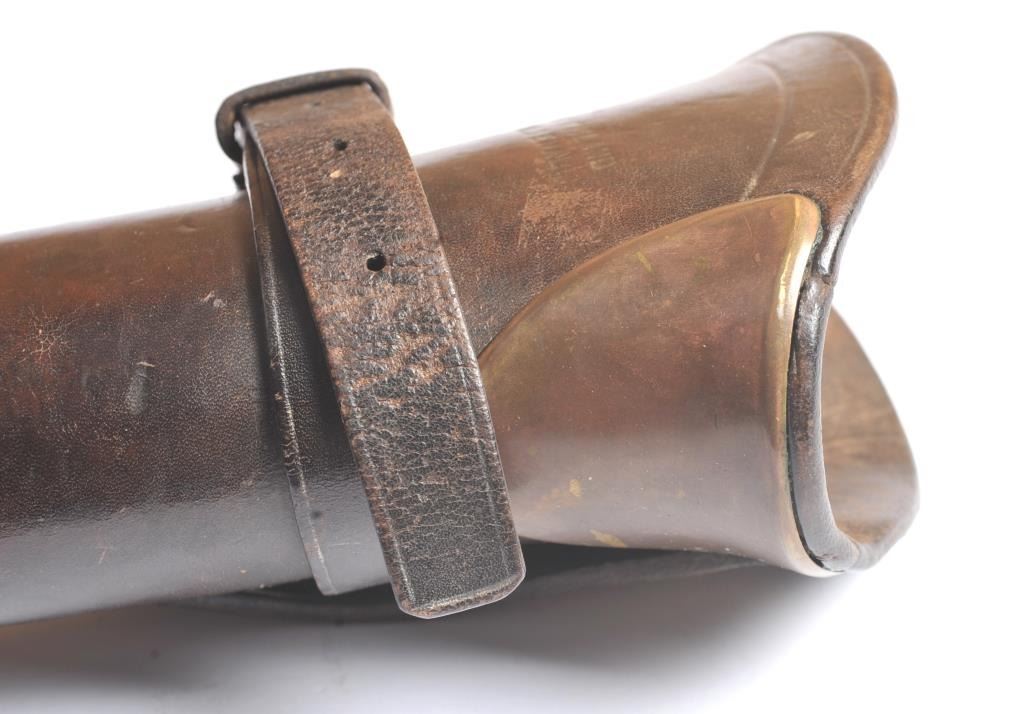 Vintage leather Model 1887 Cavalry carbine boot designed to be attached to the McClellan saddle with brass hardware marked, “ROCK ISLAND ARSENAL” with original straps intact in fine overall condition with a “GHB” proofat the muzzle end. Est.: $250-$500.